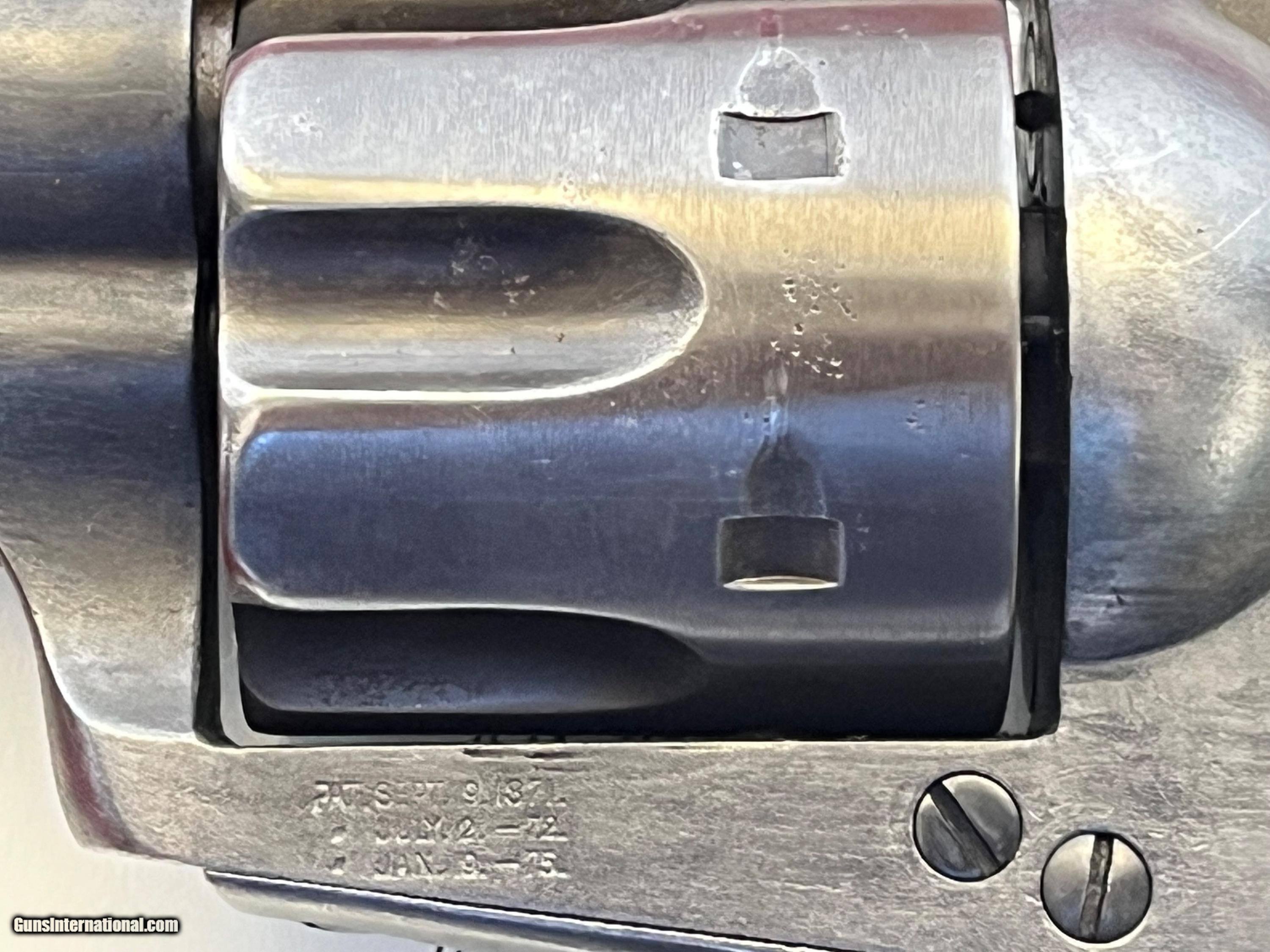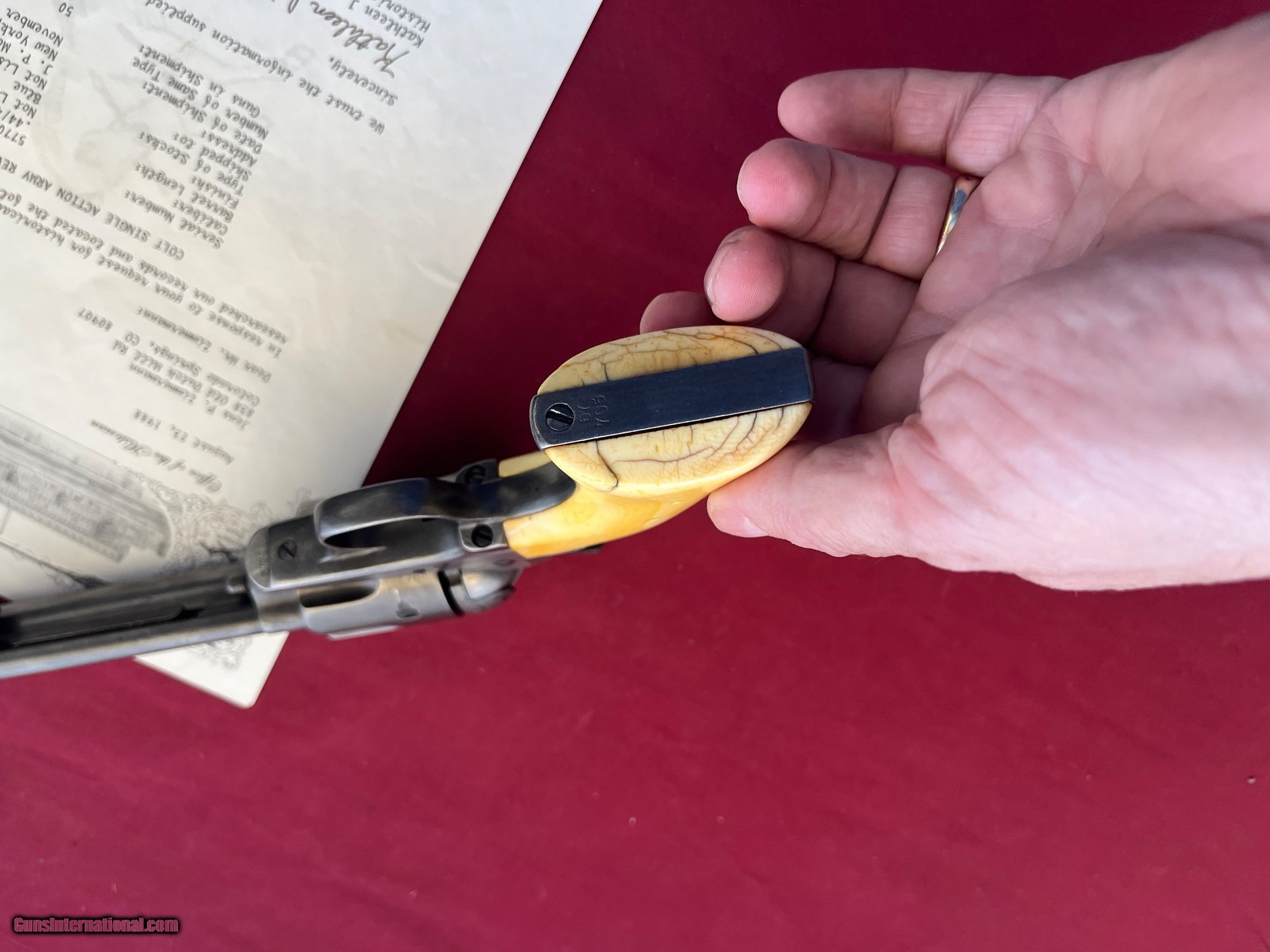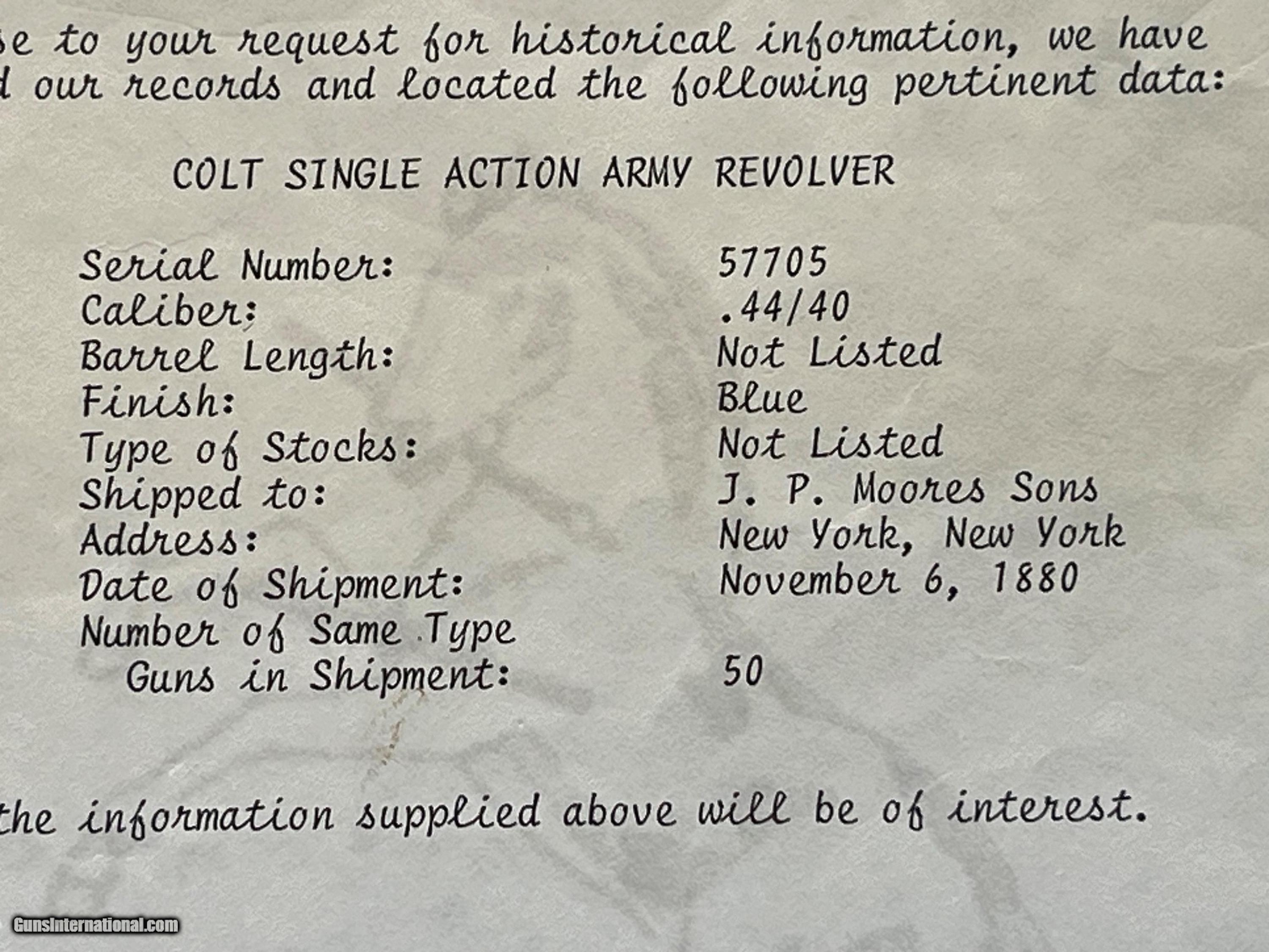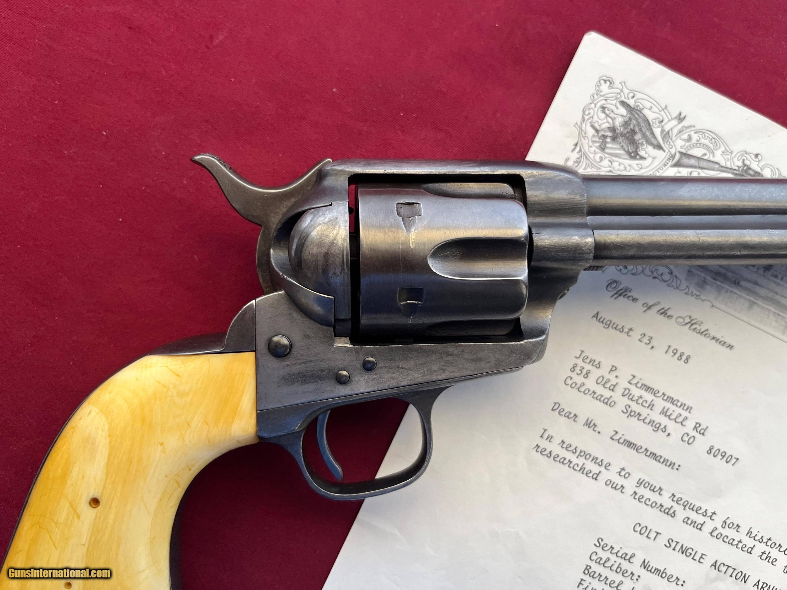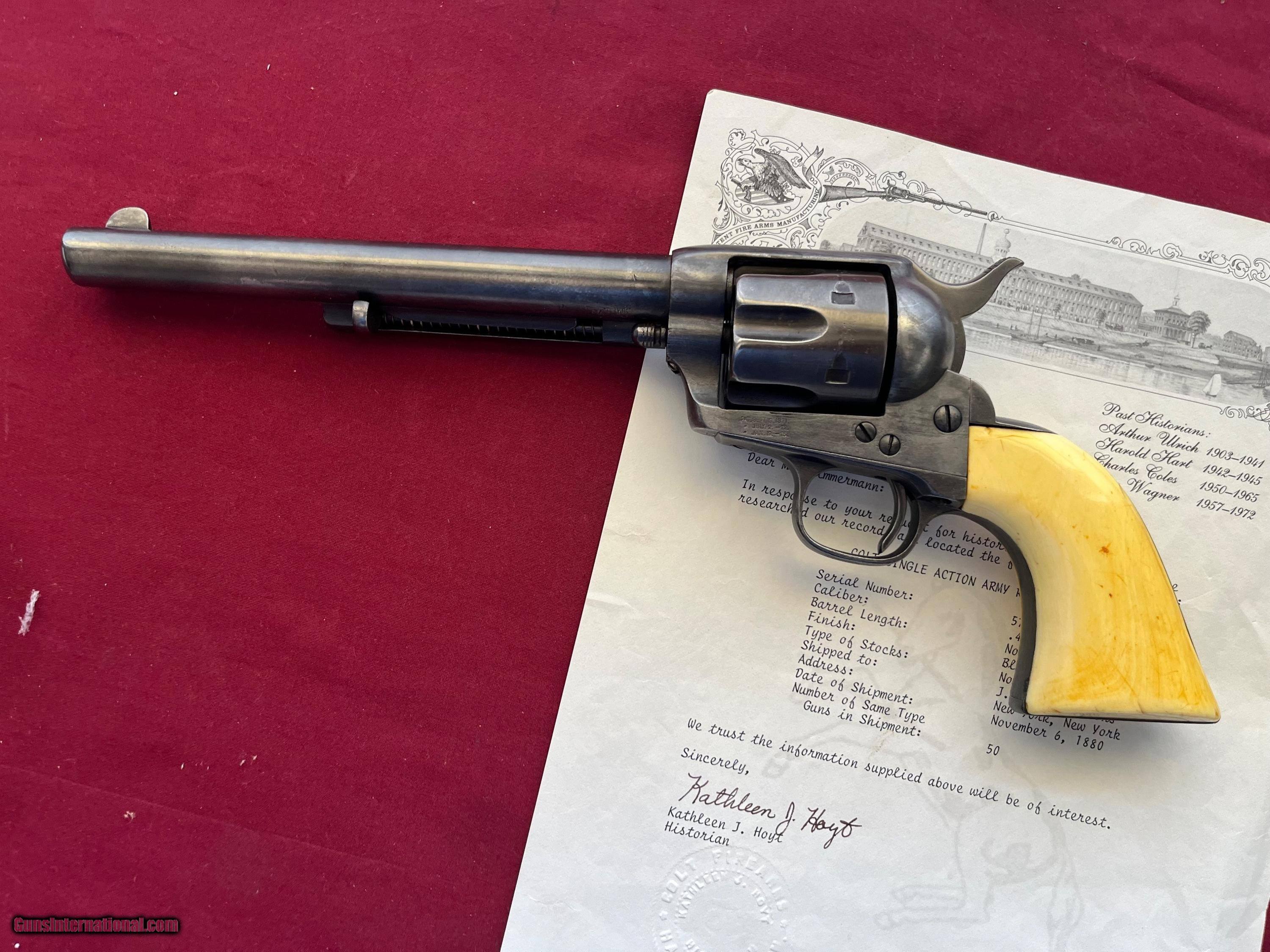 Description: ANTIQUE MADE IN 1880. COLT SINGLE ACTION ARMY REVOLVER ETCHED PANNEL " FRONTIER SIX SHOOTER 44-40" IVORY GRIPS. SER# 57705 SHIPPED FORM THE WAREHOUSE NOV, 6TH 1880. 7 1/2" BARREL WITH A DESCENT SHOOTABLE BORE SHOWING GOOD RIFLING AND FROSTY GROOVES. COMES WITH IVORY GRIPS WITH A CHIP REPAIR GLUED BACK IN . ETCHED PANNEL IS TYPICAL WEAK BUT LEGIBLE. I BELEIVE THE METAL HAS SOME BLUE TOUCH UP FROM YEAR AGO ESPECIALLY ON THE FRAME. ACTION WORKS AND FINCTIONS FINE WITH ALL FOUR CLICKS. COMES WITH A COLT LETTER. EASTERN BRANCH FIREARMS ADD 40.00 SHIPPING – NEXT DAY AIR SHIPPING ADD 50.00 SHIPPING – LONG GUNS GROUND OPTIONAL INSURANCE IS AVAILABLE AT 1.25 PER 100.00 Questions e-mail or call Glen at Eastern Branch Firearms 207-215-5021 TERMS – PLEASE READ BEFORE I DO NOT HAVE A LAYAWAY OPTION ( WE ACCEPT CREDIT CARDS ) -- I GET ALOT OF REQUEST FOR TRADES, I WOULD PERFER NOT TO DO TRADES ON MY INTERNET LISTINGS PAYMENT OPTIONS- We accept money orders, cashier’s checks , bank checks. sorry no personal checks. We accept all major credit cards please add 3% to the ’s cash discount price.(Shipping within the state of Florida - Florida Residents must pay sales tax) .Handguns and long guns do need to be shipped separate. PLEASE do not send payment via FED EX . USPS & UPS are fine. Thank you. We include a signed copy of our FFL with each firearm shipped. SAFTY NOTICE- Buyer is solely responsible for determining that a used gun is safe to shoot. The firearms offered have not been test fired but have been given a visual inspection only for purposes. It is a requirement that every used firearm is inspected by a qualified gunsmith before firing. By , the buyer agrees to hold seller harmless against damages, injury, or death caused by defective merchandise. RETURN POLICY- All firearms come with a 3-day non firing , non messing with ( turning srews ,taking apart,removing parts, scoping. firing, cleaning or messing with in anyway) inspection/return privilege.Inspection is based on a visual review of the gun to confirm the gun is in the condition stated. In the case of a return, buyer pays all shipping charges & if paid for with a credit card buyer absorbs the 3% credit card charges . So please ask questions BEFORE you bid. Thanks for Looking and Good Luck!! U.S. sales only, no exports…this includes antiques. I will ship to third party for exporting SOLD Antique: Yes |