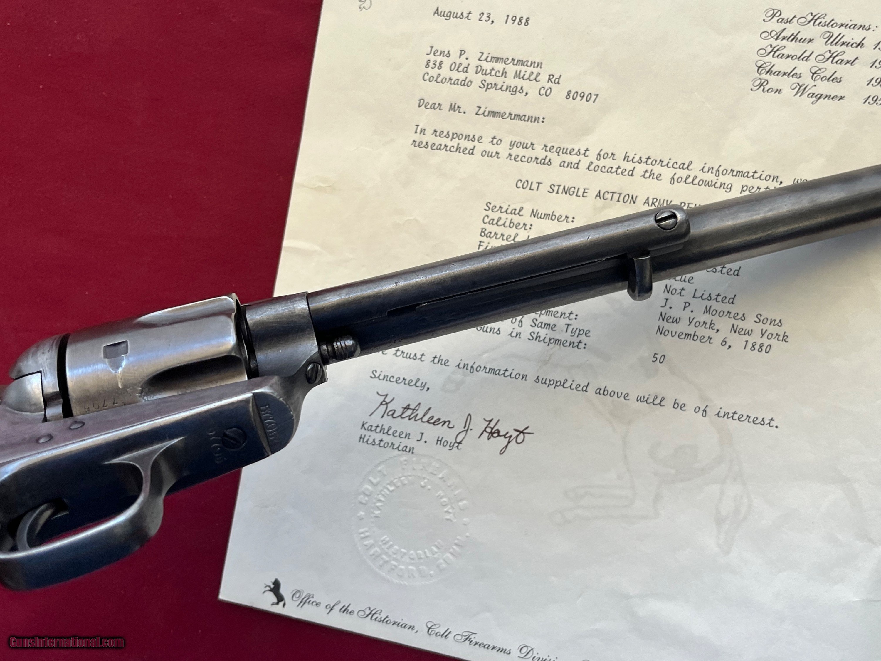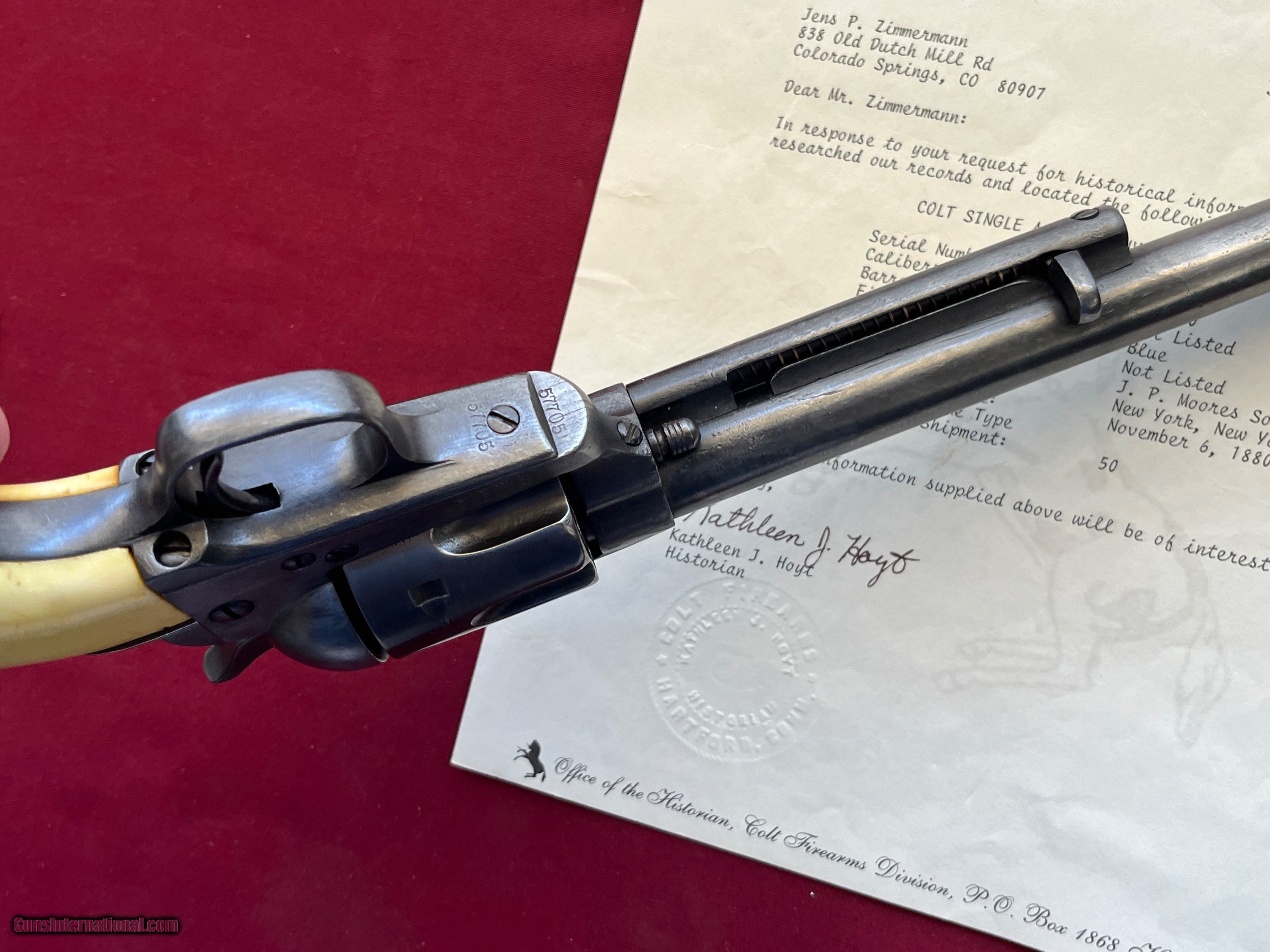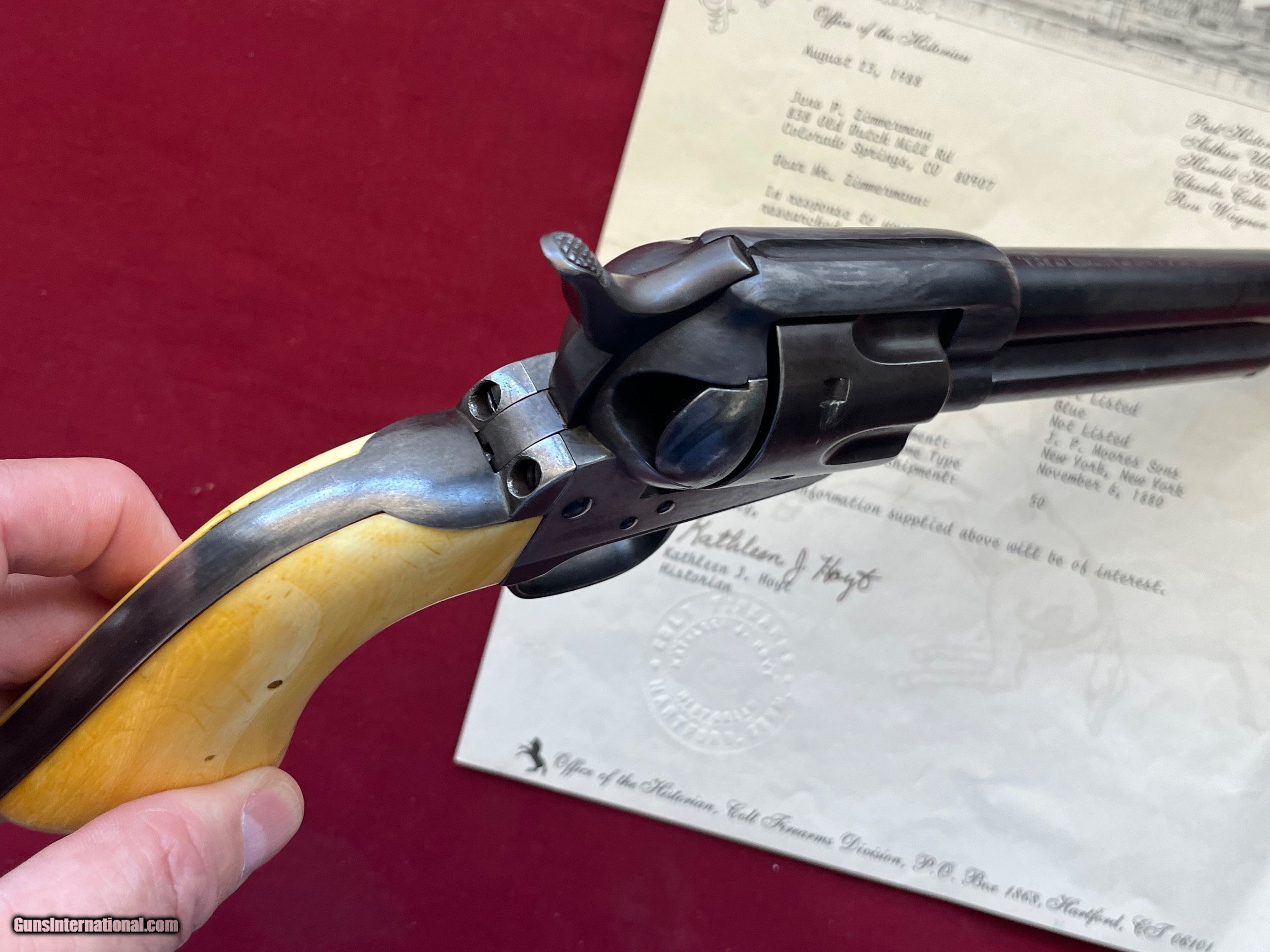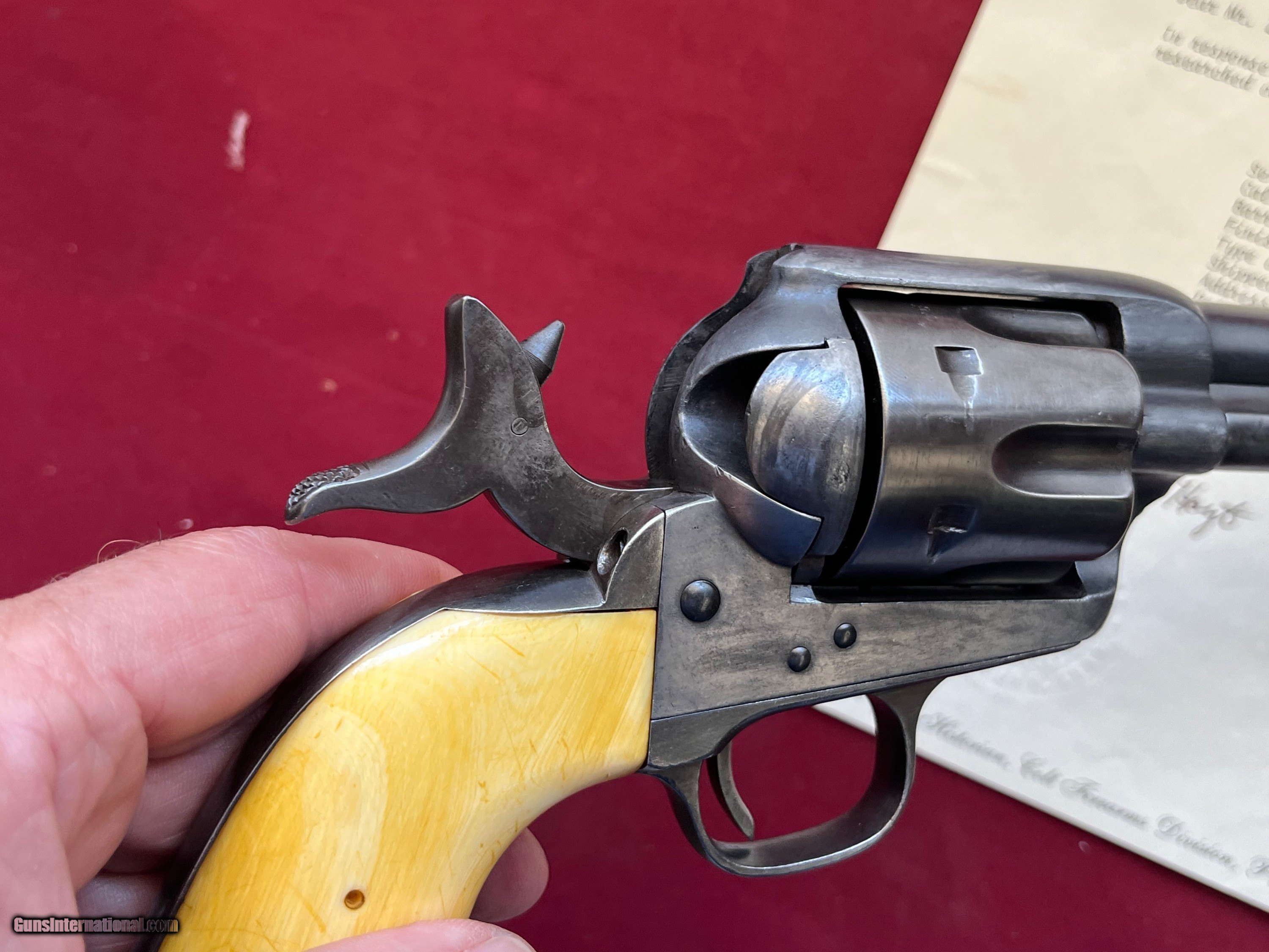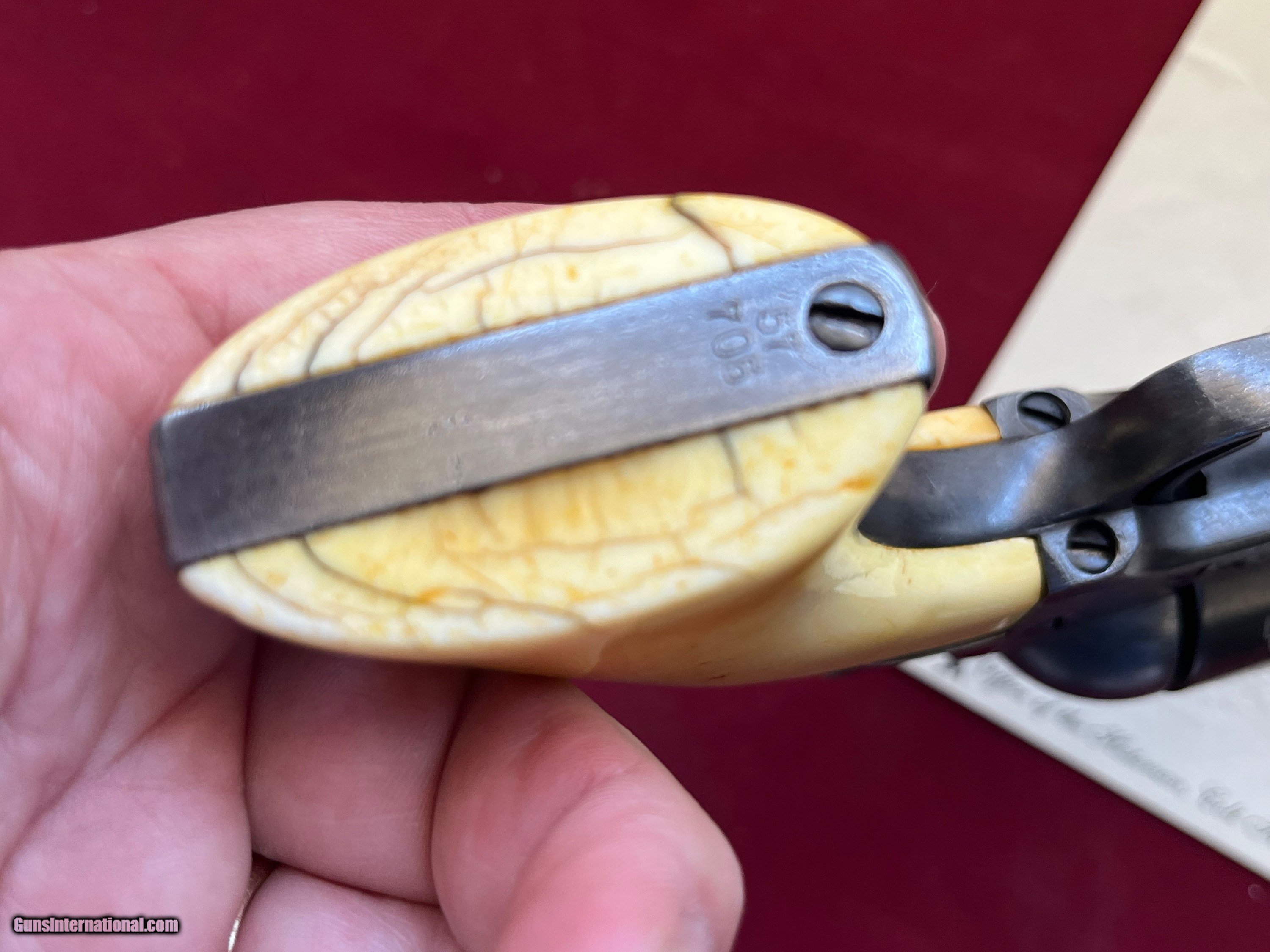 Description: ANTIQUE MADE IN 1880. COLT SINGLE ACTION ARMY REVOLVER ETCHED PANNEL " FRONTIER SIX SHOOTER 44-40" IVORY GRIPS. SER# 57705 SHIPPED FORM THE WAREHOUSE NOV, 6TH 1880. 7 1/2" BARREL WITH A DESCENT SHOOTABLE BORE SHOWING GOOD RIFLING AND FROSTY GROOVES. COMES WITH IVORY GRIPS WITH A CHIP REPAIR GLUED BACK IN . ETCHED PANNEL IS TYPICAL WEAK BUT LEGIBLE. I BELEIVE THE METAL HAS SOME BLUE TOUCH UP FROM YEAR AGO ESPECIALLY ON THE FRAME. ACTION WORKS AND FINCTIONS FINE WITH ALL FOUR CLICKS. COMES WITH A COLT LETTER. EASTERN BRANCH FIREARMS ADD 40.00 SHIPPING – NEXT DAY AIR SHIPPING ADD 50.00 SHIPPING – LONG GUNS GROUND OPTIONAL INSURANCE IS AVAILABLE AT 1.25 PER 100.00 Questions e-mail or call Glen at Eastern Branch Firearms 207-215-5021 TERMS – PLEASE READ BEFORE I DO NOT HAVE A LAYAWAY OPTION ( WE ACCEPT CREDIT CARDS ) -- I GET ALOT OF REQUEST FOR TRADES, I WOULD PERFER NOT TO DO TRADES ON MY INTERNET LISTINGS PAYMENT OPTIONS- We accept money orders, cashier’s checks , bank checks. sorry no personal checks. We accept all major credit cards please add 3% to the ’s cash discount price.(Shipping within the state of Florida - Florida Residents must pay sales tax) .Handguns and long guns do need to be shipped separate. PLEASE do not send payment via FED EX . USPS & UPS are fine. Thank you. We include a signed copy of our FFL with each firearm shipped. SAFTY NOTICE- Buyer is solely responsible for determining that a used gun is safe to shoot. The firearms offered have not been test fired but have been given a visual inspection only for purposes. It is a requirement that every used firearm is inspected by a qualified gunsmith before firing. By , the buyer agrees to hold seller harmless against damages, injury, or death caused by defective merchandise. RETURN POLICY- All firearms come with a 3-day non firing , non messing with ( turning srews ,taking apart,removing parts, scoping. firing, cleaning or messing with in anyway) inspection/return privilege.Inspection is based on a visual review of the gun to confirm the gun is in the condition stated. In the case of a return, buyer pays all shipping charges & if paid for with a credit card buyer absorbs the 3% credit card charges . So please ask questions BEFORE you bid. Thanks for Looking and Good Luck!! U.S. sales only, no exports…this includes antiques. I will ship to third party for exporting SOLD Antique: Yes |