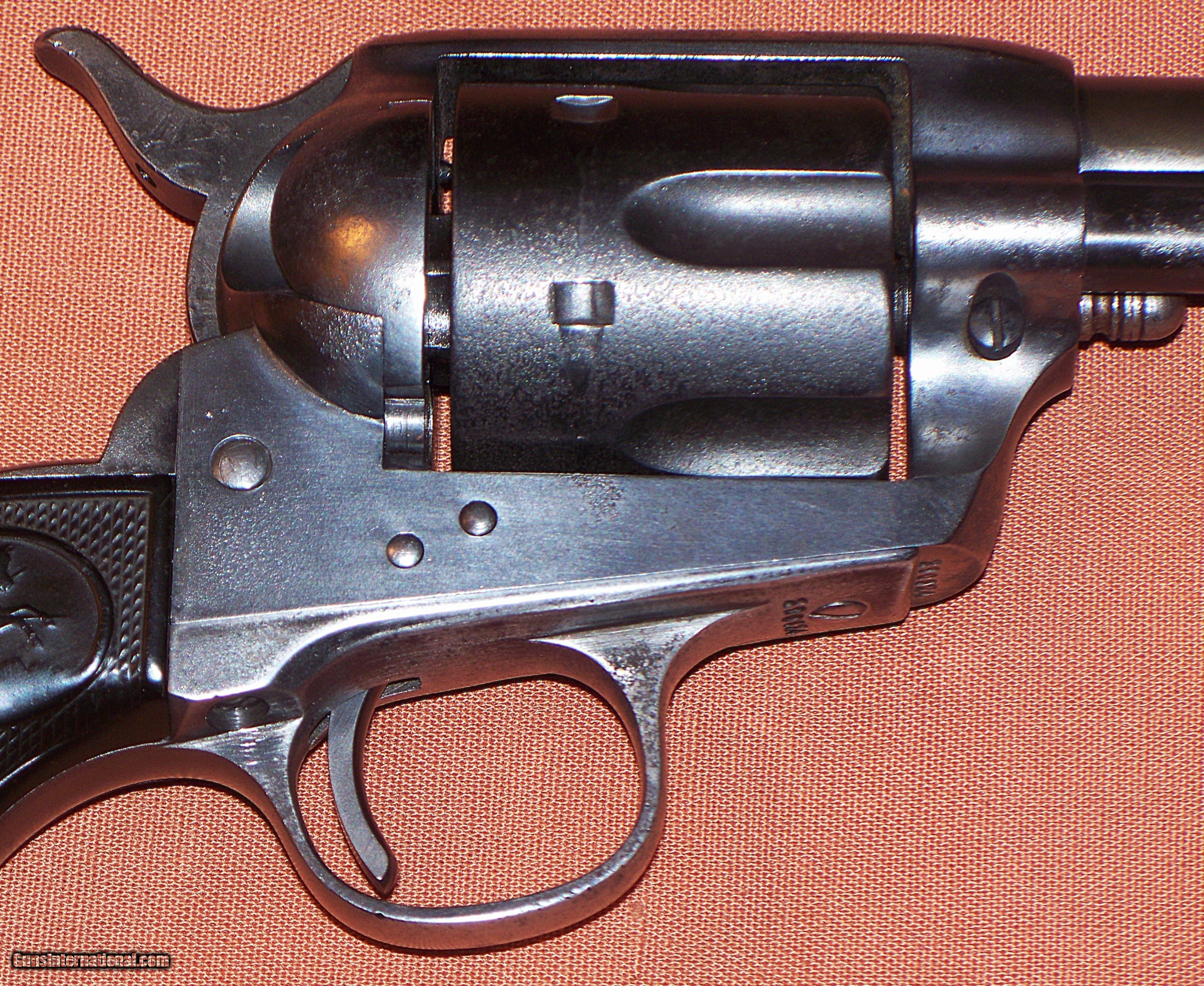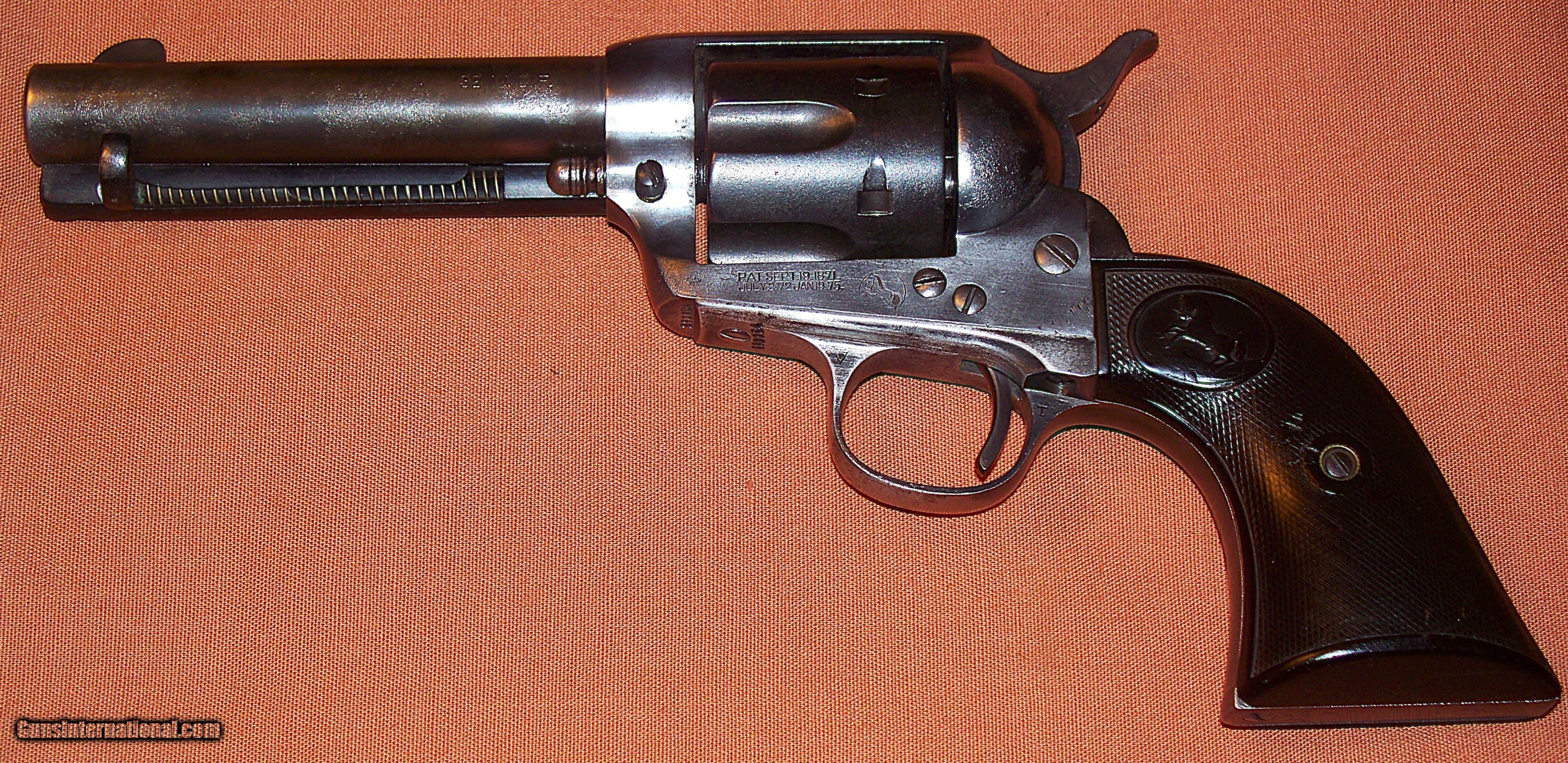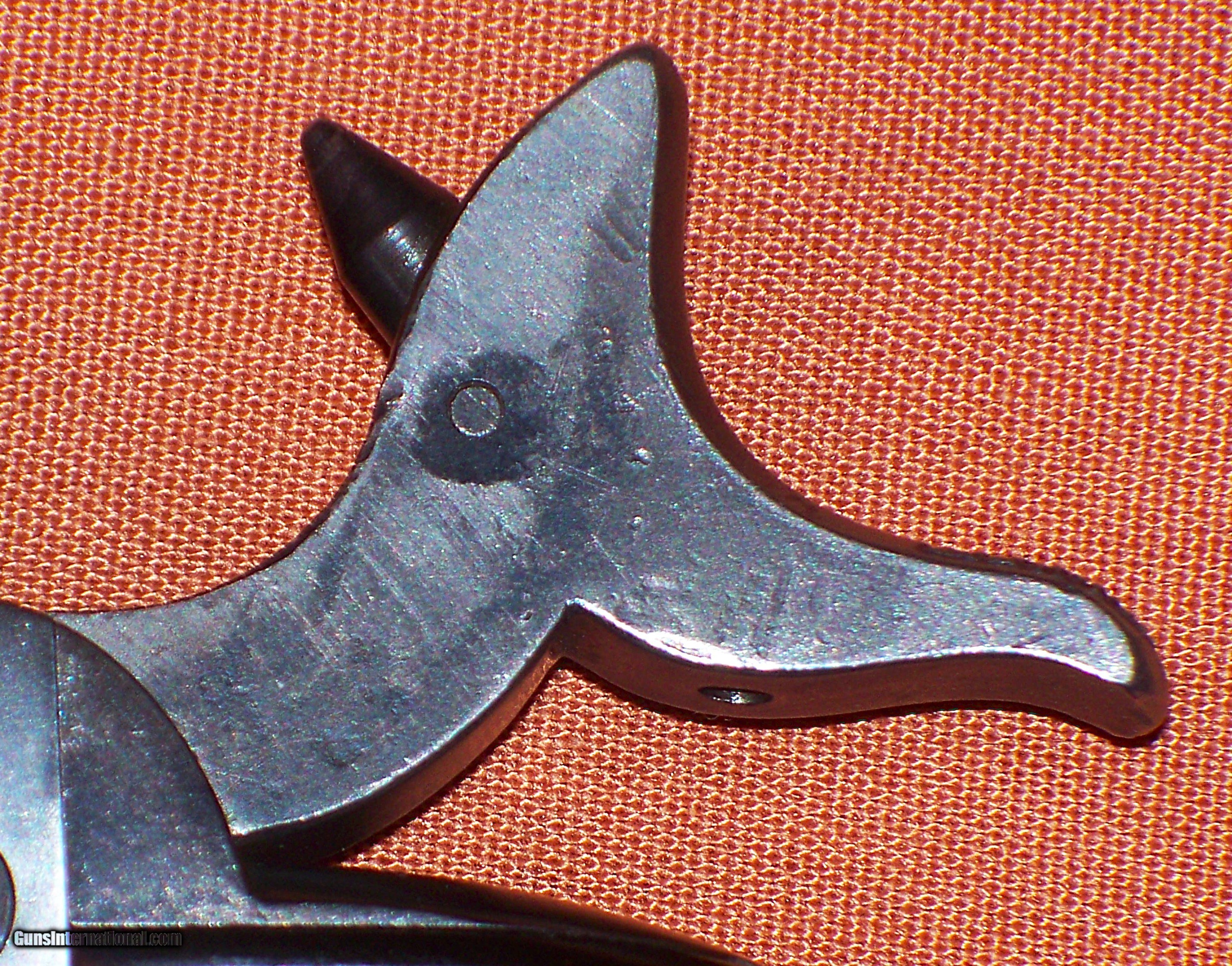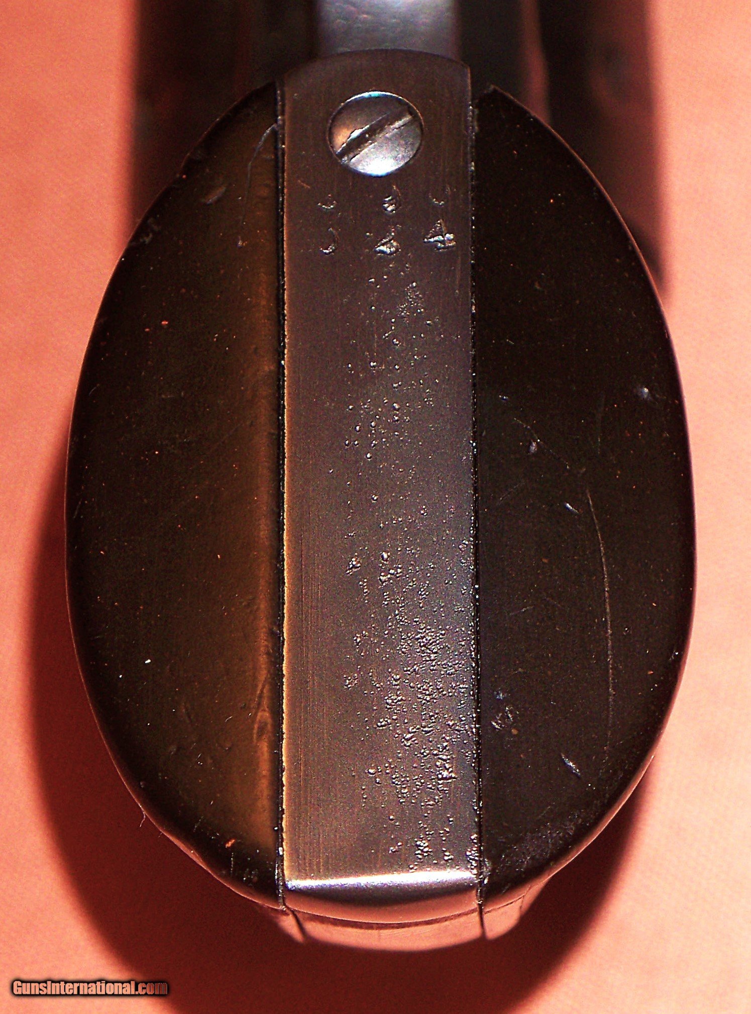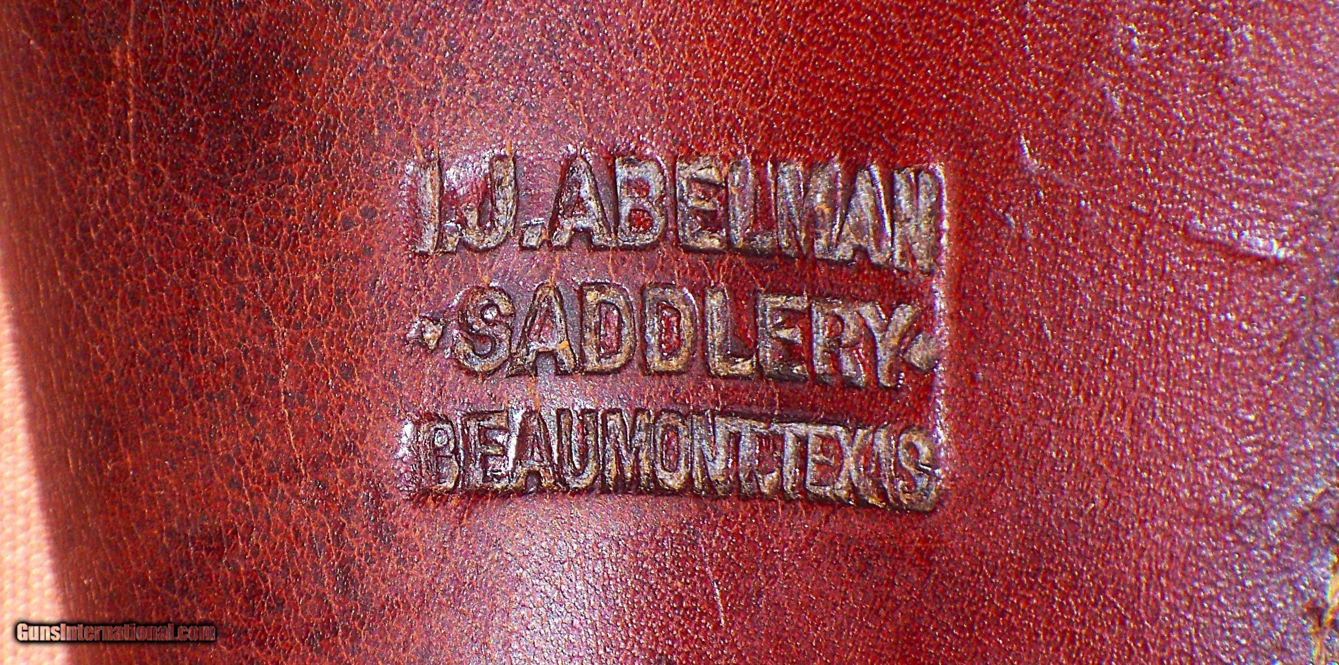 Description: This Colt Single Action Army revolver was shipped to J. F. Schmelzer & Sons Arms Company, Kansas City, Missouri, with 6 other guns on March 2, 1907. It is a 4.75” in .32 WCF (.32-20 caliber), blue and case, with Colt letter. It is almost a no finish gun barrel, cylinder and ejector rod casing turning to patina with very even, shallow pitting on the cylinder and slightly deeper on the left side of the barrel. Numbers match and the bore is very good with very shallow frosting throughout – about a 7 out of 10. The action has all four clicks and four notches, with a little sloppy lock up (probably could use a new bolt). The holster is a simple modified pocket type, made by I. J. Abelman, Beaumont, Texas. Israel Jake Abelman (9/15/1881, Warsaw, Poland, to 7/30/1963) came into Beaumont, Jefferson County, Texas in 1901 after the discovery of oil, and opened Abelman’s Saddlery Store to provide Jefferson County’s horses with the finest factory-made saddles, harnesses, lines and reins. He later added automobiles to the dealership, suspecting the motor car would eventually replace the horse. He was mostly right! Curio/Relic: Yes Handgun Caliber: .32-20 Winchester (.32 WCF, .32-20 Marlin, .32 Colt Lightning ) Manufacturer: Colt Model: SAA Serial Number: 290024 Barrel Length: 4.75 Condition: Used Bore Condition: Good Grips: Hard rubber Price: $2,750.00 Shipping: $75.00 Buy Now Contact Seller |