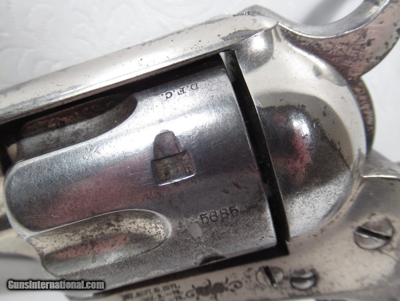 Description: Colt Single Action Army; Serial No. 95685; Originally Shipped to U.S. Government July 20, 1883; Page 510 in Graham, Kopec, and Moores Text, “A Study of the Colt Single Action Army” Indicates that the State of Virginia was Issued Calvary Models - Instead of Issuing to Their Militia, the State Immediately Traded them to New York City Arms Dealers; These Guns were Nickel Plated, Barrels Cut to 5”, Grips Varnished, and ‘U.S.’ on Frame Engraved Over; I have Personally Seen Several Identically Altered Arms and Believe this to be One of the Traded Virginian U.S. Calvary Guns; This Gun Retains Most of the N.Y. Applied Nickel Finish; All Numbers Match and All U.S. Inspector’s Marks Intact; PERFECT Action and EXCELLENT Shiny Bore; See All Photos for Condition; No Texts; Call (254)541-5765 or Email Only; PERSONAL PROPERTY of Harold Wieser; Price: $4,975 + $45 S&H Via USPS PRIORITY MAIL; Payment Address: Harold Wieser - 1466 U.S. Hwy 77 - Rosebud, TX 76570; SEND PAYMENTS VIA USPS PRIORITY MAIL; BEWARE of SCAMS!!! – DO NOT SEND MONEY or CORRESPONDENTS ELECTRONICALLY UNLESS YOU HAVE SPOKEN to HAROLD WIESER FIRST! 254-541-5765 SOLD Antique: Yes Manufacturer: Colt Model: 1873 Serial Number: 95685 |
