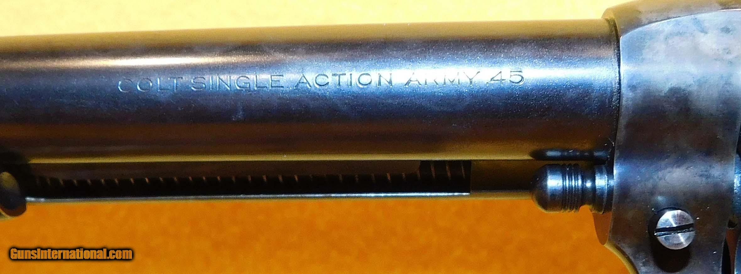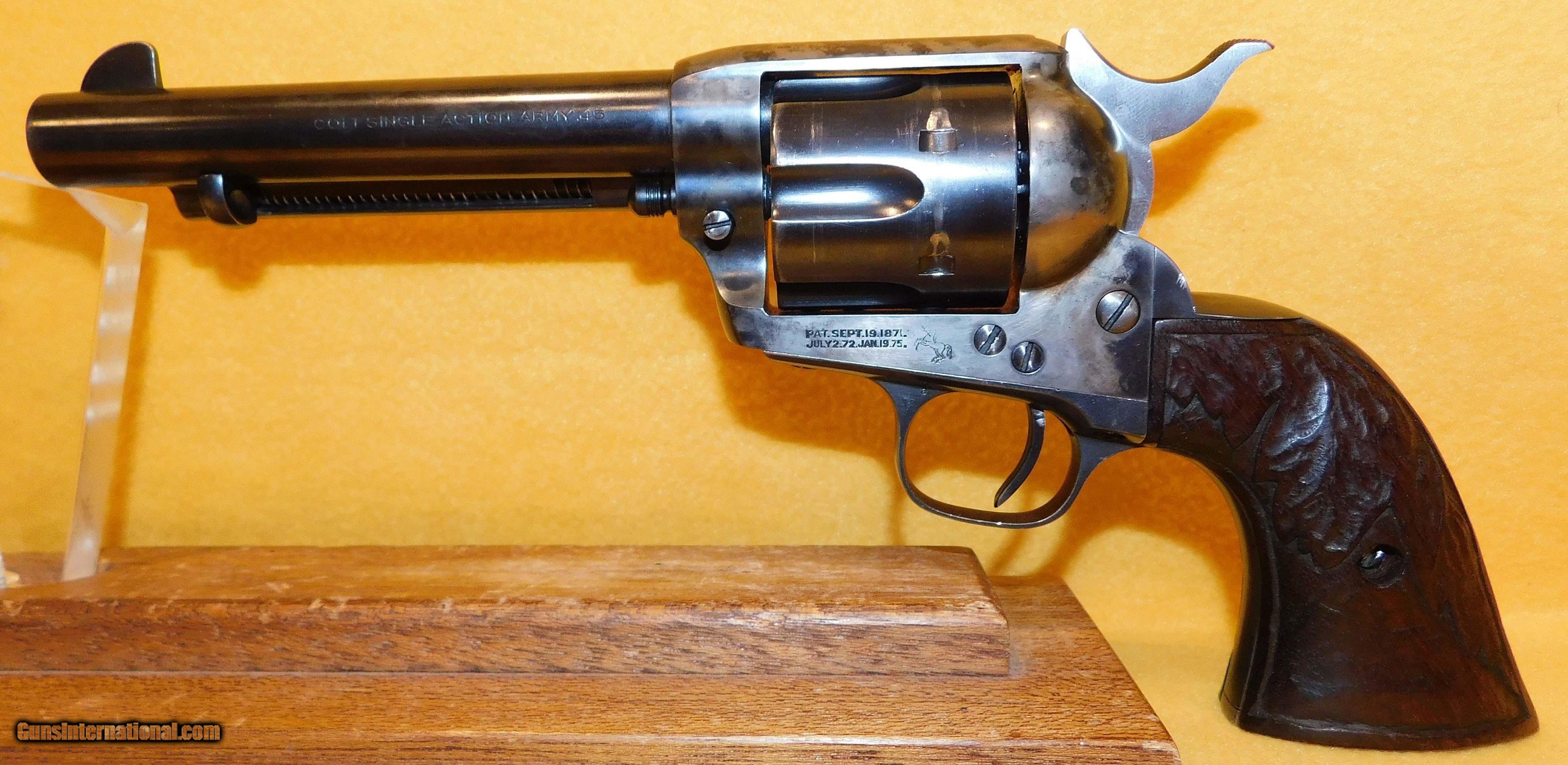 Description: COLT SINGLE ACTION ARMY IN .45 LONG COLT CAL., WITH 5 1/2" BARREL. COLOR BLUE. CONDITION 85%+. SERIAL NUMBER 354102. COLT MODEL SINGLE ACTION ARMY (CIRCA 1931) (FIRST GENERATION) IN .45 LONG COLT, BRIGHT SHINY BORE, CARVED GRIPS EXCELLENT, 50% CASE COLORING STILL SHOWING, 85%+ OVERALL CONDITION, OUR STOCK # D1999 SOLD |