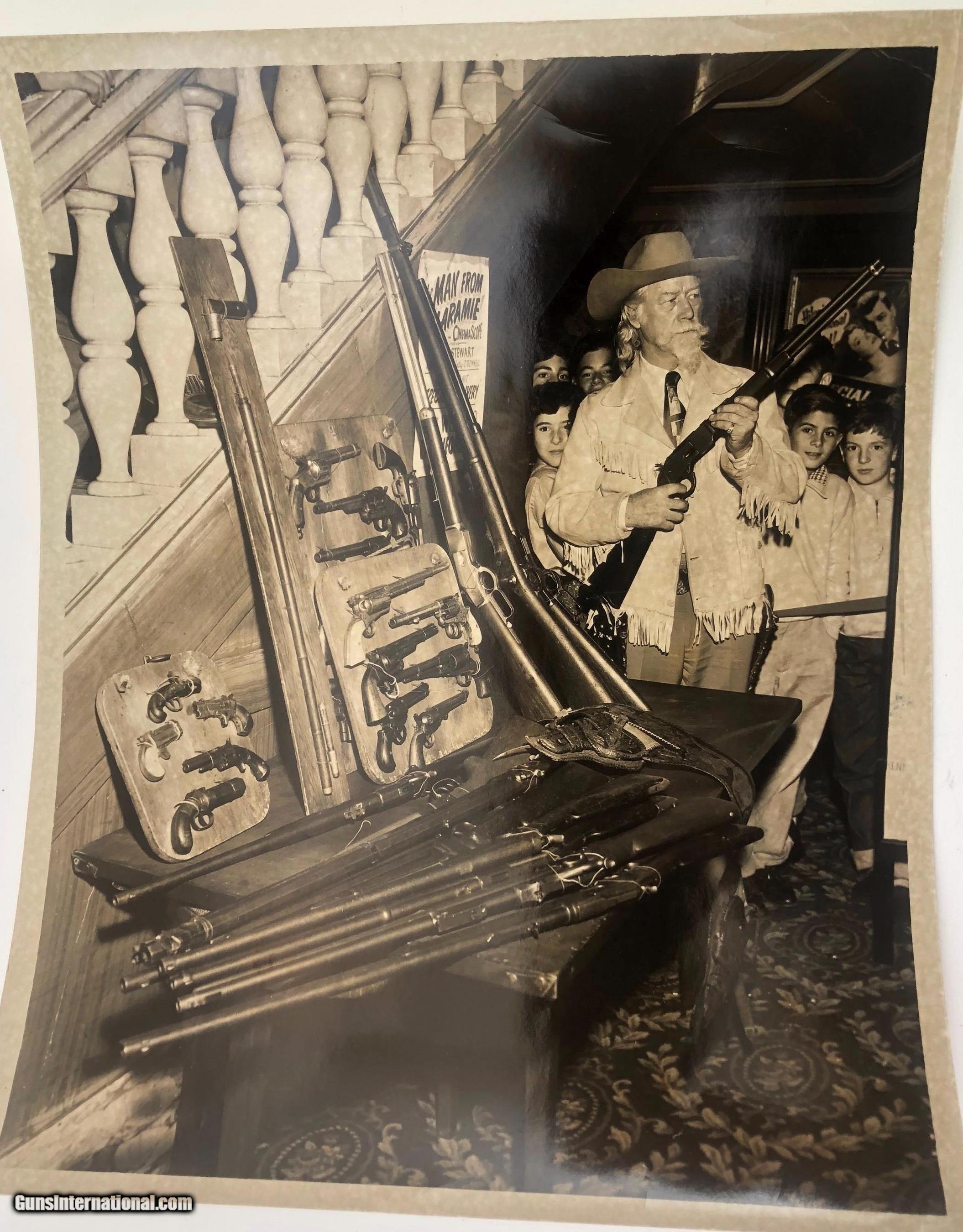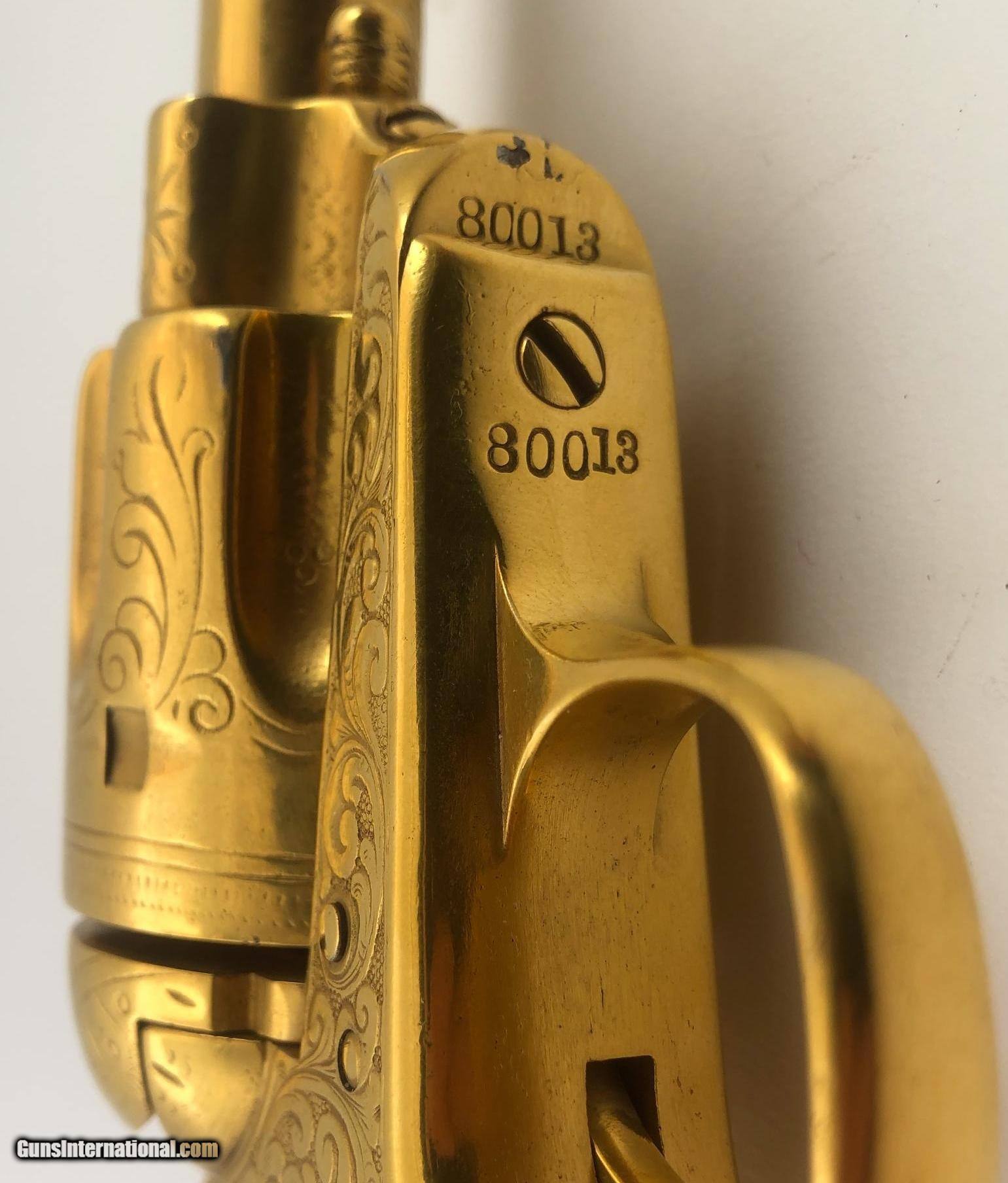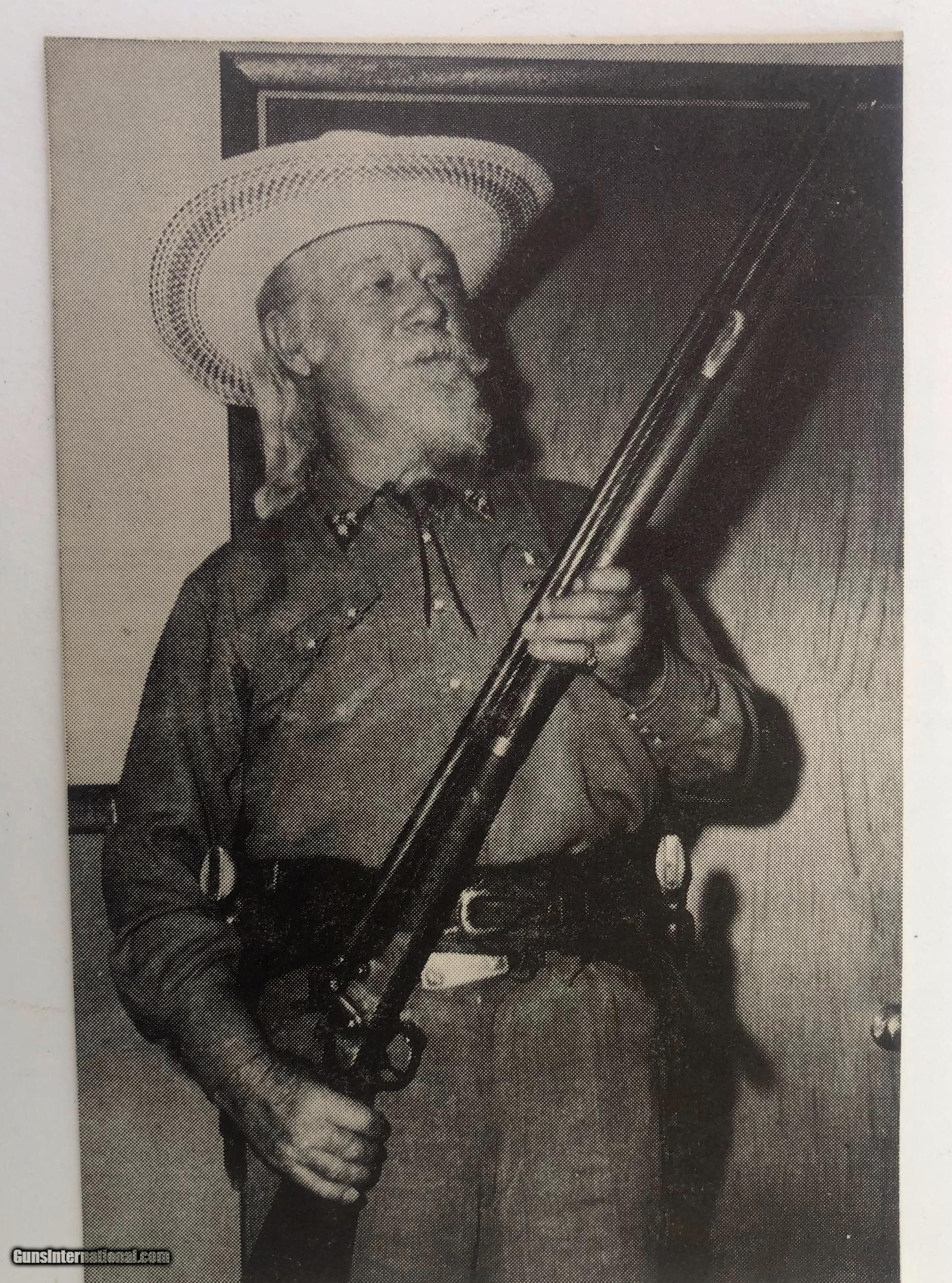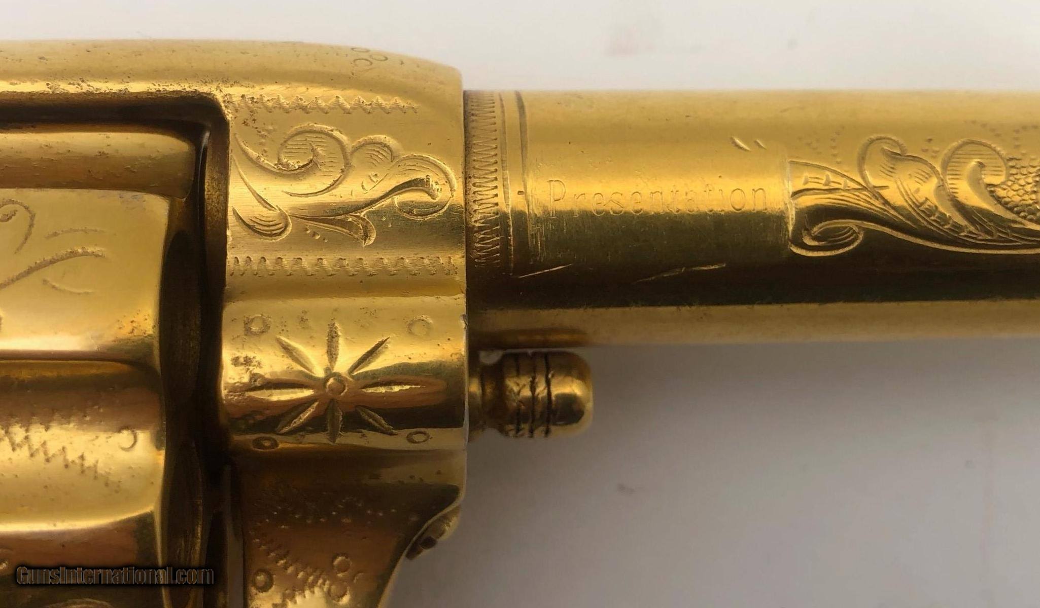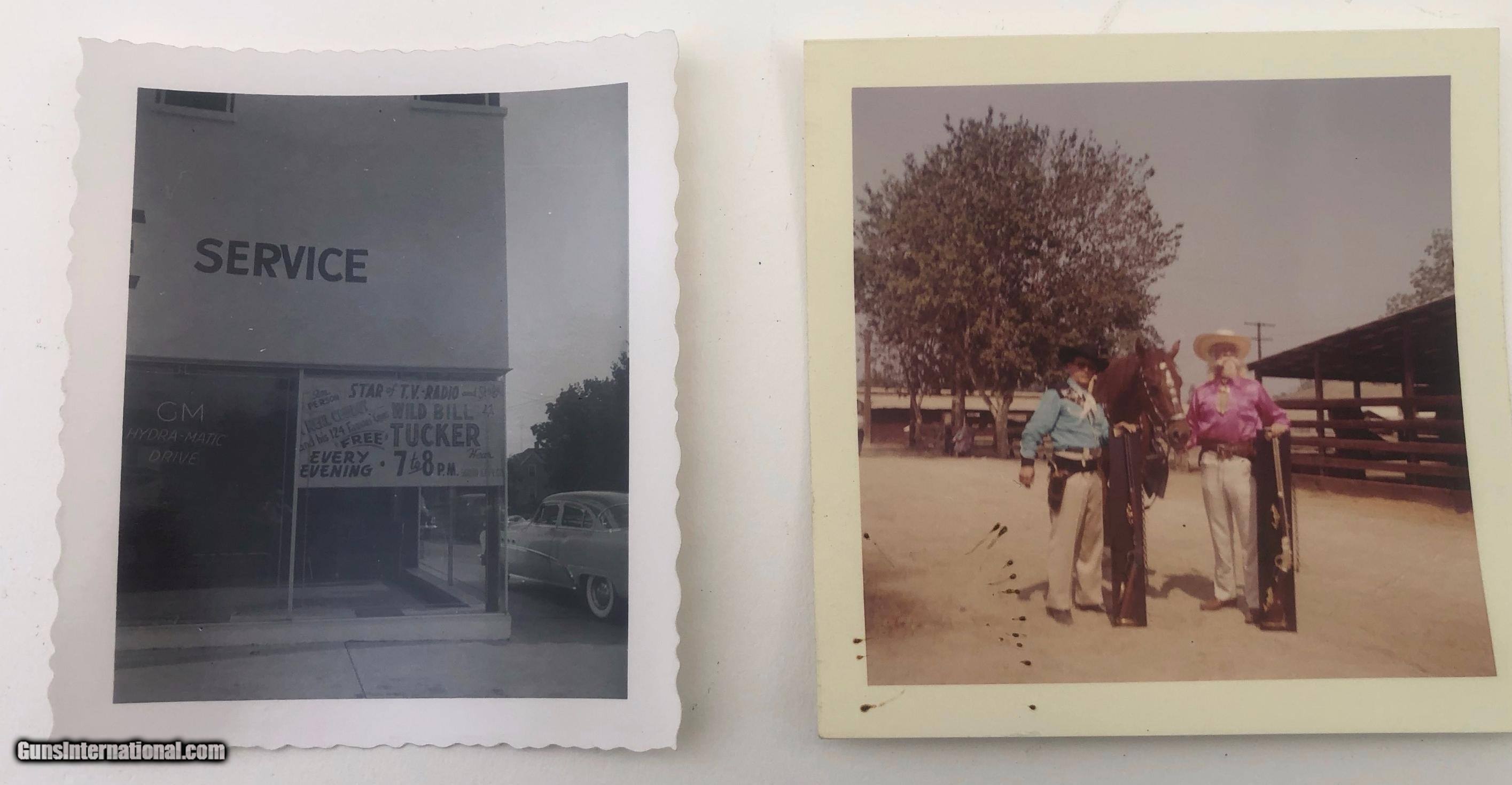 Description: The backstrap is engraved " TO JUDGE JAMES TUCKER CHEYENNE COUNTY NEBR. Right side of barrel marked "PRESENTATION" Left side of barrel marked "U.P.R.R. This gun was obtained many years ago by the Pony Express Gun Shop in Encino, CA. The gun belonged to Wild Bill Tucker a Vaudeville actor and showman who was the son of Judge James Tucker and claimed to be a cousin of "Buffalo Bill" Included with the gun is a folder of information and old photos. It is chambered for 44/40 cartridge and has been gold plated. The barrel has been cut to 3.75" and the ejector housing has been removed. Mfg. date 1882 SOLD Antique: Yes Manufacturer: Colt Model: Single Action Serial Number: 80013 Barrel Length: 3.75 |