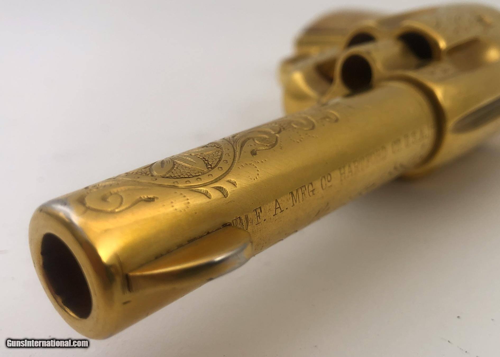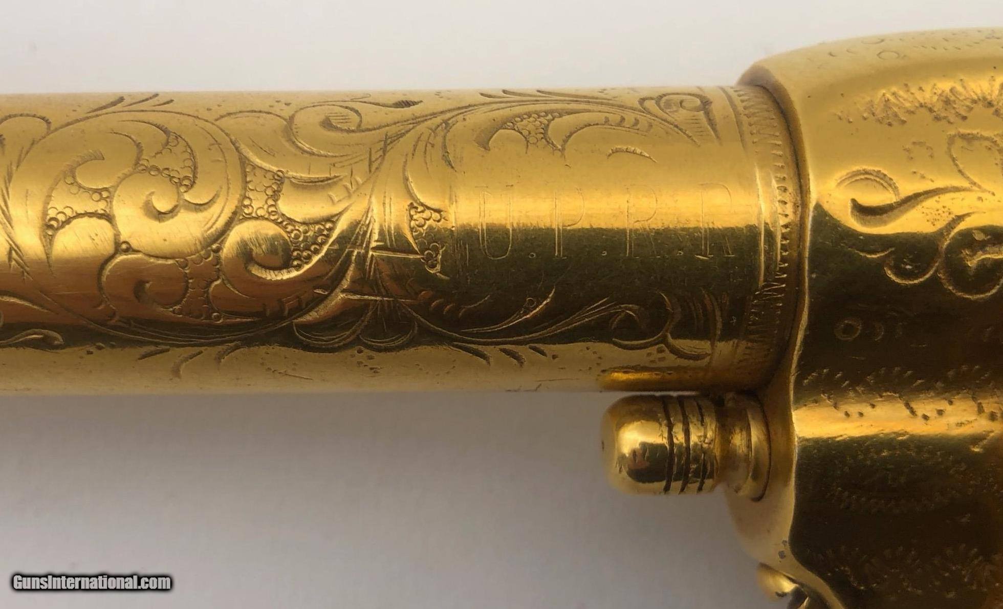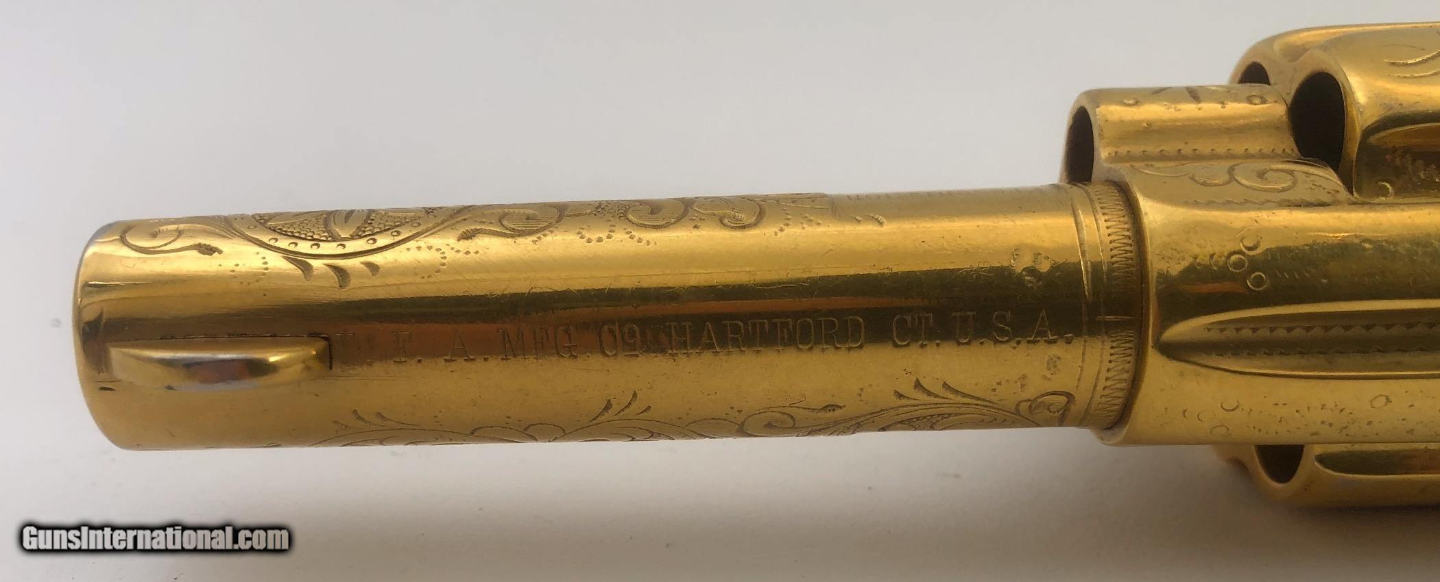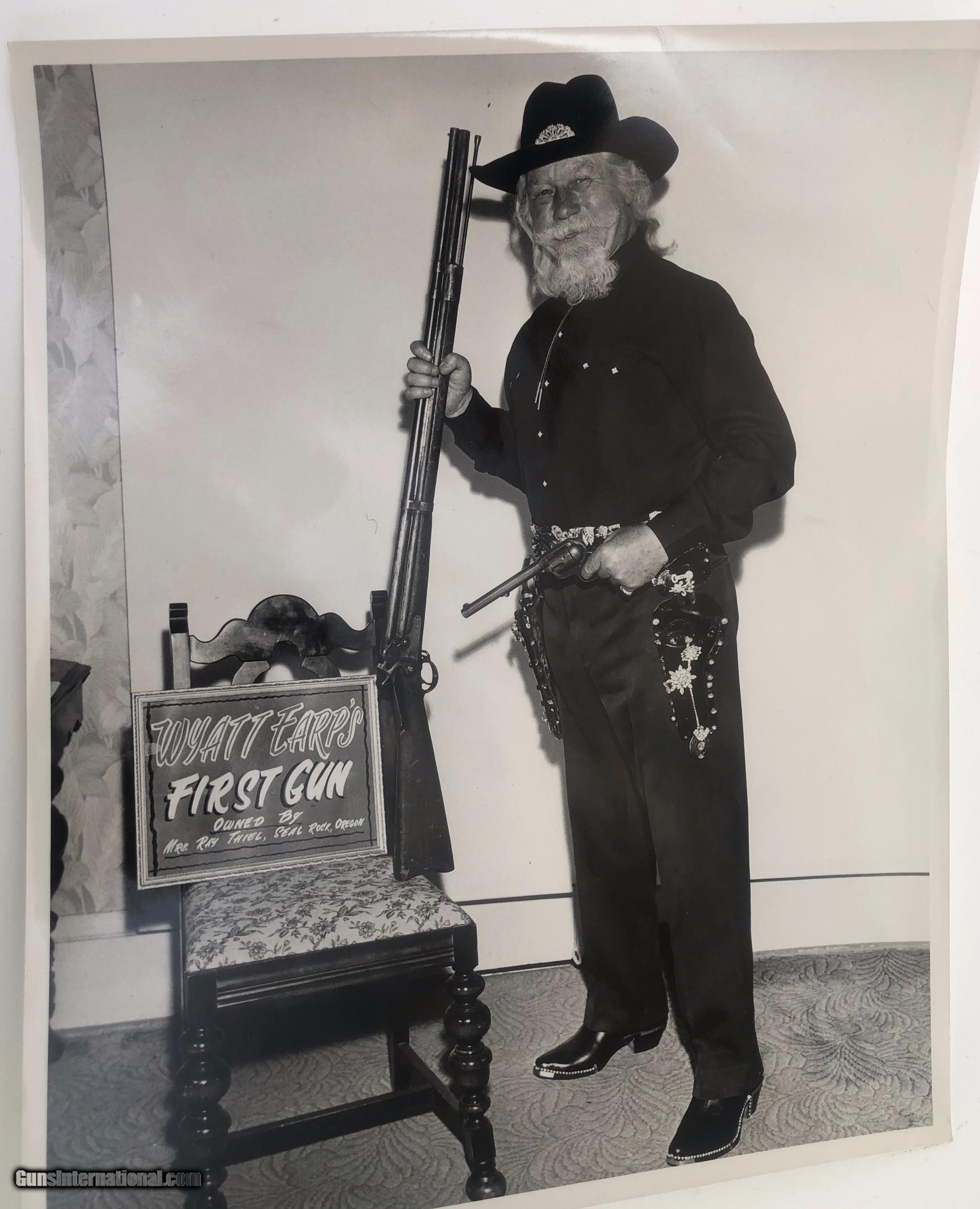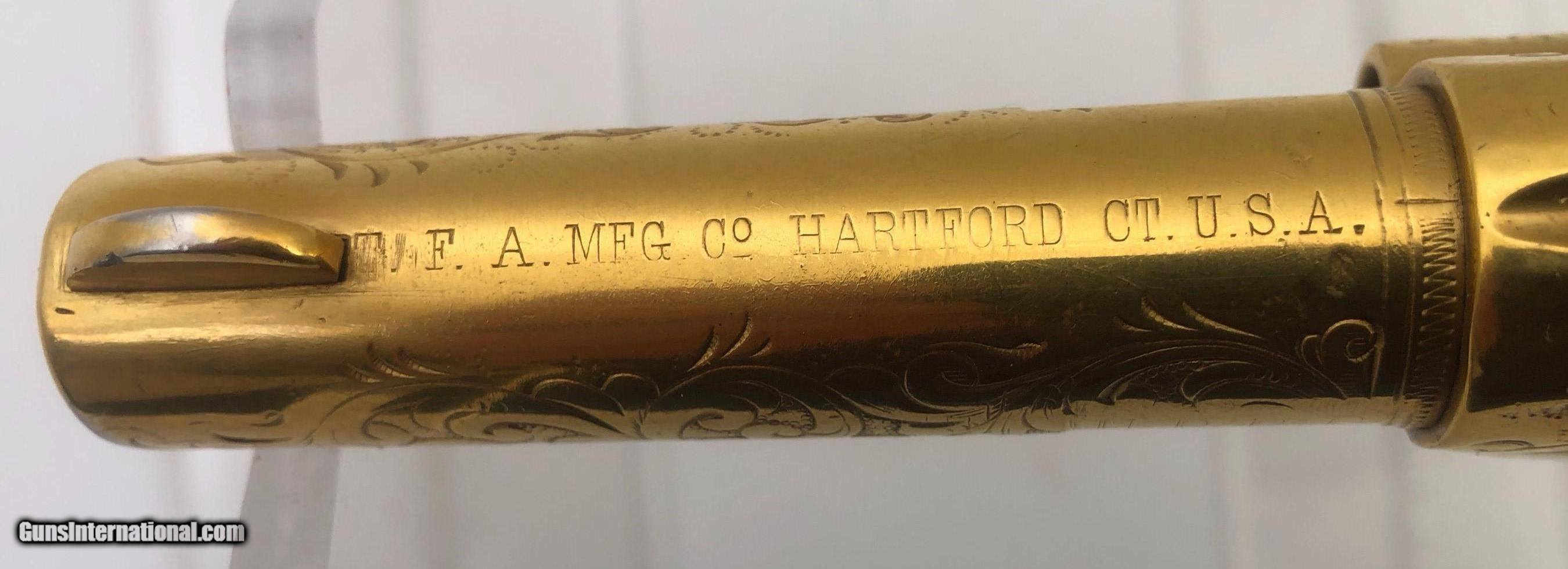 Description: The backstrap is engraved " TO JUDGE JAMES TUCKER CHEYENNE COUNTY NEBR. Right side of barrel marked "PRESENTATION" Left side of barrel marked "U.P.R.R. This gun was obtained many years ago by the Pony Express Gun Shop in Encino, CA. The gun belonged to Wild Bill Tucker a Vaudeville actor and showman who was the son of Judge James Tucker and claimed to be a cousin of "Buffalo Bill" Included with the gun is a folder of information and old photos. It is chambered for 44/40 cartridge and has been gold plated. The barrel has been cut to 3.75" and the ejector housing has been removed. Mfg. date 1882 SOLD Antique: Yes Manufacturer: Colt Model: Single Action Serial Number: 80013 Barrel Length: 3.75 |