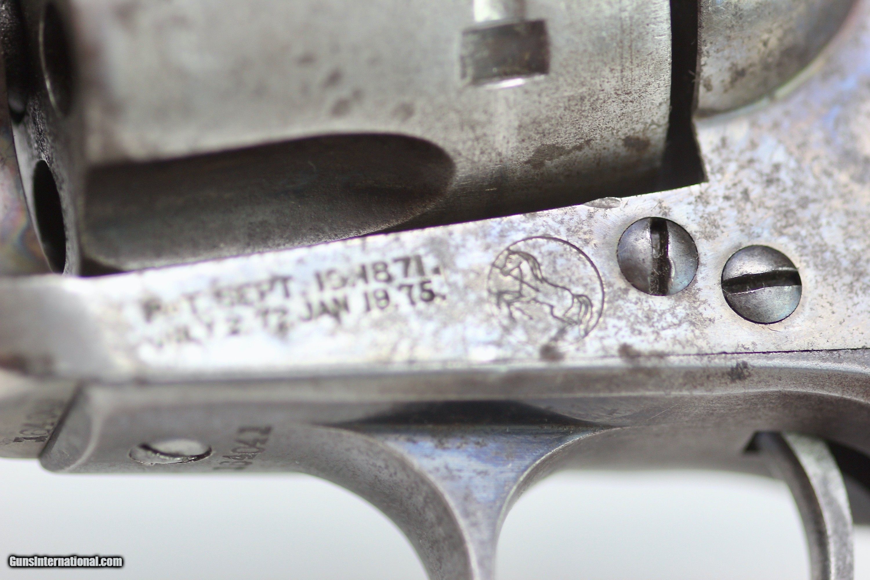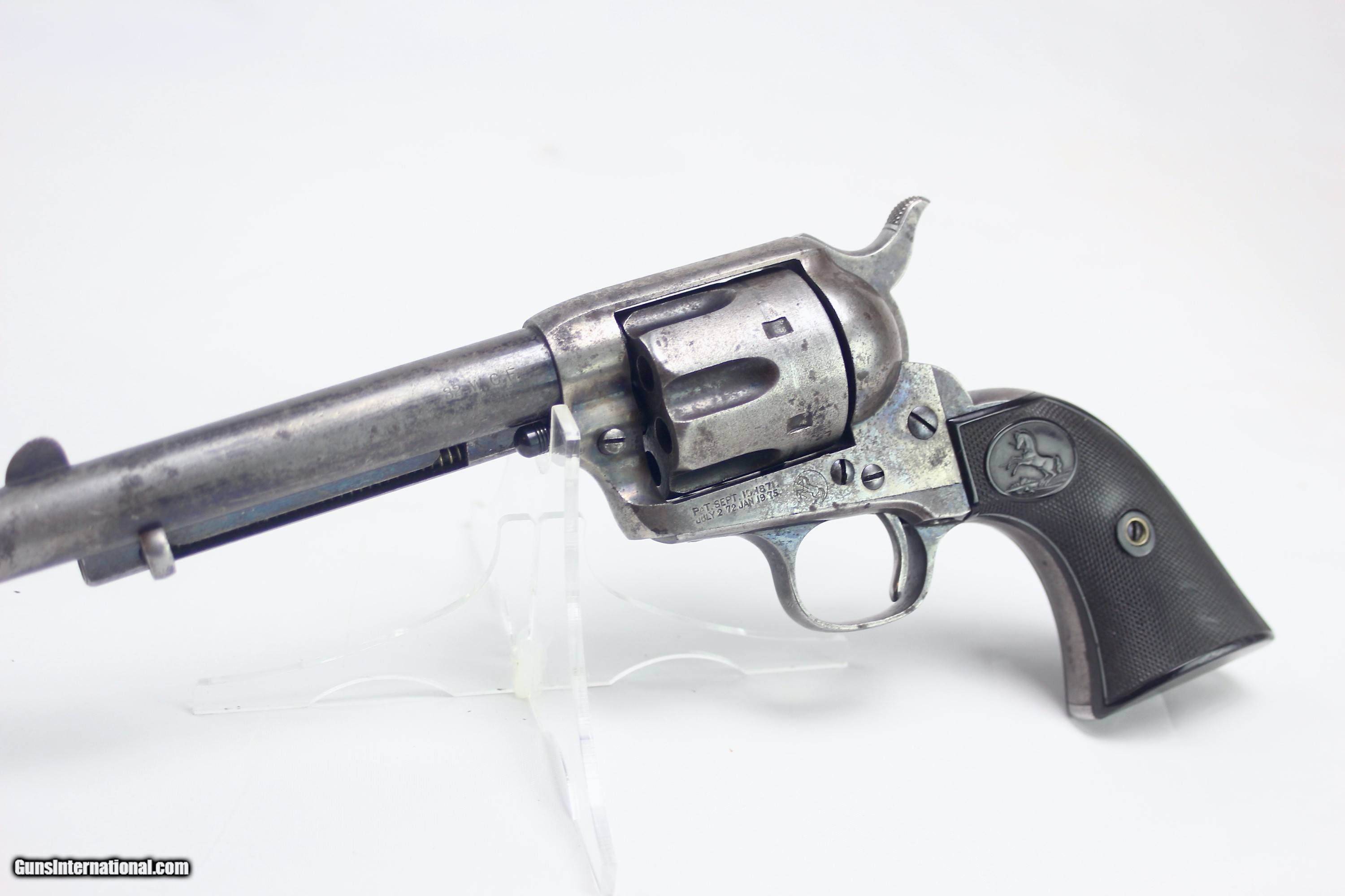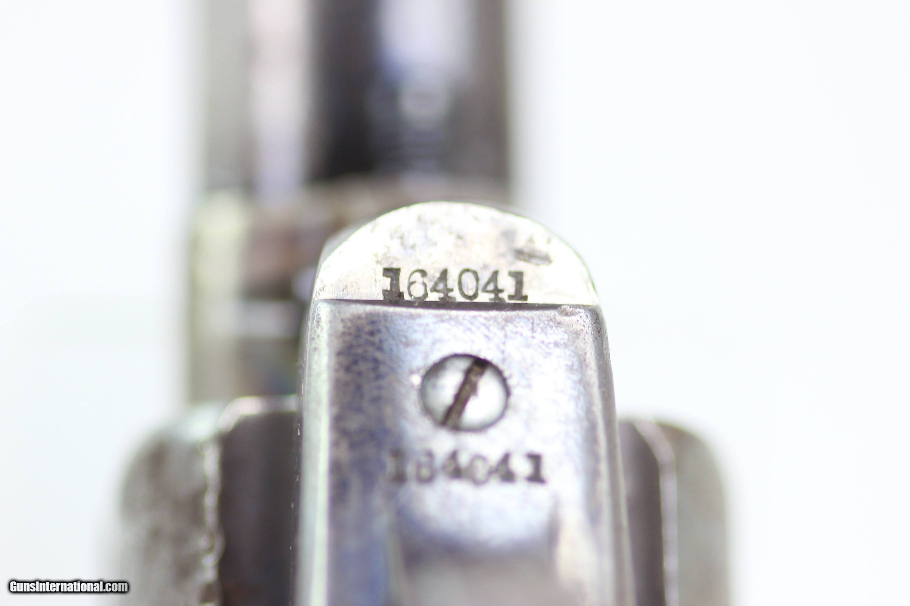 Description: Offeered for sale is a Colt Single Action Revolver, Model 1873 in 32-2- Caliber (32 Colt). The gun is serial number 164041 (1897) and is marked as such on the Lower Frame, Trigger Guard Strap and the Butt Plate. The barrel is merked 45 Colt on the left side. The top of the barrel is marked "COLTS PT. F. A. MFG Co Hartford CT. USA. The two line patent dates and the Colt insigna are on the left side of the frame below the cylinder. The gun is in good mechanical condition and retains the 1st, 3rd and 4th click when cocked. The bore is dark, but retains strong rifling with no pitting. The resin grips are free of cracks, chips or splits. The gun retains some distint case hardened finish on the frame and aproximately 15 - 20 % of the original blue finish to the barrel and ejector rod housing. The cylinder shows some denting to the profile and an overal gray patina to the rest of the surface. The grips are in very good condition with no chips, splits or cracks. The gun would make a nice addition to any Colt collection or a very good "Cowboy Shooting" gun. SOLD Antique: Yes Handgun Caliber: .32-20 Winchester (.32 WCF, .32-20 Marlin, .32 Colt Lightning ) Manufacturer: Colt Patent Fire Arms Co Model: 1873 Serial Number: 164041 Barrel Length: 5 1/2 Chambers: 6 Condition: Good Metal Condition: Good Bore Condition: Dark with strong rifling Finish: Blue /gray patina Manufacture Date: 1897 Item Location: Coweta, Oklahoma |