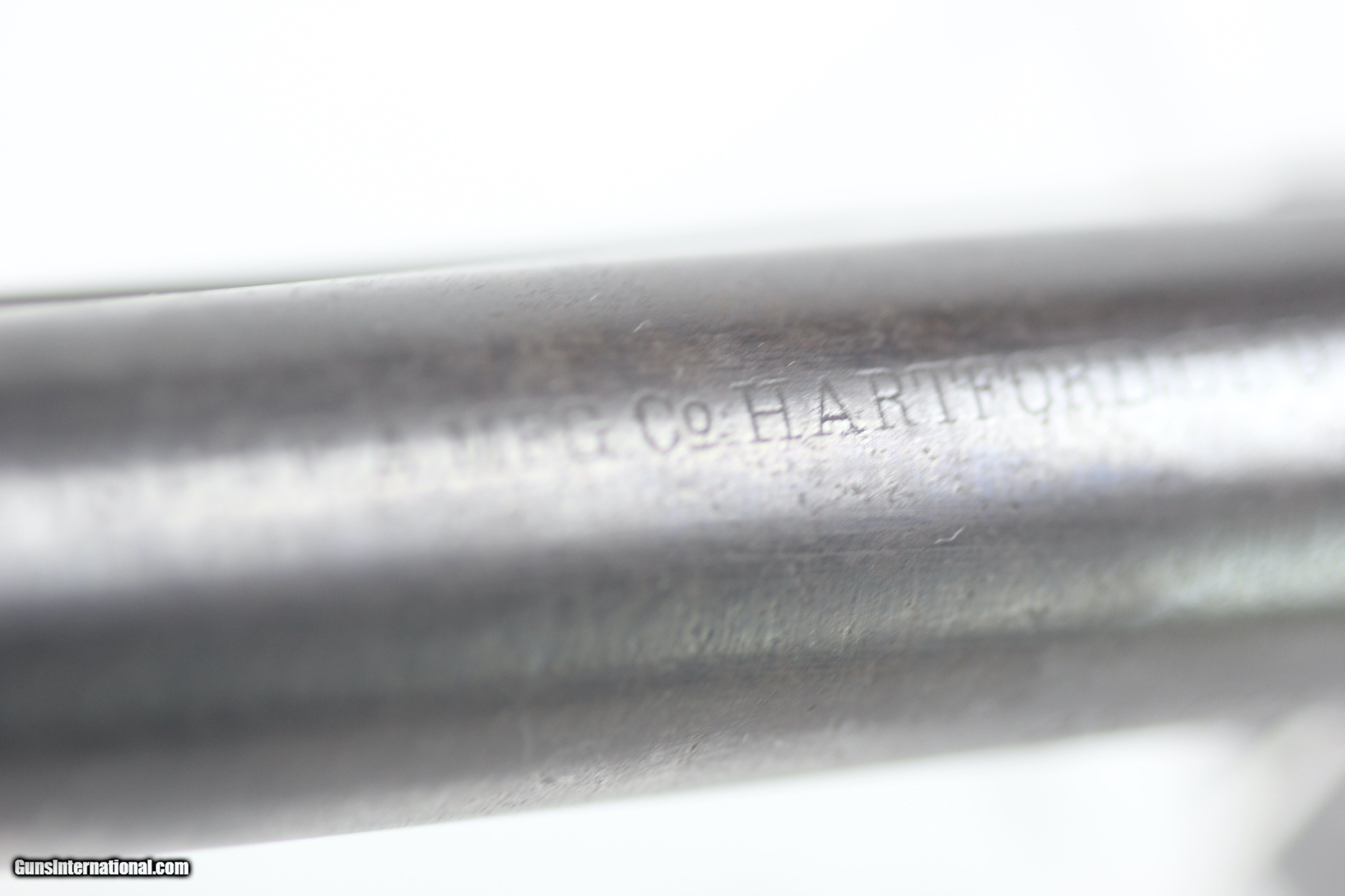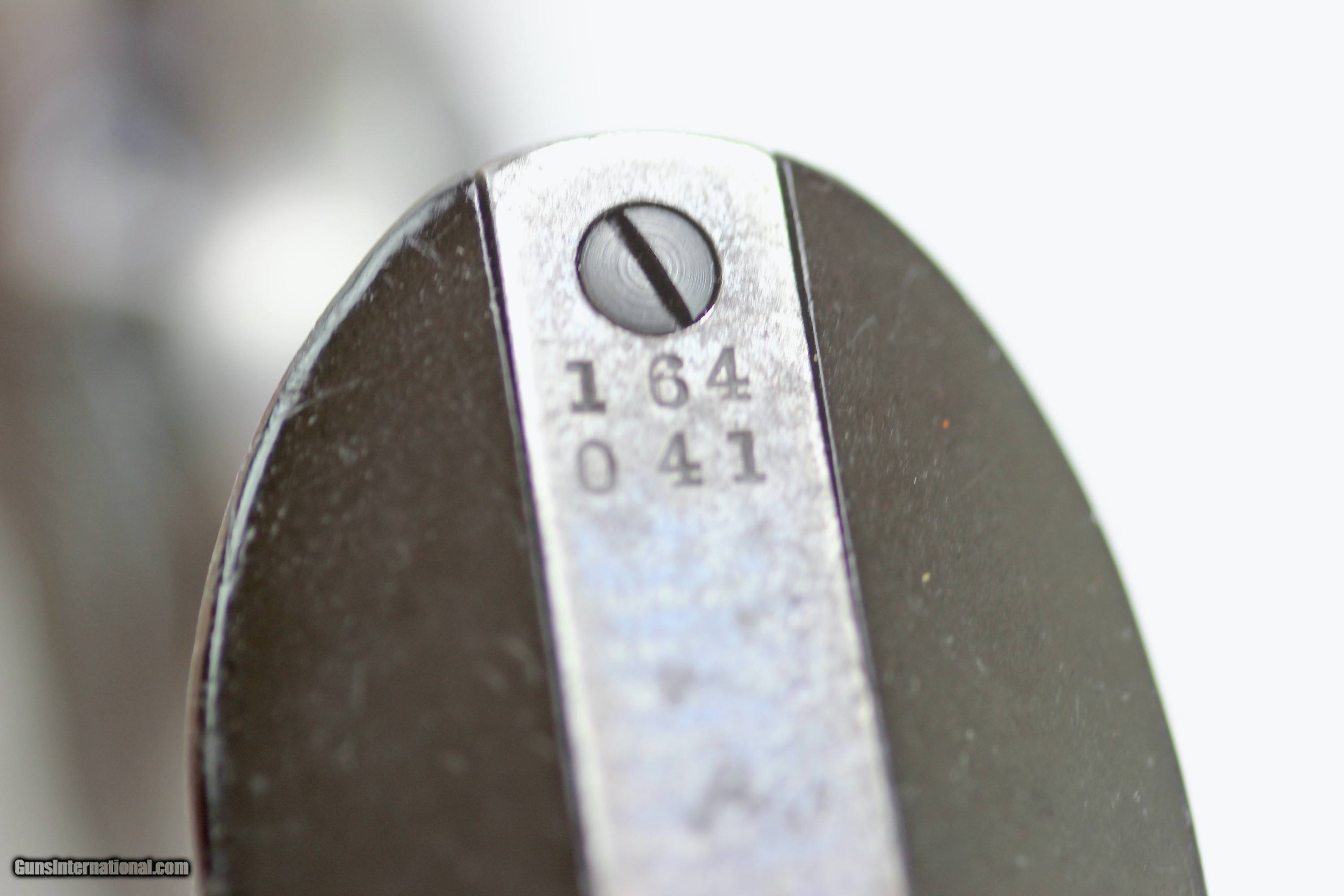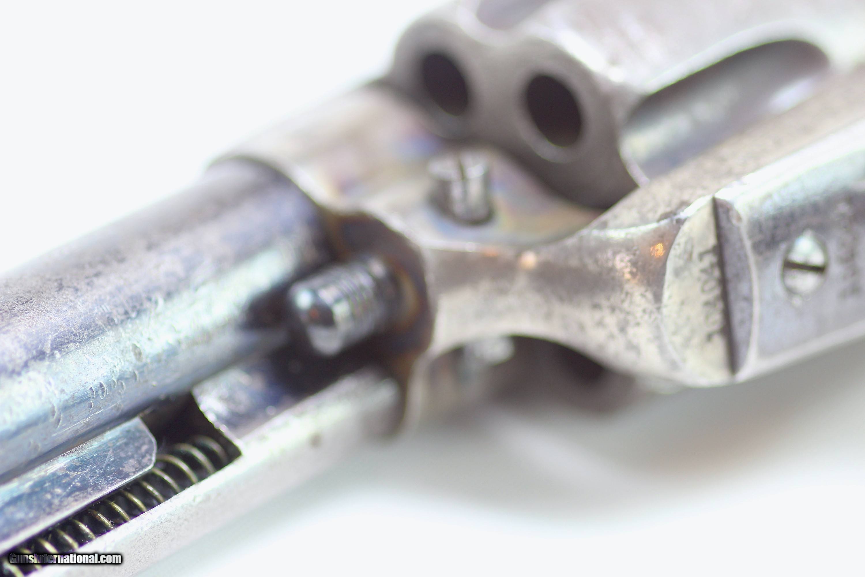 Description: Offeered for sale is a Colt Single Action Revolver, Model 1873 in 32-2- Caliber (32 Colt). The gun is serial number 164041 (1897) and is marked as such on the Lower Frame, Trigger Guard Strap and the Butt Plate. The barrel is merked 45 Colt on the left side. The top of the barrel is marked "COLTS PT. F. A. MFG Co Hartford CT. USA. The two line patent dates and the Colt insigna are on the left side of the frame below the cylinder. The gun is in good mechanical condition and retains the 1st, 3rd and 4th click when cocked. The bore is dark, but retains strong rifling with no pitting. The resin grips are free of cracks, chips or splits. The gun retains some distint case hardened finish on the frame and aproximately 15 - 20 % of the original blue finish to the barrel and ejector rod housing. The cylinder shows some denting to the profile and an overal gray patina to the rest of the surface. The grips are in very good condition with no chips, splits or cracks. The gun would make a nice addition to any Colt collection or a very good "Cowboy Shooting" gun. SOLD Antique: Yes Handgun Caliber: .32-20 Winchester (.32 WCF, .32-20 Marlin, .32 Colt Lightning ) Manufacturer: Colt Patent Fire Arms Co Model: 1873 Serial Number: 164041 Barrel Length: 5 1/2 Chambers: 6 Condition: Good Metal Condition: Good Bore Condition: Dark with strong rifling Finish: Blue /gray patina Manufacture Date: 1897 Item Location: Coweta, Oklahoma |