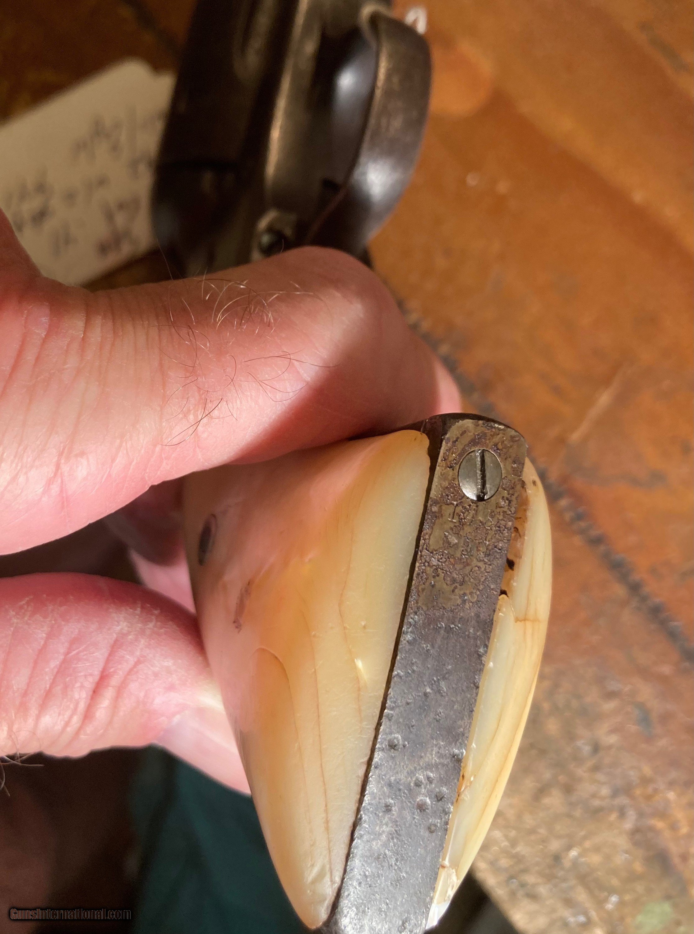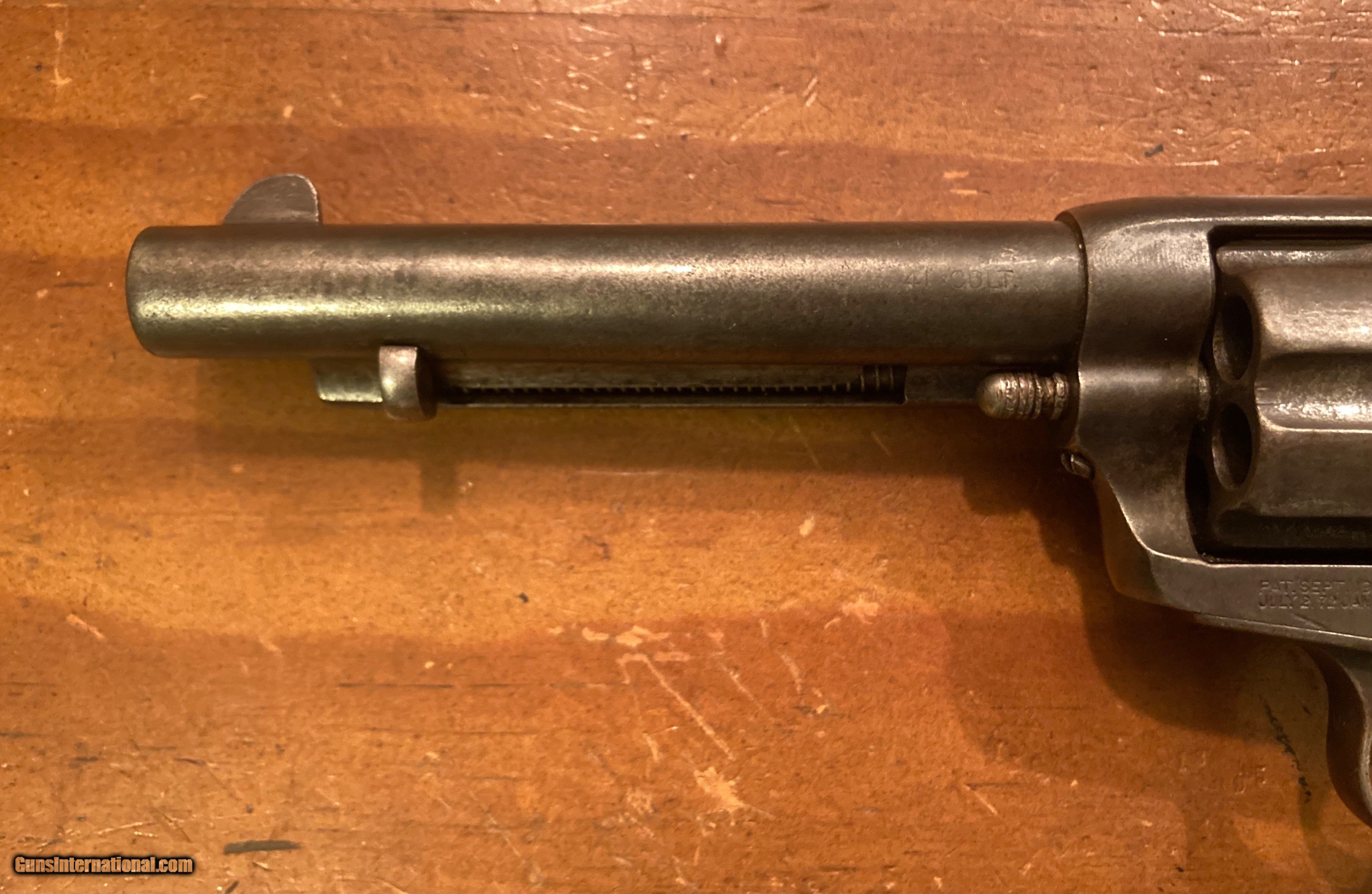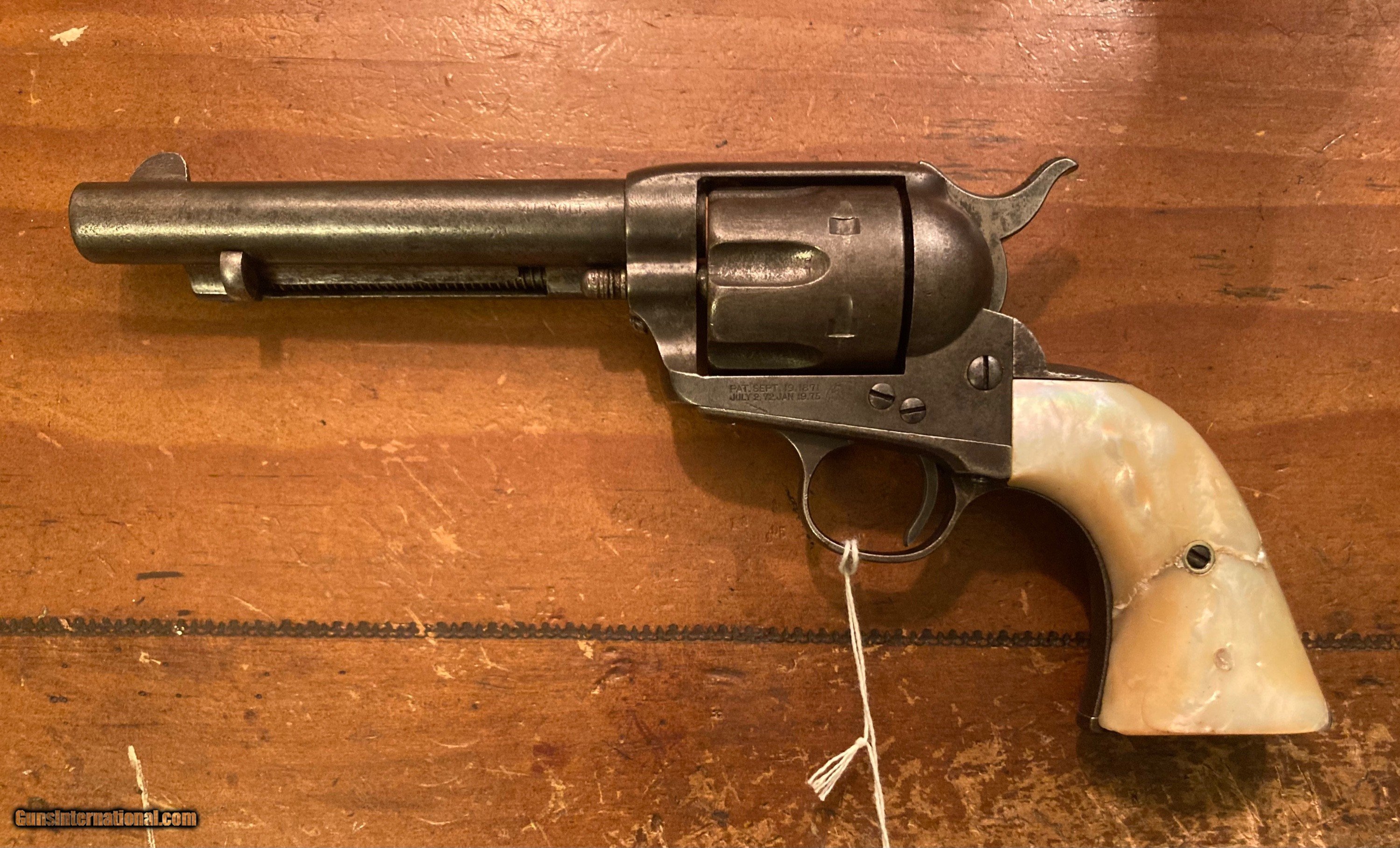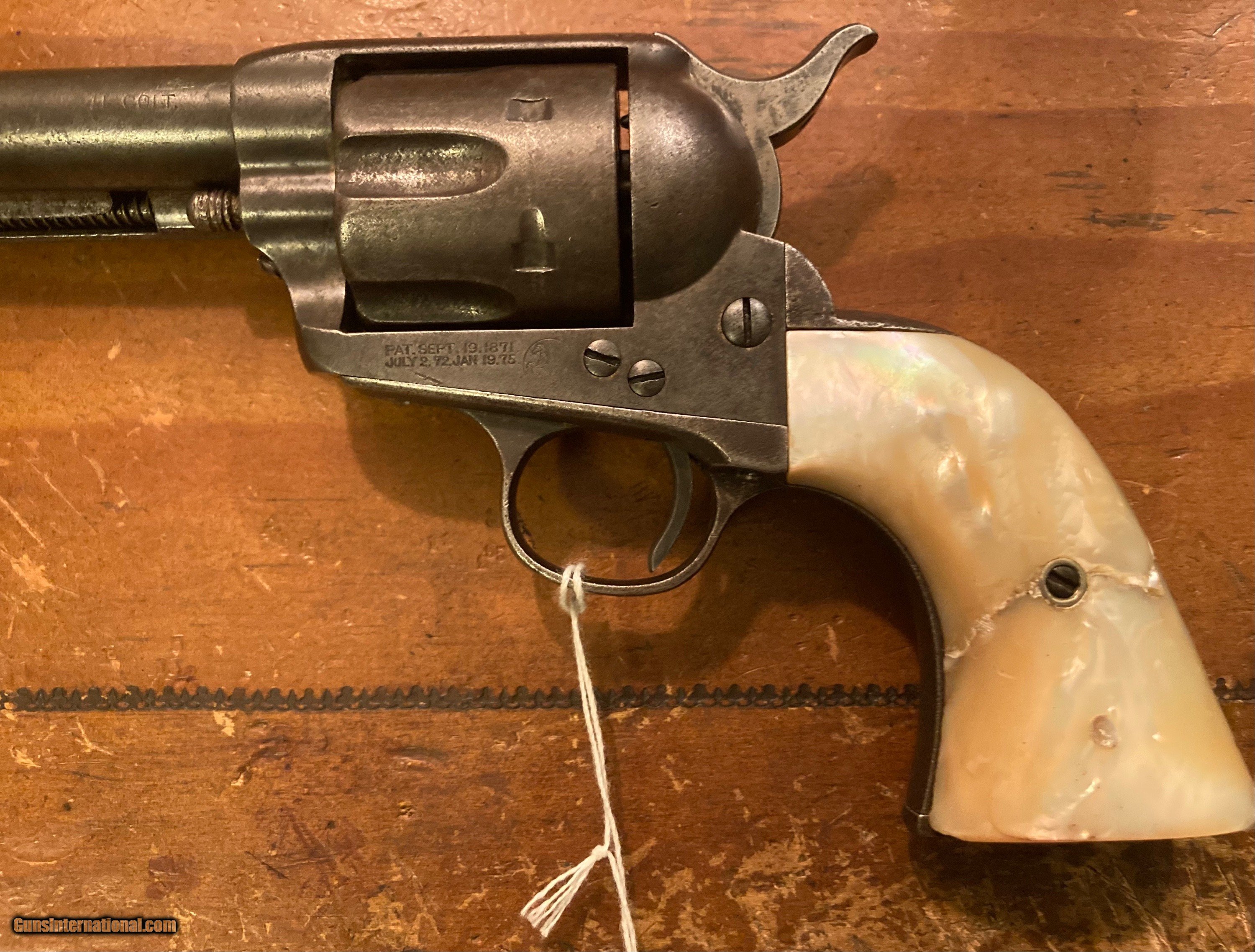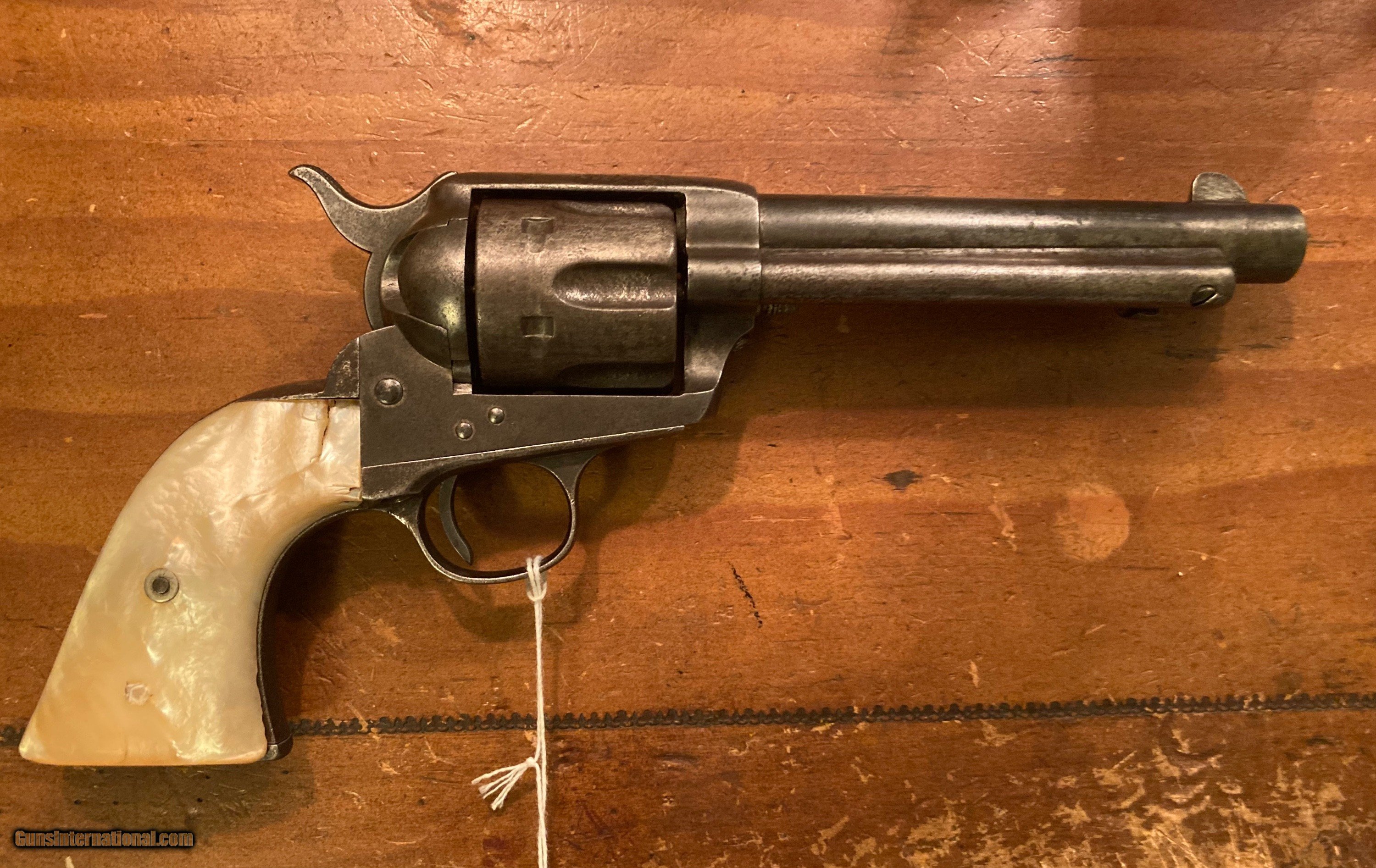 Description: Very scarce early Colt black powder .41 caliber shipped in 1892. Single action SAA .41 with 5 1/2 barrel with pearl grips. You just don't see many .41's this early. Nice old original gun with well worn pearls. Matching serial numbers. The back strap has old corrosion and harder to photograph but the serial numbers match. I don't clean these to show photos better. The grips show cowboy use and some repairs but are solid and usable. I don't have the letter but configuration is as it was sent from Colt to Simmons in 1892. 5 1/2 barrel, blue without mention of grip type. Action is good and tight with typical black powder bore ( which means functional for a 132 year old gun but you can't see your reflection in it). I like old Colts and will always discuss trade options or offers. See photos as part of the description and email or call with questions. This is an antique and ships direct for $35.00. Matt 214-957-7574 SOLD Antique: Yes Manufacturer: Colt Model: SAA single action |