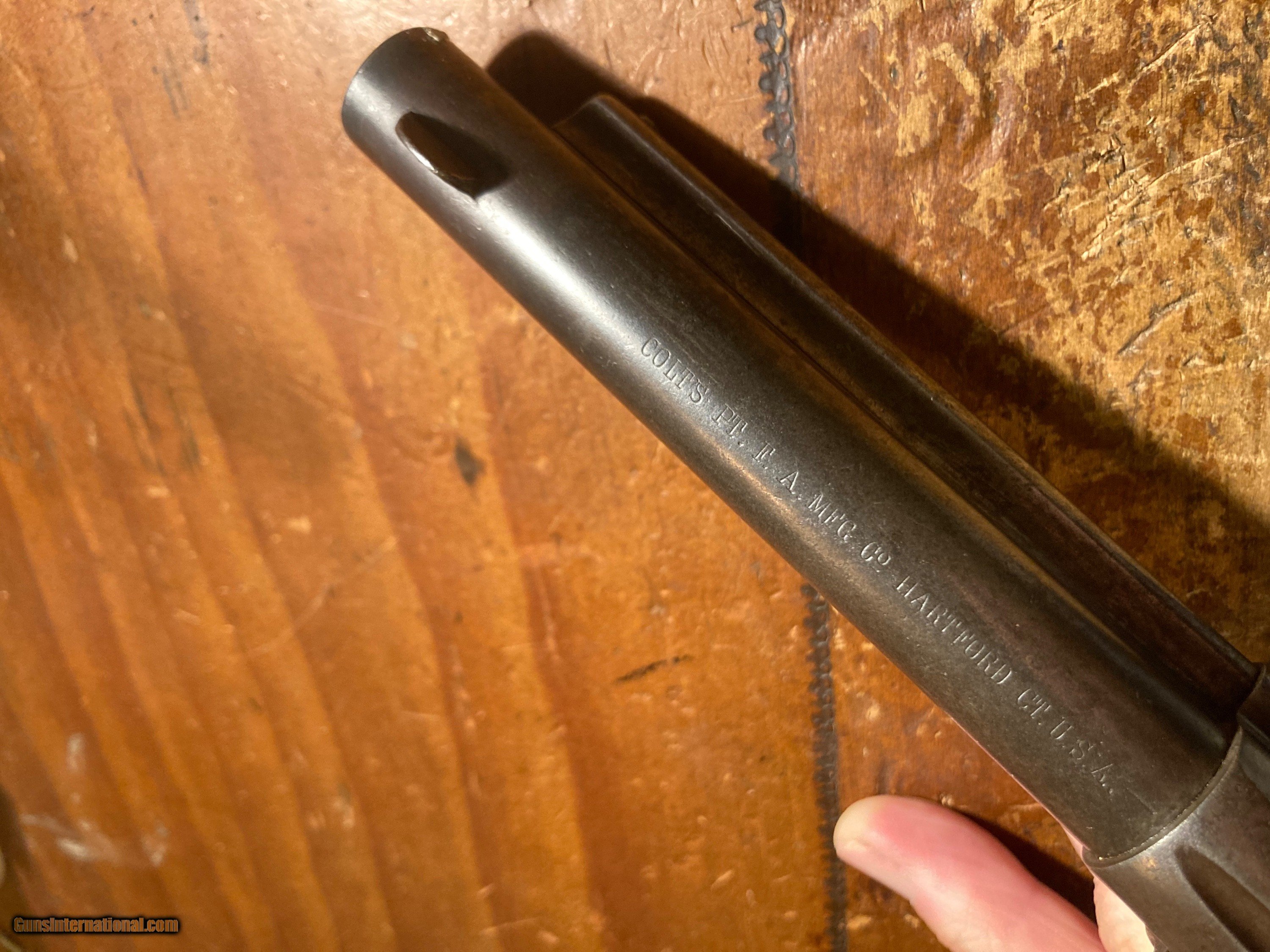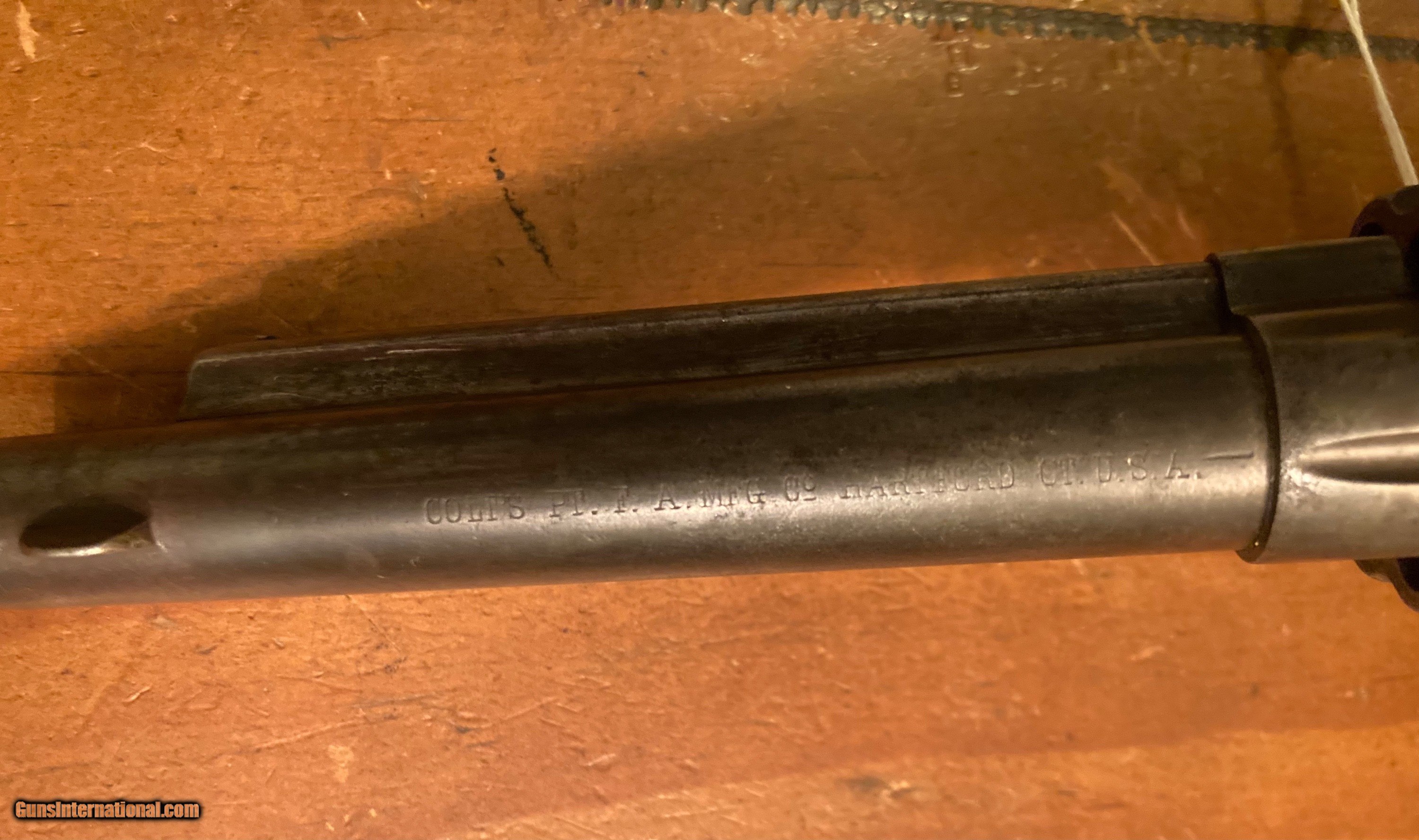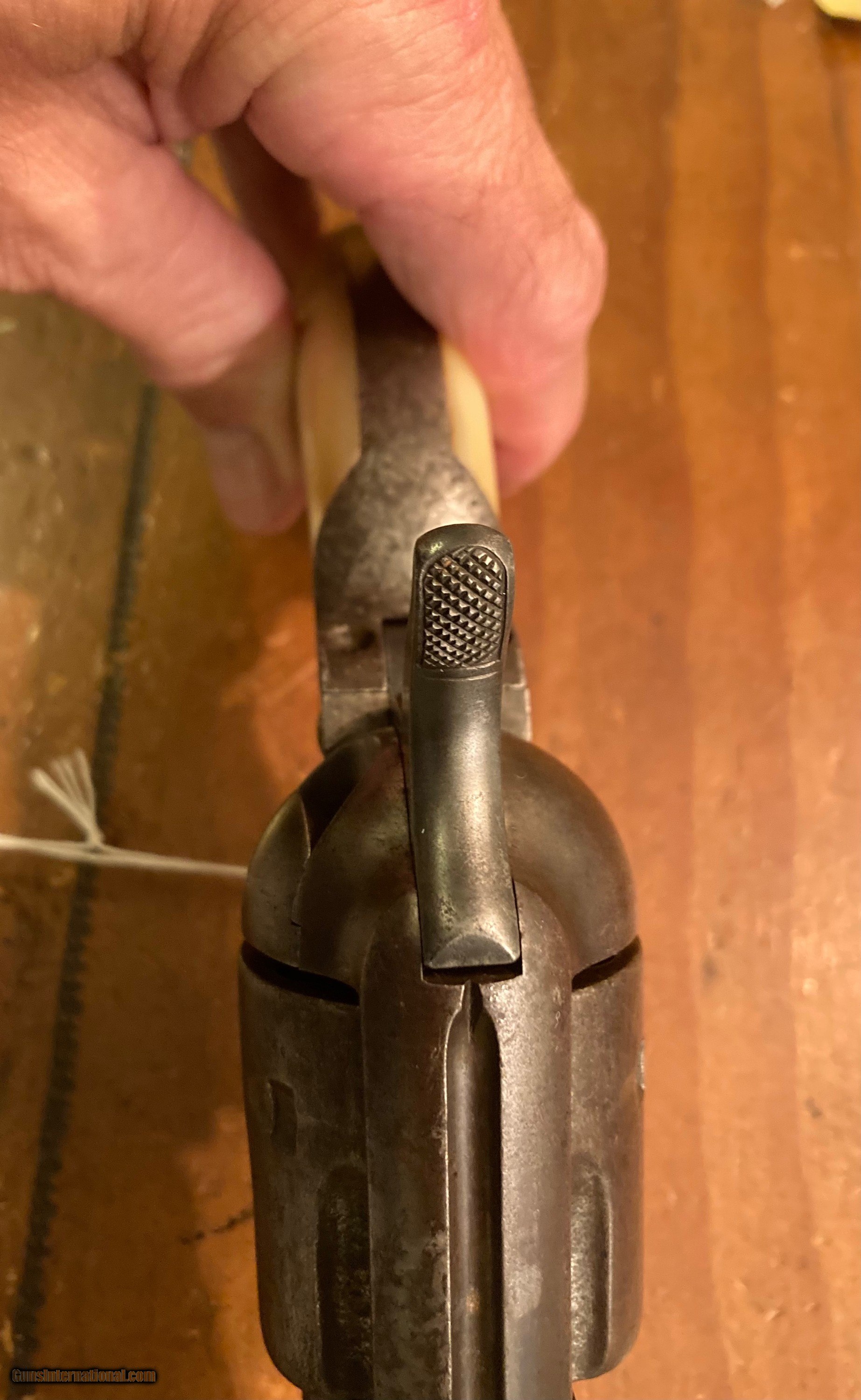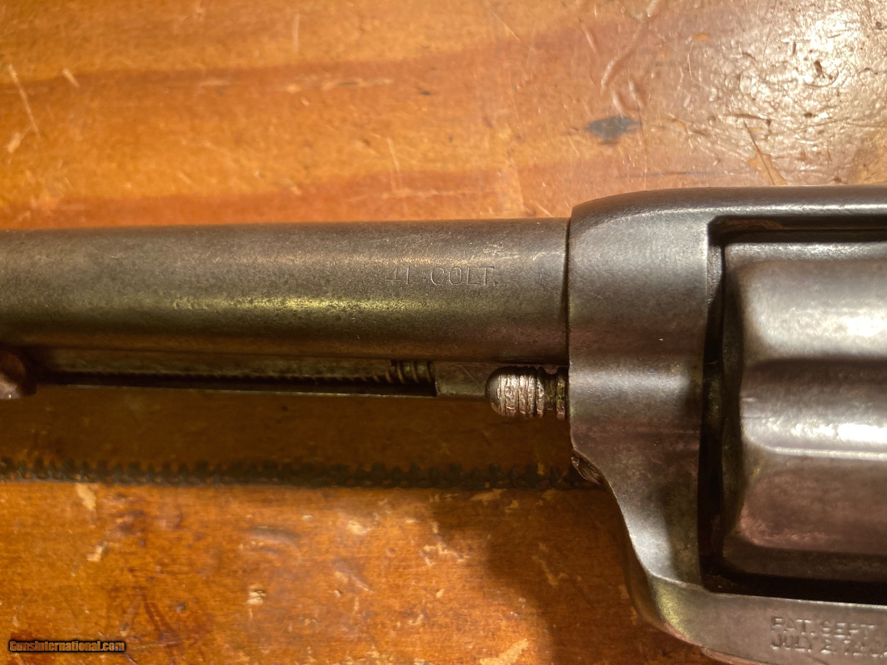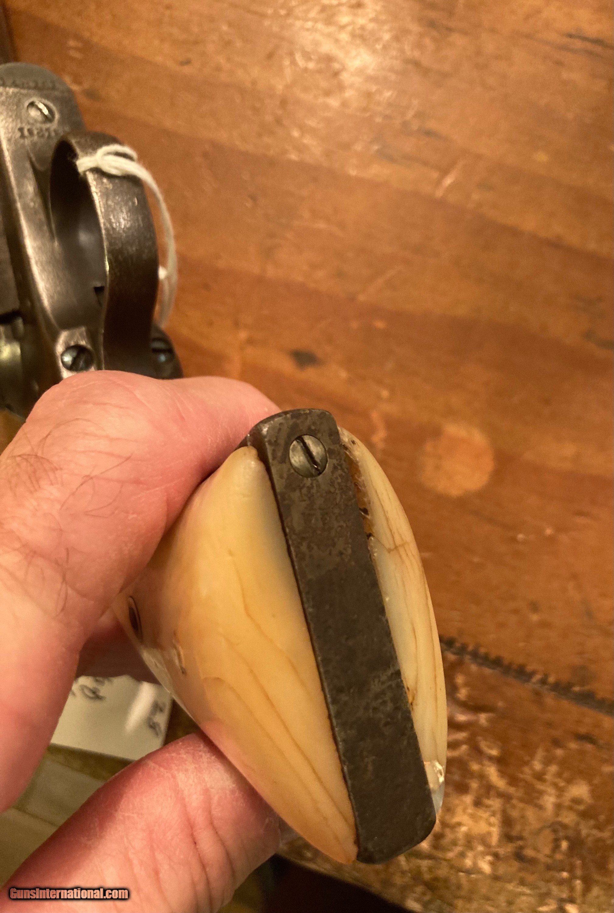Description: Very scarce early Colt black powder .41 caliber shipped in 1892. Single action SAA .41 with 5 1/2 barrel with pearl grips. You just don't see many .41's this early. Nice old original gun with well worn pearls. Matching serial numbers. The back strap has old corrosion and harder to photograph but the serial numbers match. I don't clean these to show photos better. The grips show cowboy use and some repairs but are solid and usable. I don't have the letter but configuration is as it was sent from Colt to Simmons in 1892. 5 1/2 barrel, blue without mention of grip type. Action is good and tight with typical black powder bore ( which means functional for a 132 year old gun but you can't see your reflection in it). I like old Colts and will always discuss trade options or offers. See photos as part of the description and email or call with questions. This is an antique and ships direct for $35.00. Matt 214-957-7574 SOLD Antique: Yes Manufacturer: Colt Model: SAA single action |