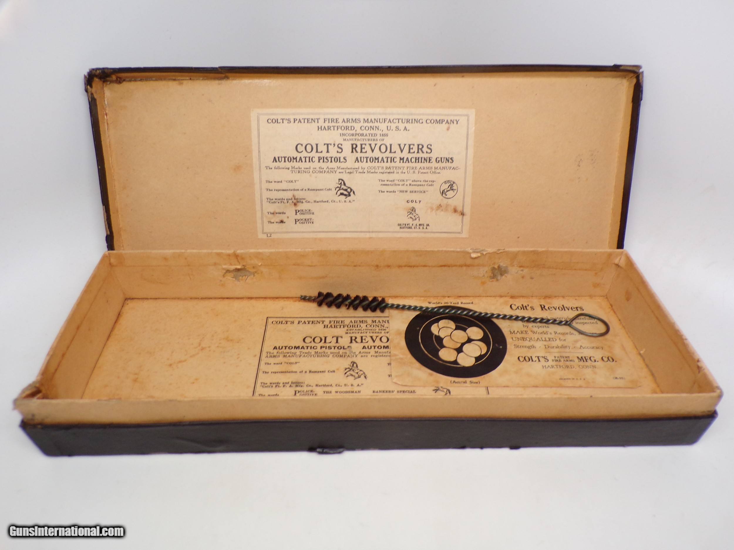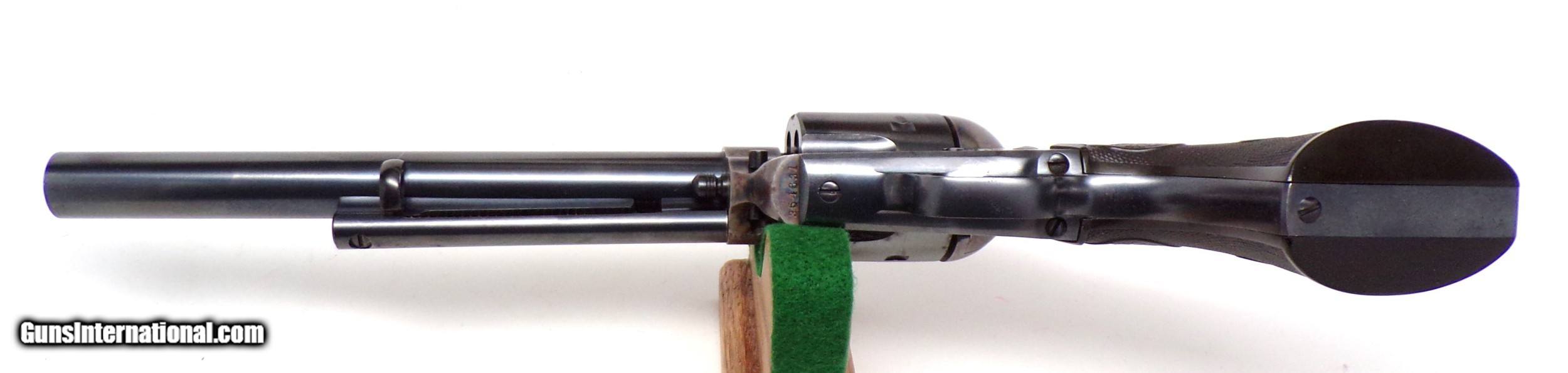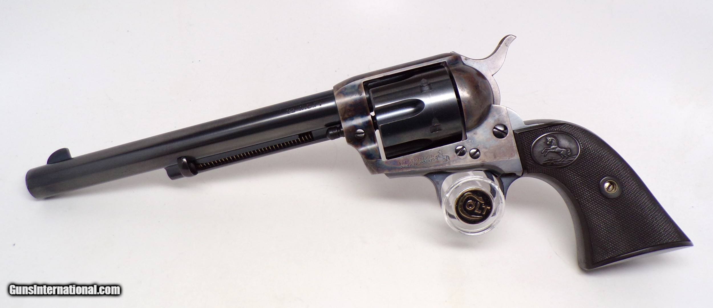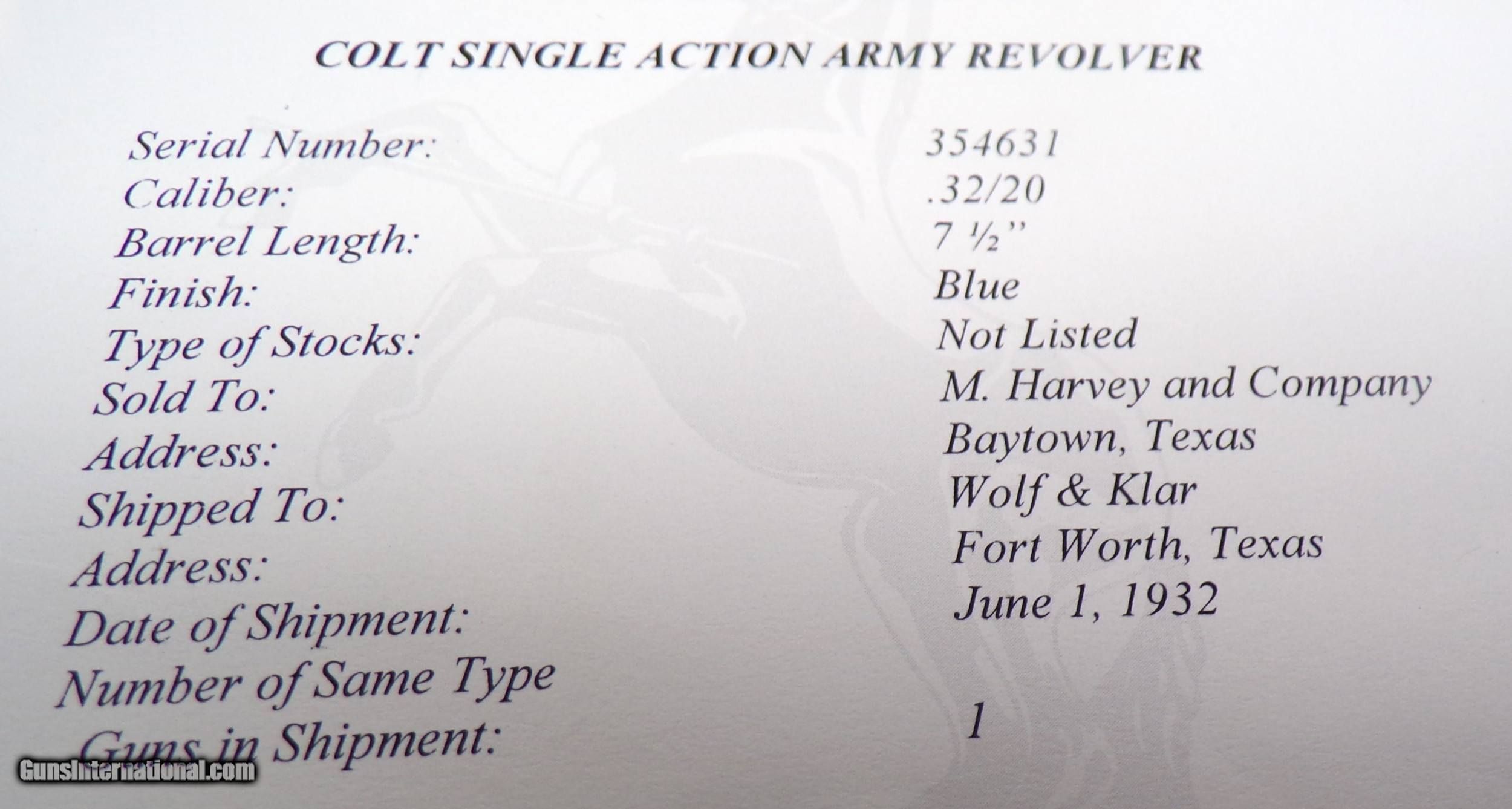 Description: SOLD As you can see in the pictures this is a nice Colt Single Action Army. On June 1, 1932 it shipped to Wolf & Klar, Ft. Worth, Texas for M. Harvey and Company of Baytown, Texas. This .32 caliber revolver was in a one gun shipment. Bore in the 7 1/2" barrel is bright and shiny. It shows little use. Action is smooth and it locks up fault tight. No Play in the cylinder. Grips are excellent and show virtually no wear. Fit is perfect, as you would expect. Notice the condition. A very high percentage of the original case color remains. Same for the original blue. Screws are excellent and don't seem to have been turned. All markings are clear and original. With the revolver you will also receive the original numbered box. The pictures of the revolver and the box clearly and fairly show the condition. Along with the box and revolver you will receive a hand written letter from the nephew of the owner. The letter states his dad and uncle moved to Texas from Missouri in 1936. There must have been another owner prior to Uncle Everett or the gun sat for a few years in the hardware store. Doesn't really matter though. You will like this Colt Single Action. It is nice enough for any collection. SOLD |