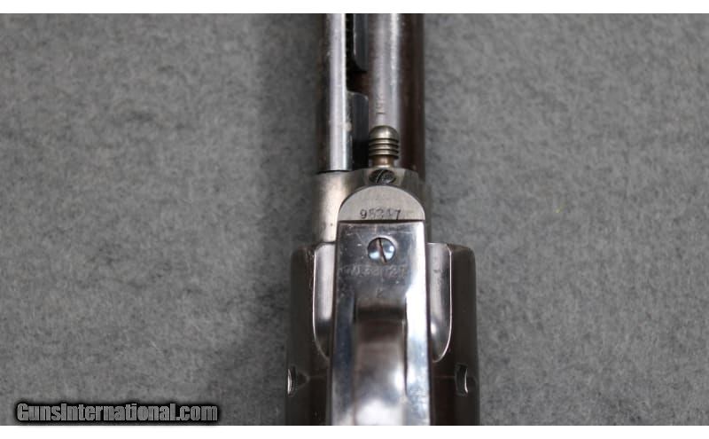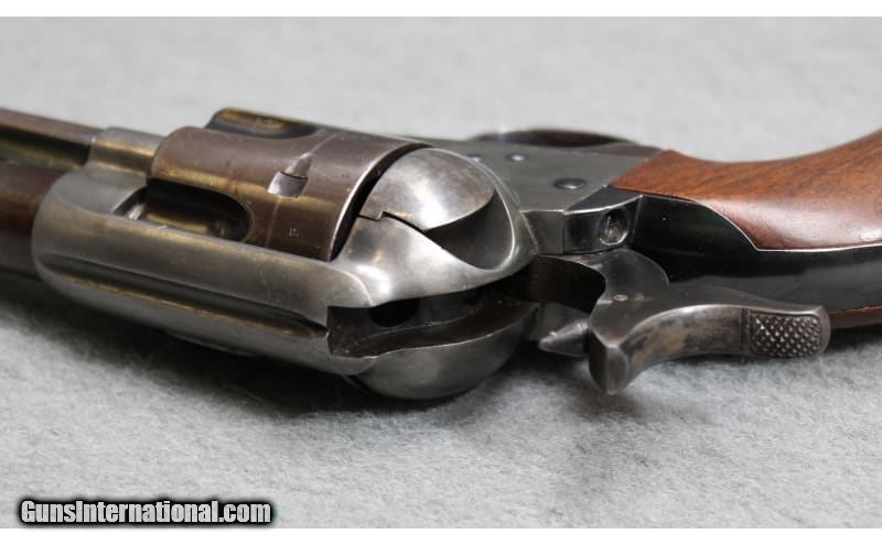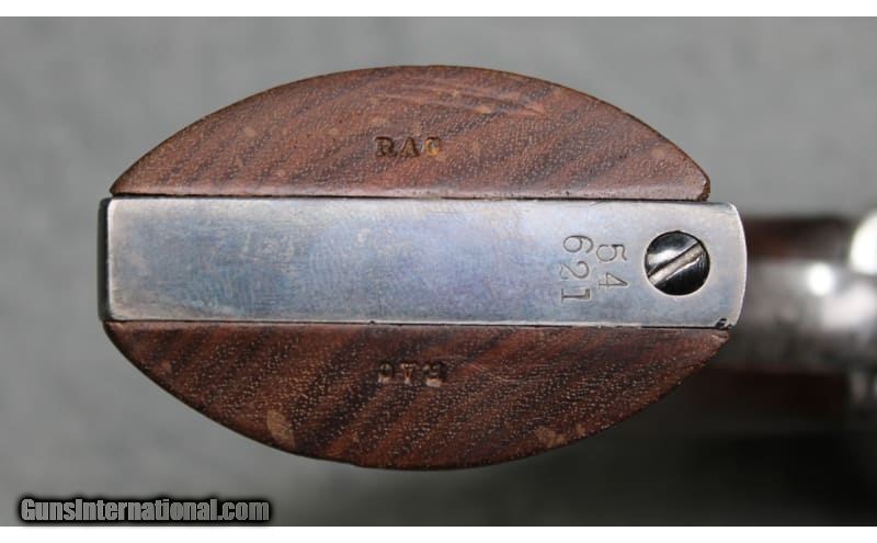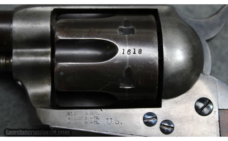 Description: U.S. marked Colt Single Action Army chambered in .45 Colt. The serial number (95347) dates the "DFC" inspected frame of the revolver to 1883. Like most U.S. contract revolvers, it started its life as a Cavalry Model with 7-1/2 inch barrel and was arsenal refurbished with the barrel cut down to 5-1/2 inches. The mass arsenal rebuilds resulted in a mix of serial numbers and markings. The trigger guard ("138727") dates to 1891 and the back strap ("54621") dates to 1880. "RAC" inspector stamped on the butt of both grips. The left side of the frame has the two-line address followed by "U.S.". No accessories. .45 Colt SOLD Antique: Yes Metal Condition: "Good with Handling Marks, Finish Wear, and Light Pitting Wood Condition: "Good with Handling Marks, Dings, Scratches, and a Chip at the Right Toe Bore Condition: Mostly Shiny with No Pitting Barrels: 5.5 inch Item Location: Fort Worth, TX |
