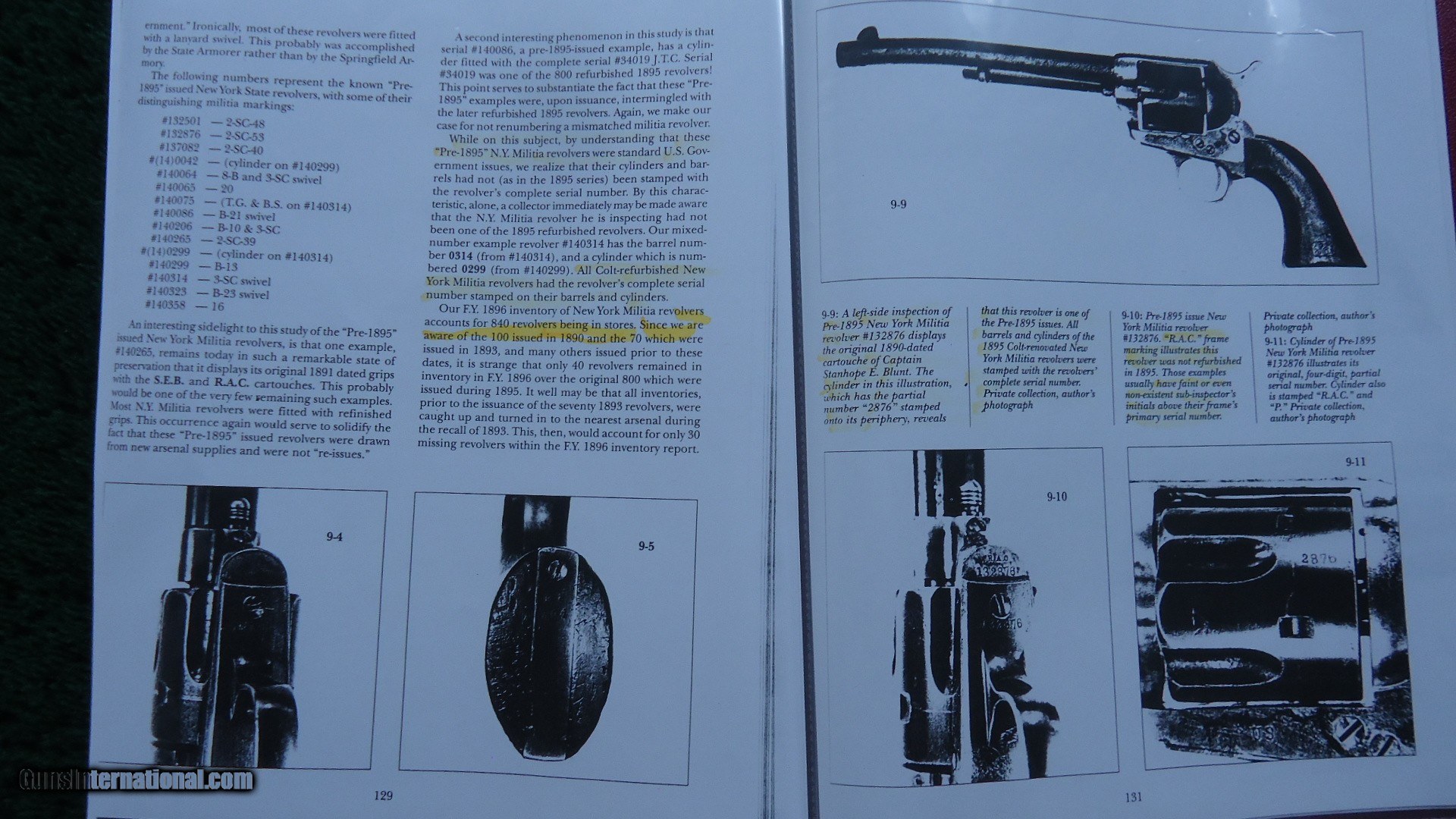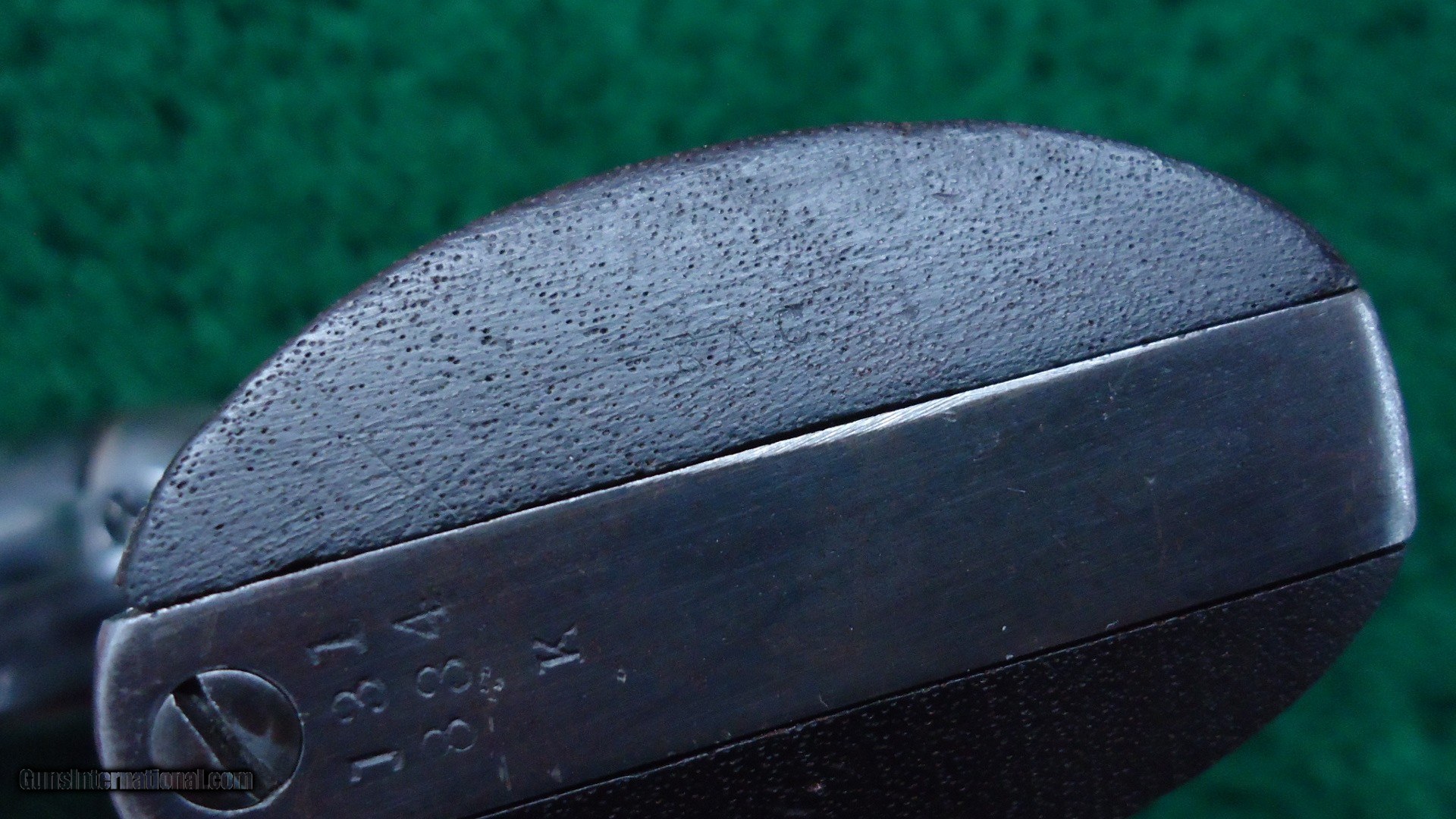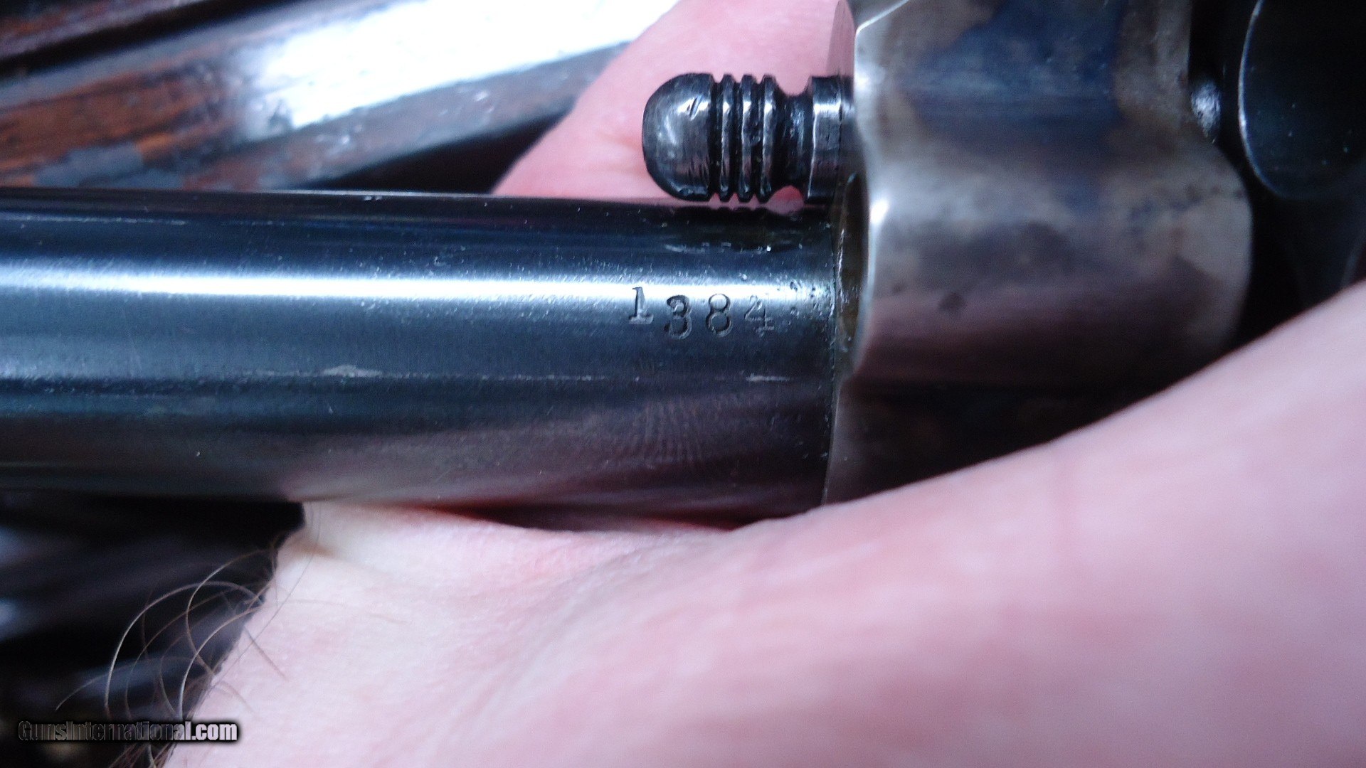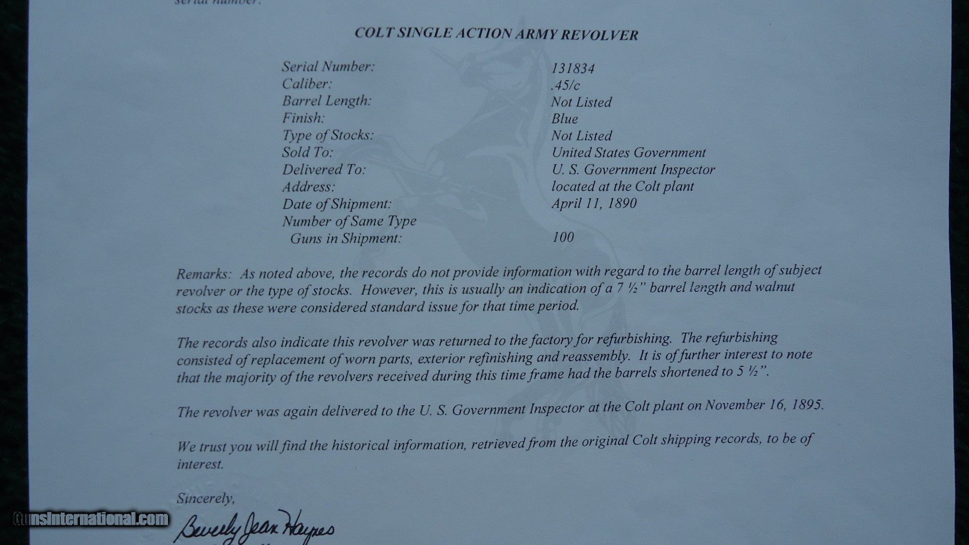 Description: This gun is in fantastic condition with virtually all of the old arsenal refinish. Original grips show very little use with a visible cartouche. Mechanics are good. 131k serial range. Barrel address is somewhat lighter than usual due to the refinish polishing. Complete with a Factory Letter and some other informational documents. Gun is in fine condition with all matching numbers including inspector marks. "RAC" on the frame. Original grips have a cartouche and dated 1890. Gun comes with a Factory Letter showing it was ordered by the US Government and shipped April 11, 1890. Also at the bottom are remarks about the barrel length not listed as well as the stocks not listed. This is usually an indication of 7-1/2 inch barrel and walnut stocks as these were considered standard issue at the time. It also states it was returned to the factory for a refinish and again returned to the US Government Inspector on November 16, 1895. This is a very scarce gun. This gun appears original inside and out except for 3 side screws. Leroy Merz Antique Firearms specializes in antique and vintage Winchesters and other fine American firearms. Since 1965 Mr. Merz has taken part in the world of firearms and has been a contributor to many well known reference books. We have hundreds of additional guns in every price range at our home online. Search for Merz Antiques in google. SOLD Antique: Yes Handgun Caliber: .45 Colt |