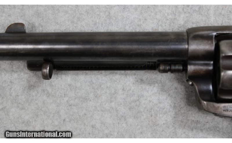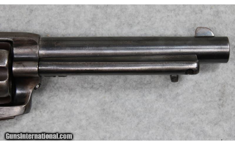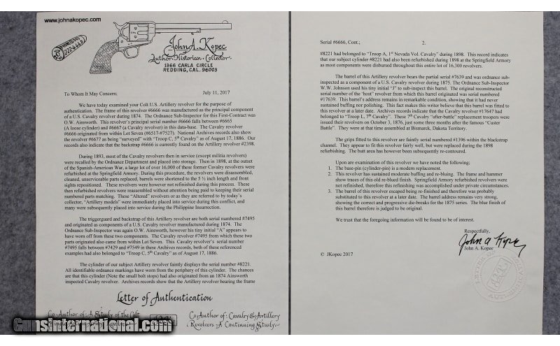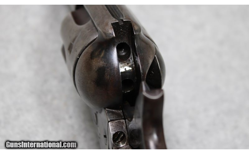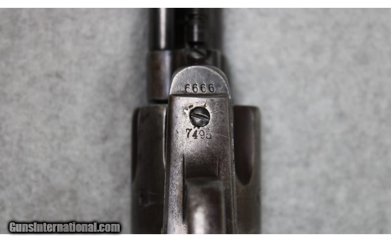 Description: U.S. marked Colt Single Action Army chambered in .45 Colt. The serial number (6666) dates the frame of the revolver to 1874 and it probably started its life as a Cavalry Model with 7-1/2" barrel. The gun appears to have been arsenal refurbished and the barrel cut down to 5-1/2 inches. From 1895 to 1903 several "U.S." marked Single Action Army revolvers were returned to either the Colt factory or Springfield Armory where they were dismantled, refinished, and modified to 5-1/2-inch barrel length for use with smokeless powder. The mass arsenal rebuilds resulted in a mix of serial numbers and markings. The underside of the barrel is stamped with a "P" proof and inspector initial "J" (W.W. Johnson). The left side of the frame has the two-line address followed by "US." Comes with a Kopec letter that describes in detail the history of the revolver. .45 Colt SOLD Antique: Yes Metal Condition: Good with Handling Marks and Scratches Wood Condition: Good with Handling Marks and Wear Bore Condition: Clear with Good Rifling Barrels: 5.5 inch Weight: 2 lbs 4 oz Item Location: Fort Worth, TX |