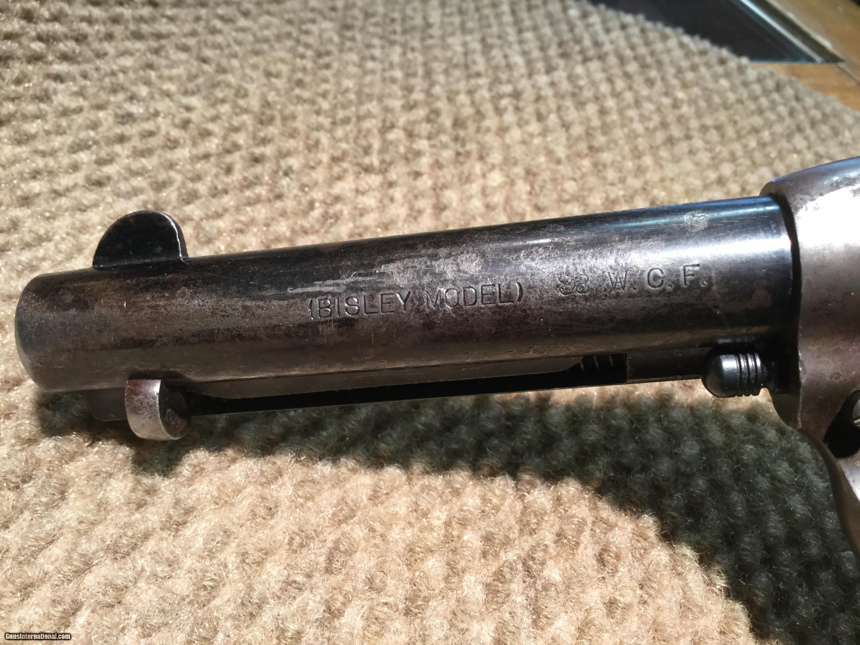 Description: This is a Colt Bisley in 38-40 cal . This colt has the 4 3/4 barrel with very old real stag grips.lots of original blue on frame and barrel, Bore is shiny and nice very tight gun ,good timing, locks up tight.very nice, Made in 1906. I hope i look this good after a 111 years . Please see all pictures, Call for question Richard. 406-407-0698. SOLD Curio/Relic: Yes Manufacturer: Colt Model: Bisley Serial Number: 282697 Caliber Info: 38-40 |