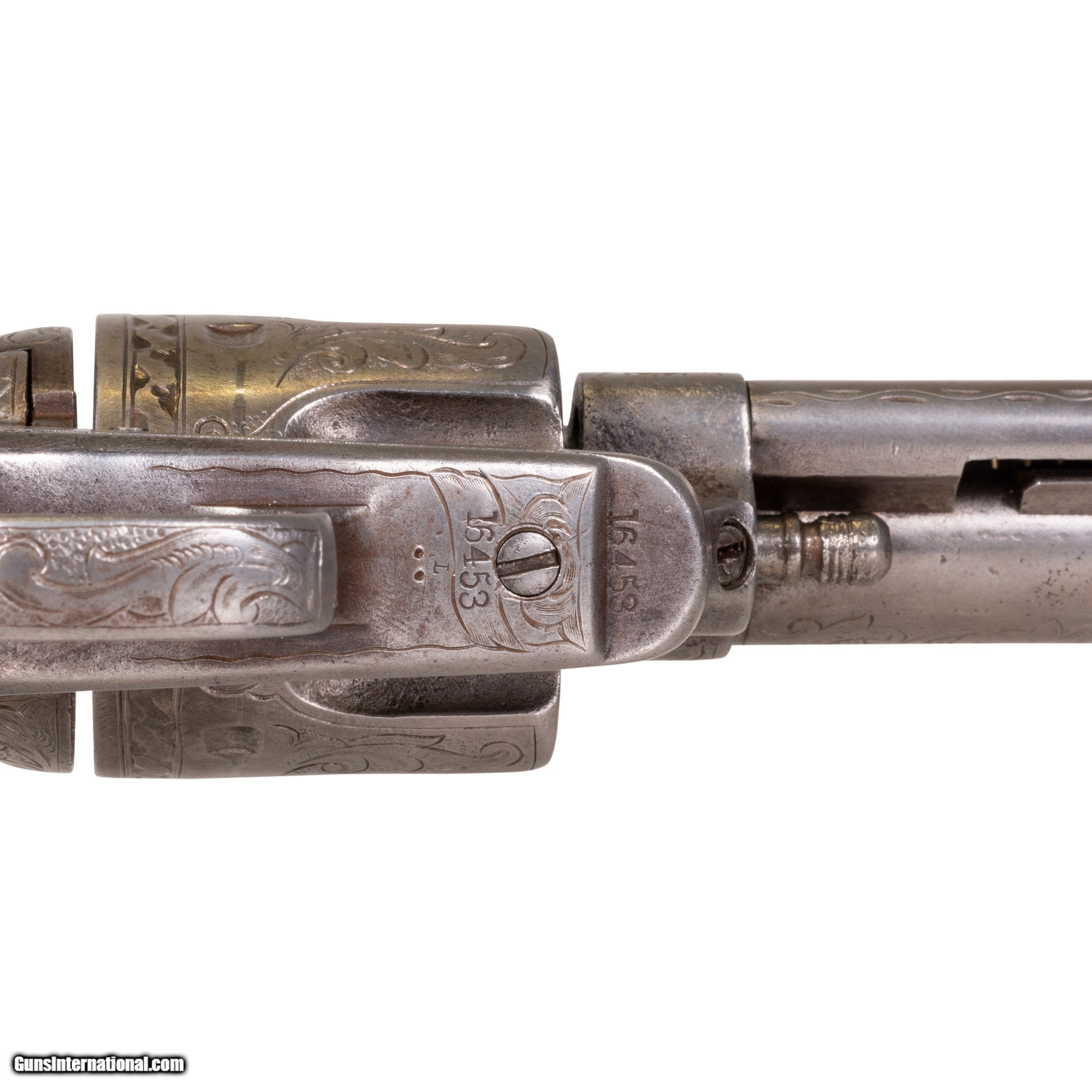 Description: Condemned Colt Single Action Army with Engraving SAA 45 cal. Serial #16453. 7 1/2" barrel. Was part of the US Army contract of 1875 per Kopek "Study of the SSA" but was condemned during its inspection and consequently sold to the civilian market. It was shipped to HND Folsom Arms Co. (letter included), New York on June 29, 1876. It was dual inspected by A. P. Casey and Samuel B. Lewis, both sub-inspectors in 1875. The appropriate "C's" and "L's" are still showing. The "C" for condemned is on the forward left trigger guard. The one piece ivory grips are bonded together by a wooden block. The ivory is beautiful with no cracks and is yellowed as would be expected for the age with slight shrinkage. The grips fit well and look great. The frame has a one line only patent date "July 2, 1872". The top date appears to never have been there. The "Peacemaker Enclyclopedia" by Cochran states that a broken die causes factory error and also shows up on serial #s 14614, 15447, and 16428. This Colt is completely period engraved. It was fitted with one piece, ivory grips, not noted in the letter. All the parts appear to be original with the exception of the cylinder pin screw which is an old period replacement. The cam was replaced on the hammer by the "Peacemaker Specialists" and now functions perfectly. The gun is a worn grey metal color and shows use and carry with just traces of blue showing in protected areas. The barrel is the original 7 1/2" with rounding at the muzzle from holster use. The bore is good to very good. The early slanted barrel address is fully visible and all other markings are clear and all numbers match. The engraving is of the period and very nicely done. It is worn from use but shows nicely. This Colt was found in Oregon. Comes with original stamped and spotted money belt holster. Holster 38"L SOLD Antique: Yes Manufacturer: Colt Model: Colt Single Action Army Serial Number: 16453 Caliber Info: .45 |