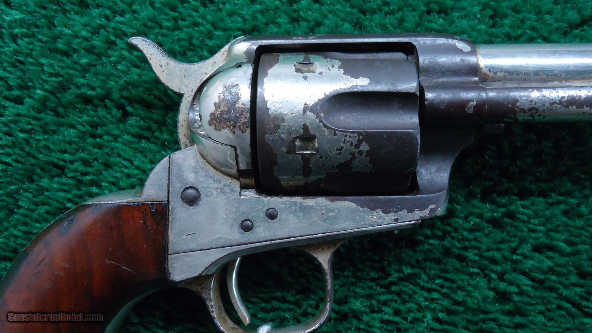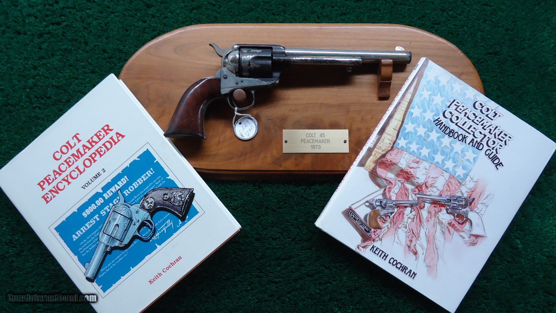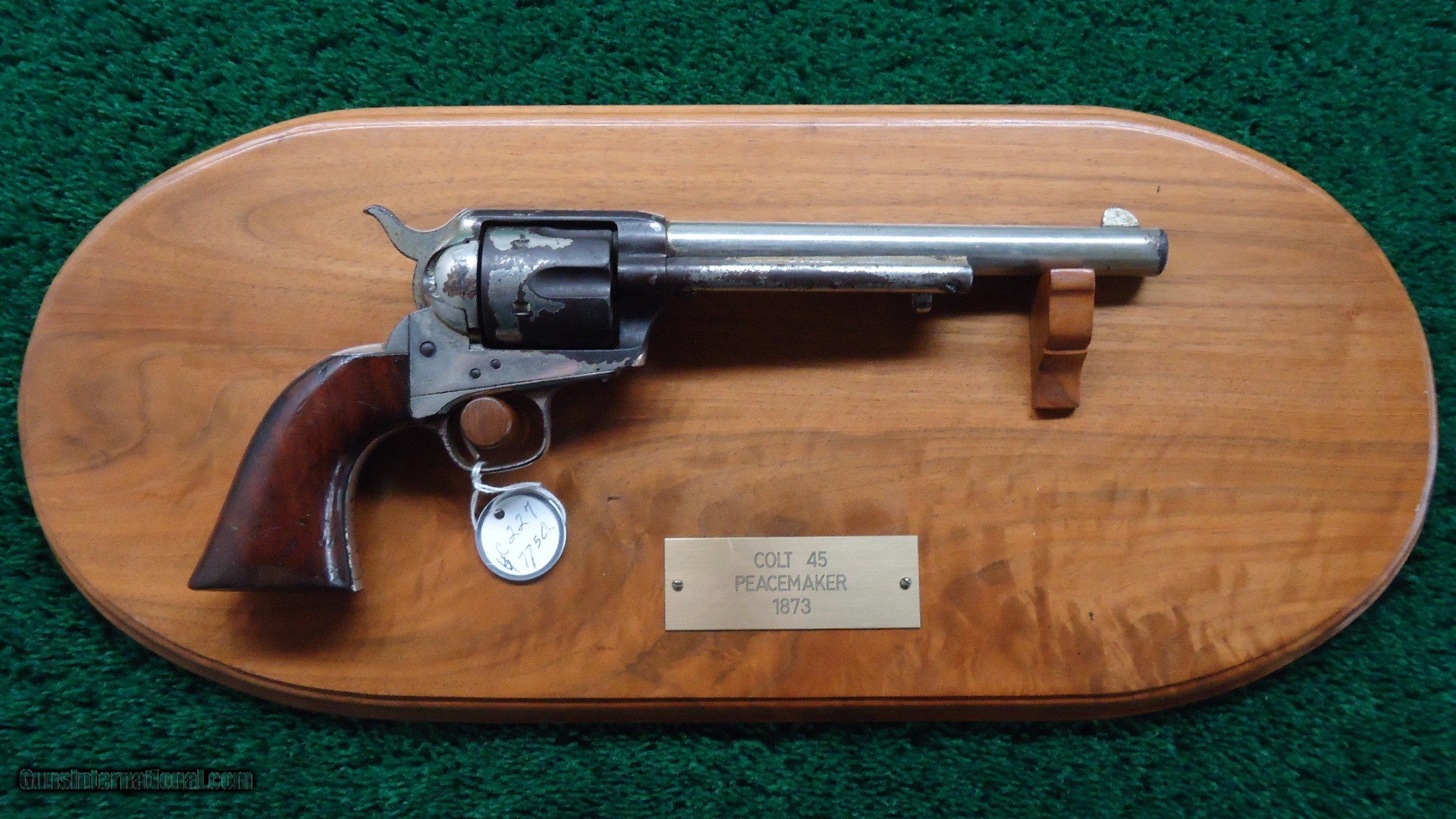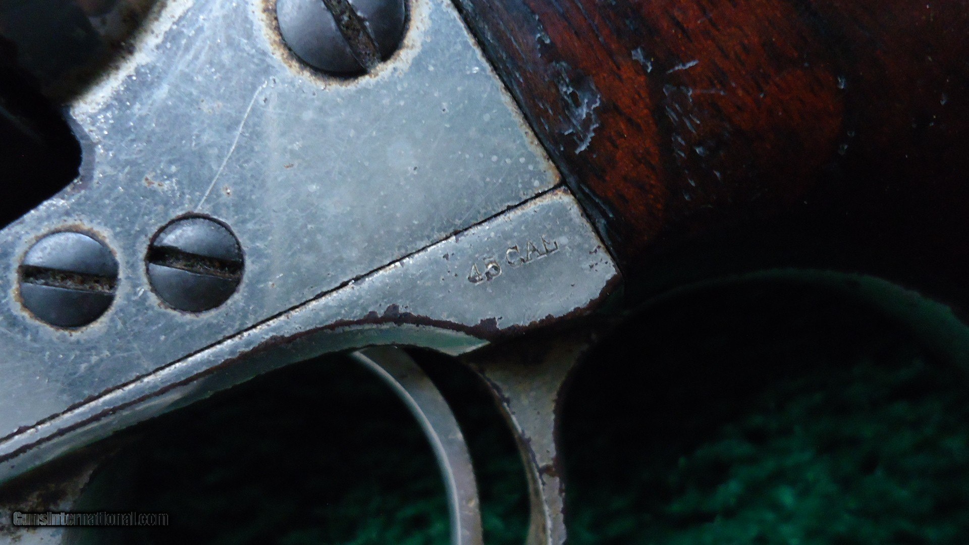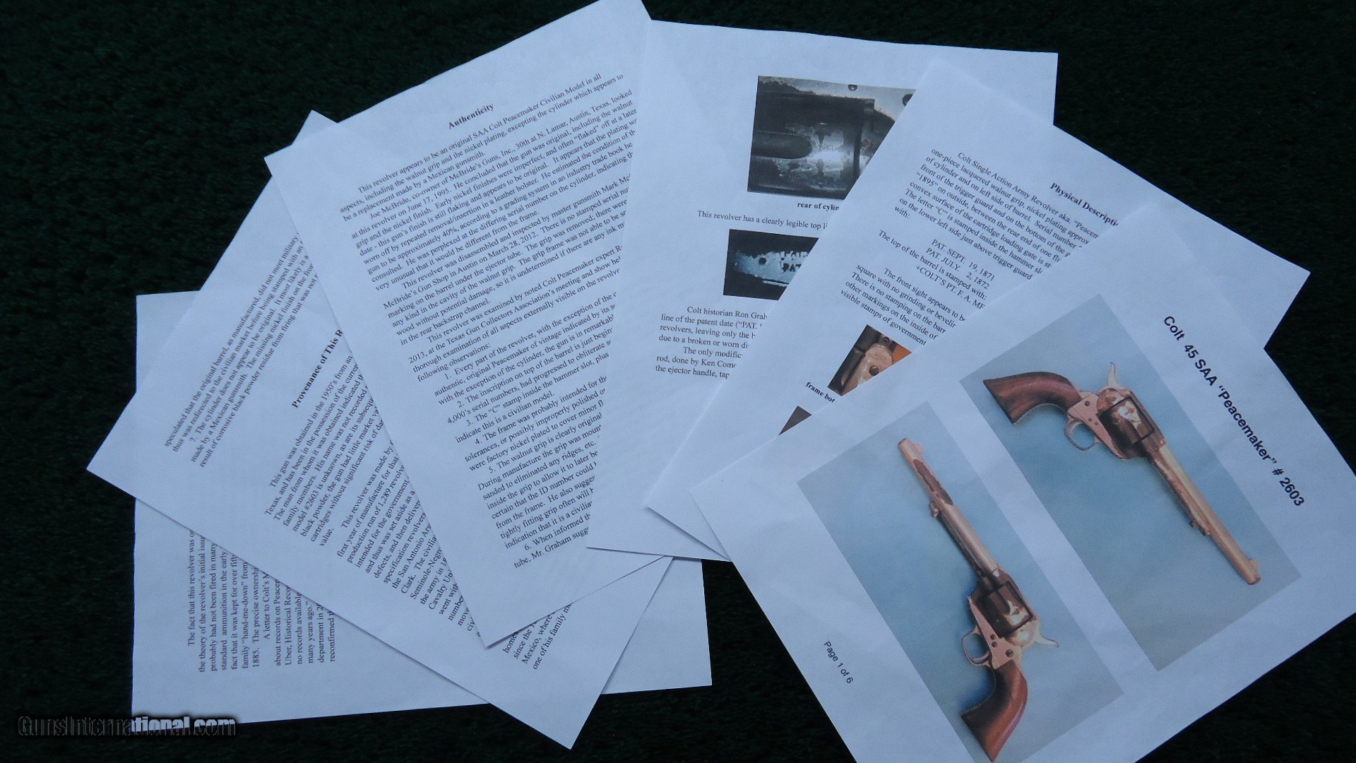 Description: 7-1/2 inch barrel chambered in 45 Colt. Serial number 2603. This gun falls in the middle of about 1200 Colt US marked single actions. It is theorized that it was condemned and has no US markings on it. At that time it was nickel plated for the civilian market. It has been examined by several gun pros with their ideas. Joe McBride, Mark McCord and Ron Graham all confirmed the revolver all original. The serial numbers on it are correct. There is no serial number on the cylinder or the barrel. Both are the correct period for this gun. The wood grips definitely appear original with some varnish added. There is about 65% original nickel with the balance having flaked off the front of cylinder and back of the frame. Comes complete with an interesting table mounted plaque identifying the gun along with providence from individuals stating the gun is correct. Gun was purchased in 1950 in the Austin Texas area from an African American family. They claimed they were descendants of a Seminole African American scout hired by the US Army in 1870 to provide scouting services to the Cavalry. This is a good early numbered gun and comes complete with Rod Cockrum's book Peacemakers Collectors Handbook and Colt Peacemaker Encyclopedia Vol. 2. Also a fair amount of research is included. There is no factory records available. An interesting conversation piece. SOLD Antique: Yes Handgun Caliber: .45 Colt |