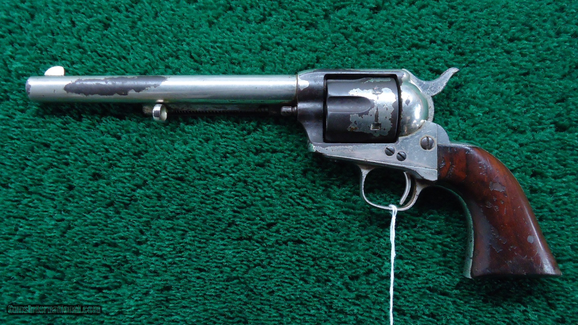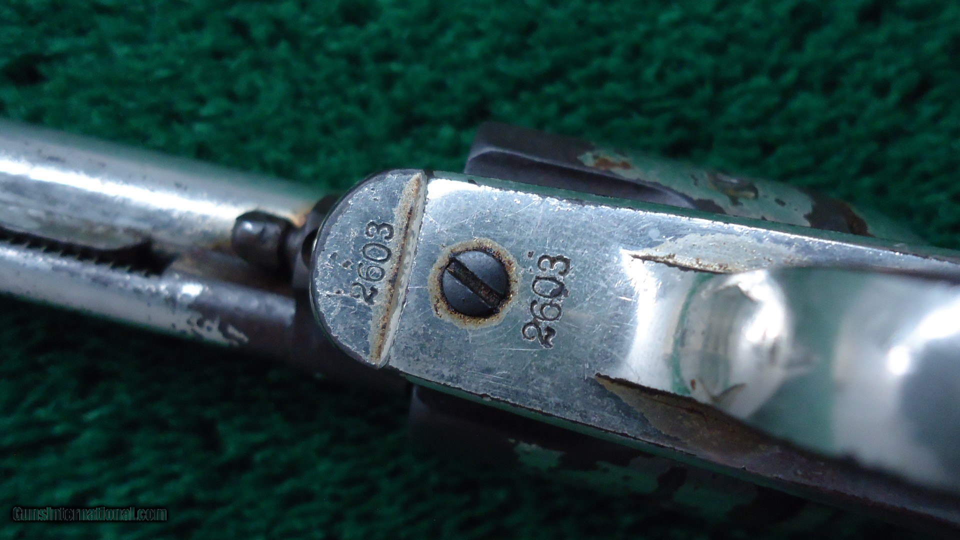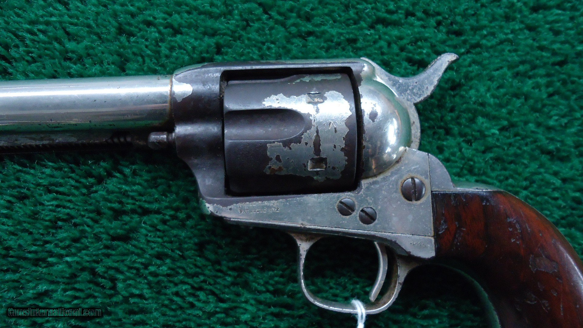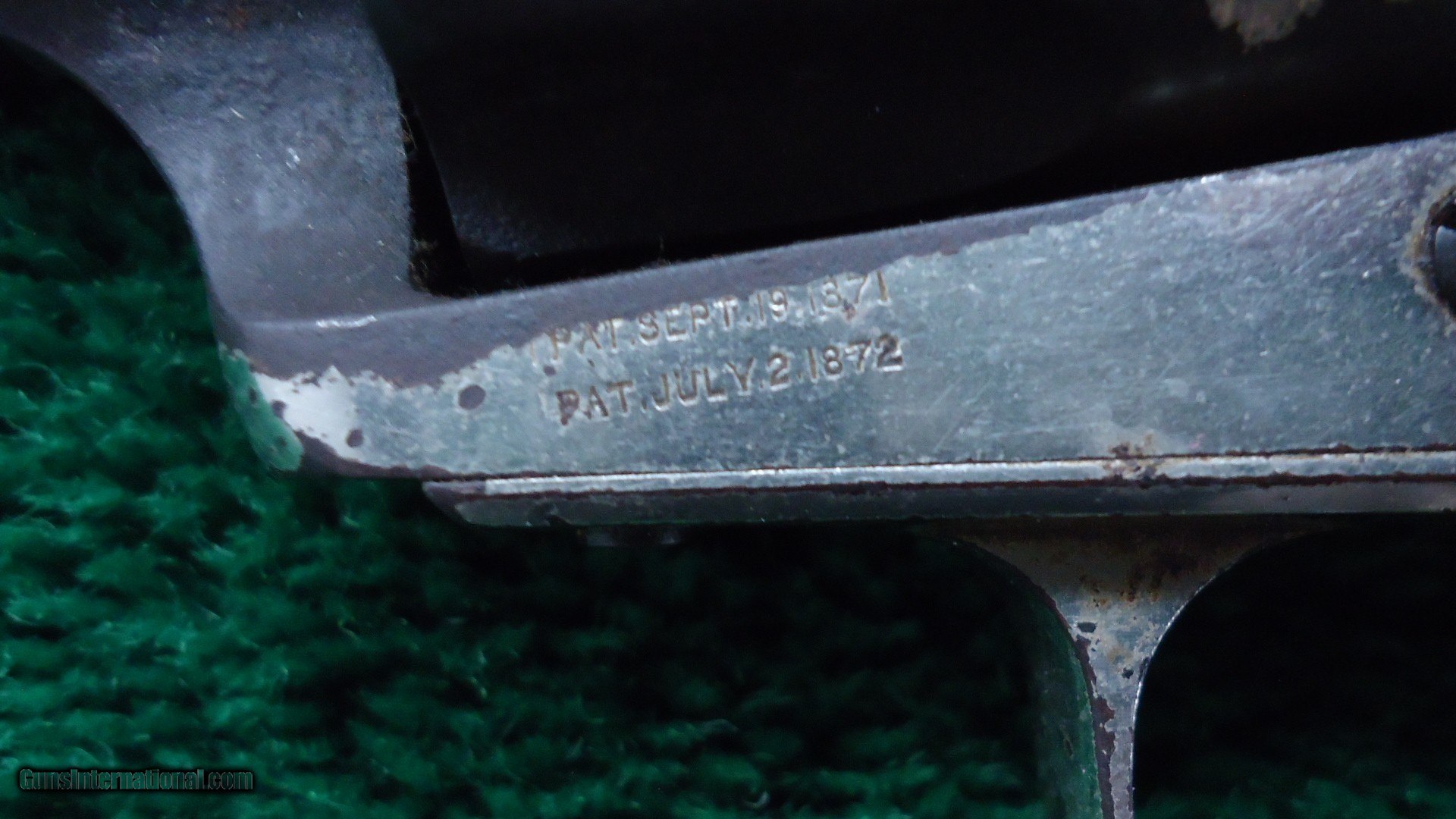 Description: 7-1/2 inch barrel chambered in 45 Colt. Serial number 2603. This gun falls in the middle of about 1200 Colt US marked single actions. It is theorized that it was condemned and has no US markings on it. At that time it was nickel plated for the civilian market. It has been examined by several gun pros with their ideas. Joe McBride, Mark McCord and Ron Graham all confirmed the revolver all original. The serial numbers on it are correct. There is no serial number on the cylinder or the barrel. Both are the correct period for this gun. The wood grips definitely appear original with some varnish added. There is about 65% original nickel with the balance having flaked off the front of cylinder and back of the frame. Comes complete with an interesting table mounted plaque identifying the gun along with providence from individuals stating the gun is correct. Gun was purchased in 1950 in the Austin Texas area from an African American family. They claimed they were descendants of a Seminole African American scout hired by the US Army in 1870 to provide scouting services to the Cavalry. This is a good early numbered gun and comes complete with Rod Cockrum's book Peacemakers Collectors Handbook and Colt Peacemaker Encyclopedia Vol. 2. Also a fair amount of research is included. There is no factory records available. An interesting conversation piece. SOLD Antique: Yes Handgun Caliber: .45 Colt |