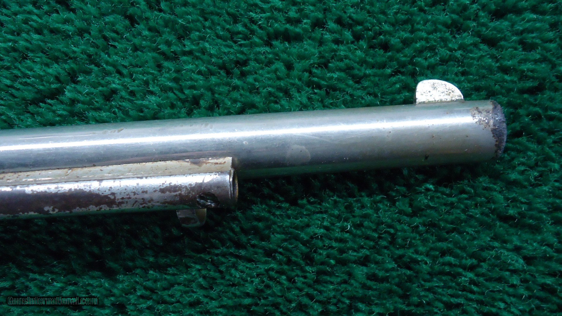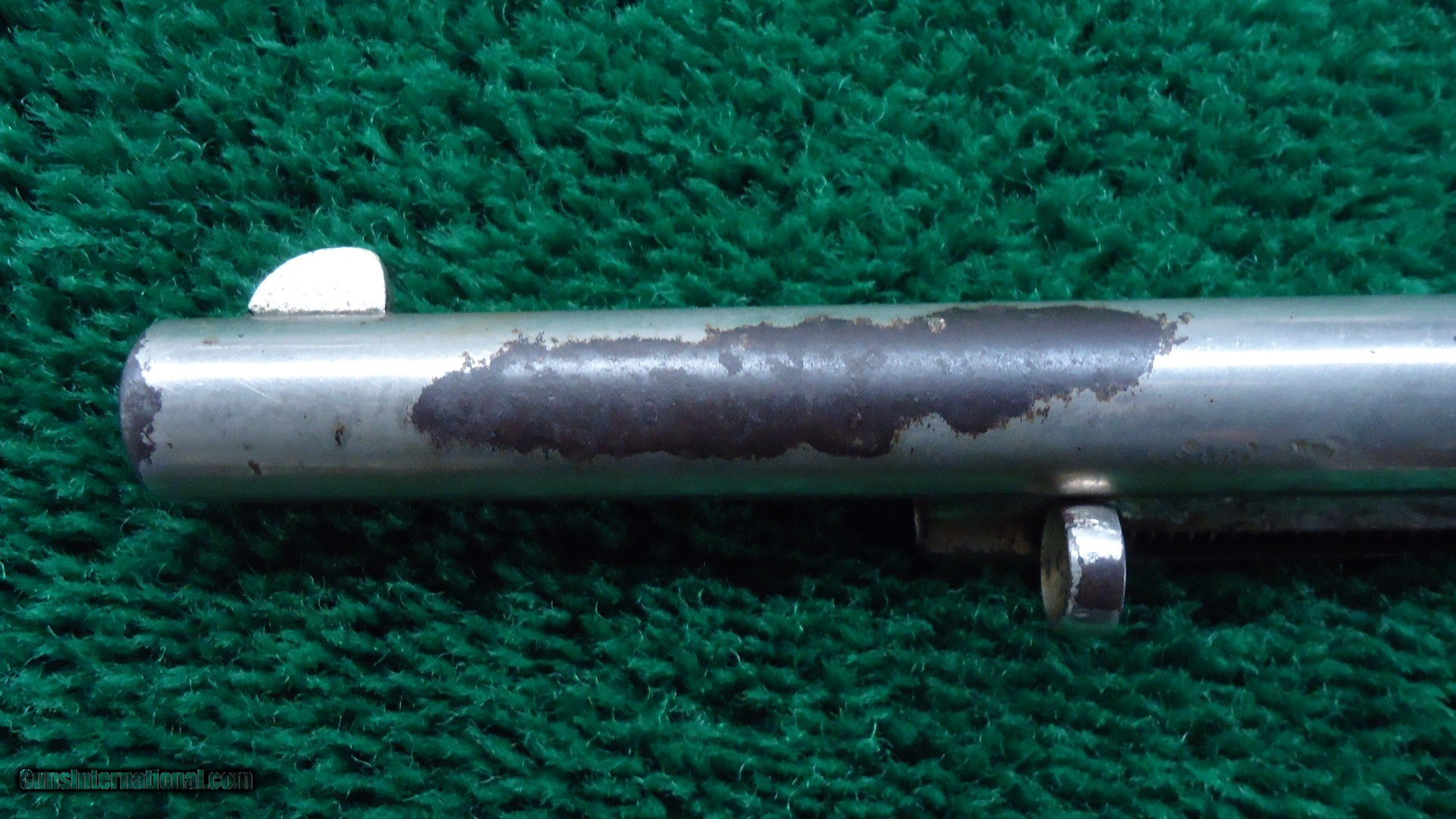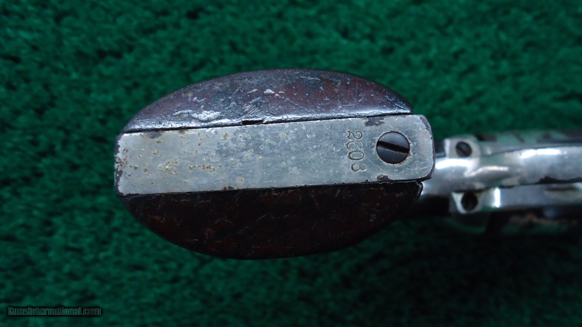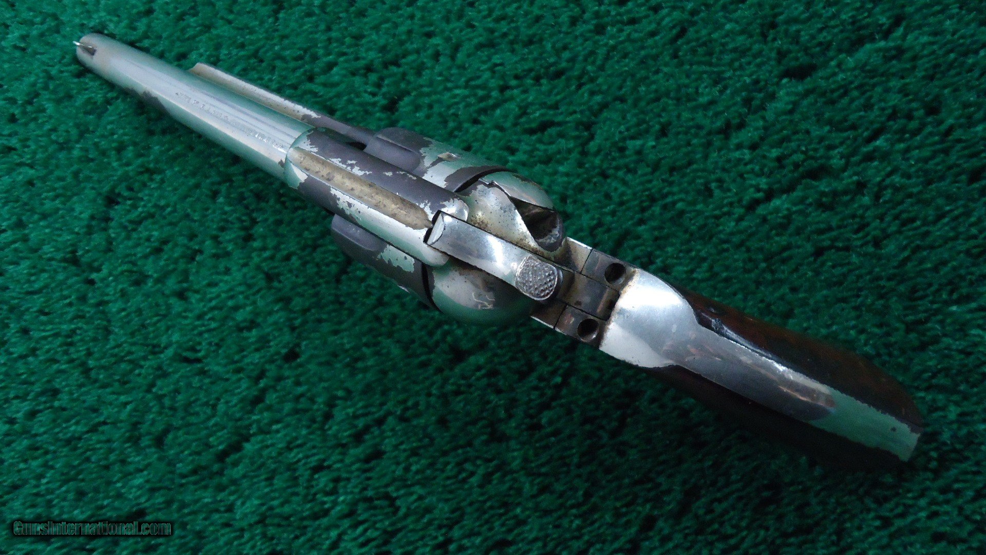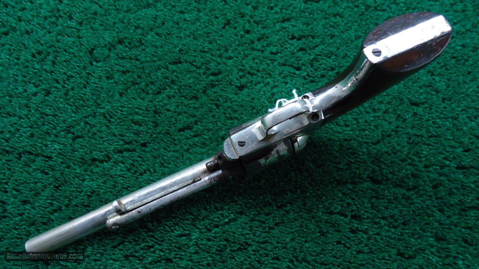 Description: 7-1/2 inch barrel chambered in 45 Colt. Serial number 2603. This gun falls in the middle of about 1200 Colt US marked single actions. It is theorized that it was condemned and has no US markings on it. At that time it was nickel plated for the civilian market. It has been examined by several gun pros with their ideas. Joe McBride, Mark McCord and Ron Graham all confirmed the revolver all original. The serial numbers on it are correct. There is no serial number on the cylinder or the barrel. Both are the correct period for this gun. The wood grips definitely appear original with some varnish added. There is about 65% original nickel with the balance having flaked off the front of cylinder and back of the frame. Comes complete with an interesting table mounted plaque identifying the gun along with providence from individuals stating the gun is correct. Gun was purchased in 1950 in the Austin Texas area from an African American family. They claimed they were descendants of a Seminole African American scout hired by the US Army in 1870 to provide scouting services to the Cavalry. This is a good early numbered gun and comes complete with Rod Cockrum's book Peacemakers Collectors Handbook and Colt Peacemaker Encyclopedia Vol. 2. Also a fair amount of research is included. There is no factory records available. An interesting conversation piece. SOLD Antique: Yes Handgun Caliber: .45 Colt |