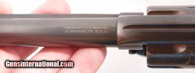 Description: EARLY SMOKELESS COLT .38-40 CAL. SINGLE ACTION 4 ¾” ARMY REVOLVER CA. 1904 W/FACTORY LETTER. All matching in the 25x,xxx range. Original as refinished long ago with all the original parts except the grips and trigger guard screw. Excellent markings and crisp barrel address. Fine quality fancy rosewood two piece non-factory grips. Working order and excellent bore and chambers. Factory records state shipped Sept. 14, 1904 as a blue .38 W.C.F. with 4 ¾” barrel. Letter on order. SOLD Curio/Relic: Yes |