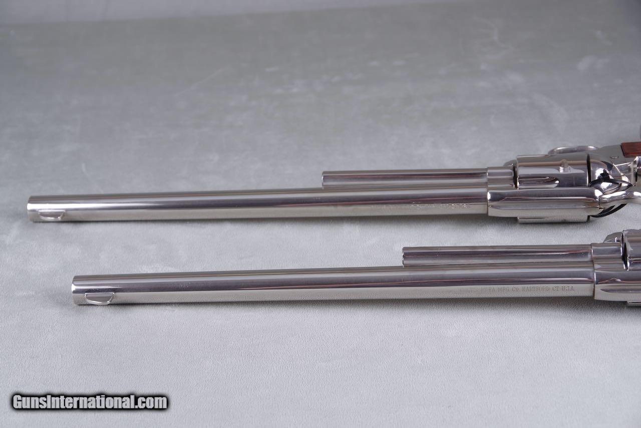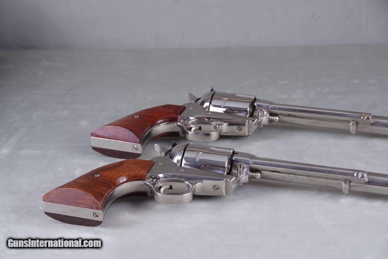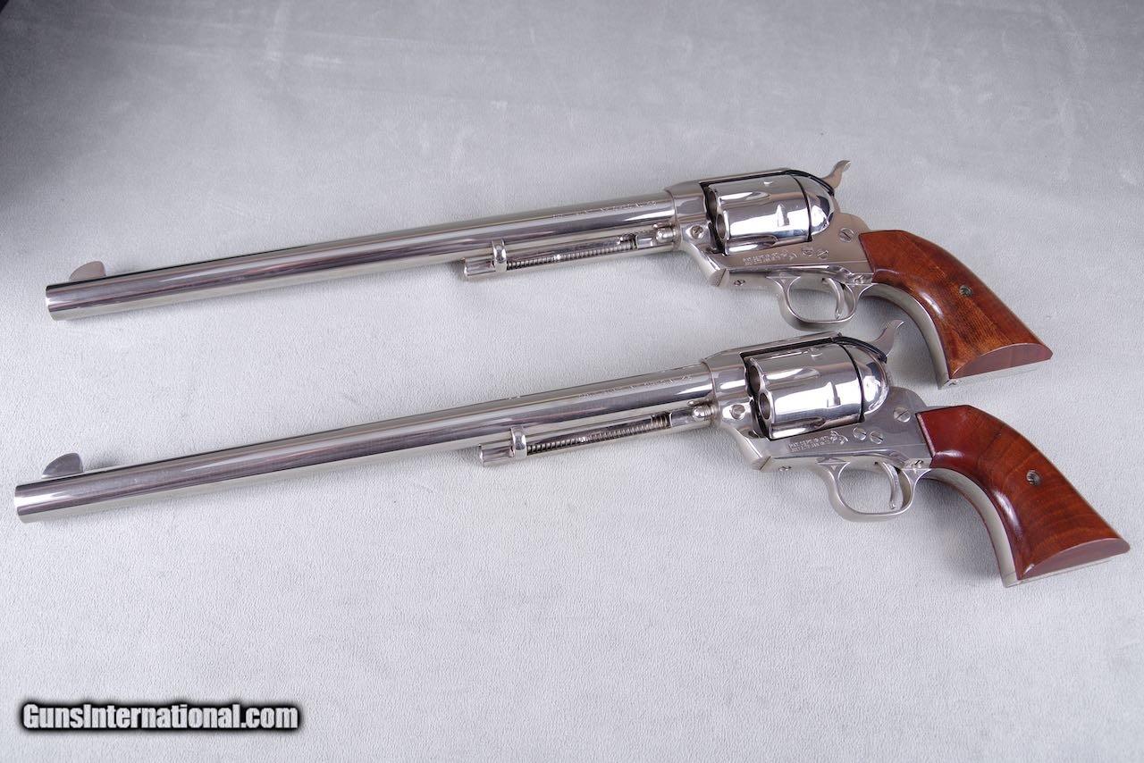Description: 1961 Colt Buntline SAAs chambered in 45LC with 12'' barrels and factory nickel finish. When it comes to rare guns this is about as good as it gets. There were only 65 nickel Buntlines ever manufacture during the black box era. Of that there are only three consecutive sets. This pair was in the Pat Boland collection for decades. This set is new in the original black boxes numbered to the guns with all of the paperwork and cleaning brushes. Both guns are no excuses collector grade examples. The nickel on both remains brilliant and mirror like throughout. These guns show zero handling and both rate 100%. The factory wood grips are flawless. Even the boxes and paperwork are mint. Despair can not be upgraded in anyway and they will be on the top shelf of even the most advanced collection. SOLD Curio/Relic: Yes Manufacturer: Colt Model: SAA |