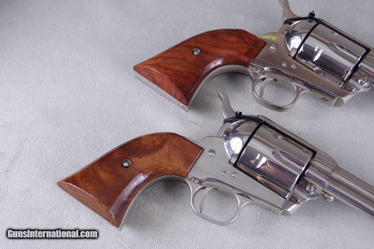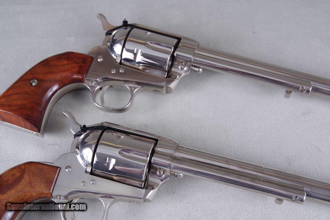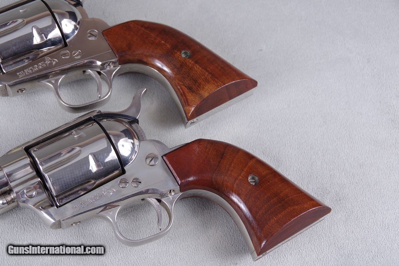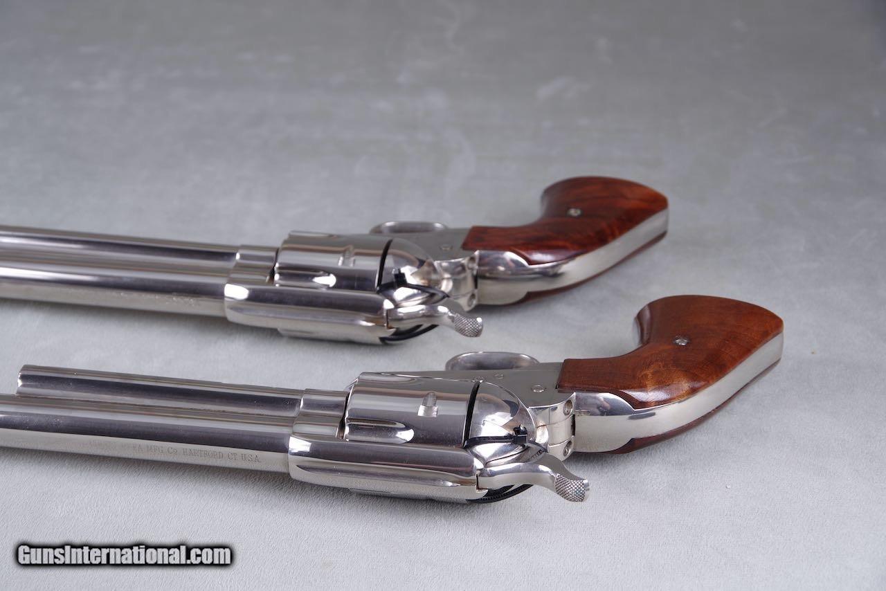 Description: 1961 Colt Buntline SAAs chambered in 45LC with 12'' barrels and factory nickel finish. When it comes to rare guns this is about as good as it gets. There were only 65 nickel Buntlines ever manufacture during the black box era. Of that there are only three consecutive sets. This pair was in the Pat Boland collection for decades. This set is new in the original black boxes numbered to the guns with all of the paperwork and cleaning brushes. Both guns are no excuses collector grade examples. The nickel on both remains brilliant and mirror like throughout. These guns show zero handling and both rate 100%. The factory wood grips are flawless. Even the boxes and paperwork are mint. Despair can not be upgraded in anyway and they will be on the top shelf of even the most advanced collection. SOLD Curio/Relic: Yes Manufacturer: Colt Model: SAA |