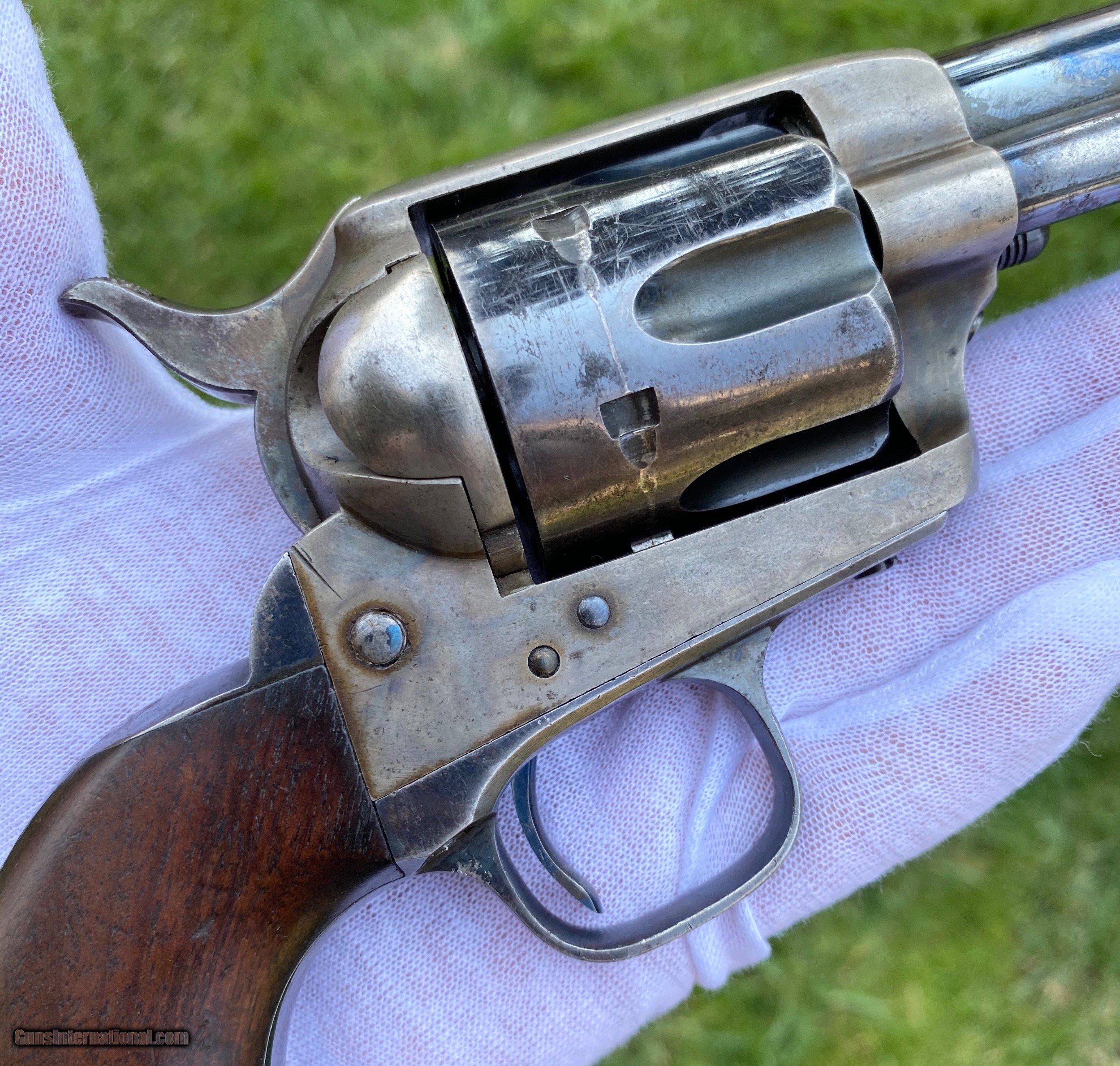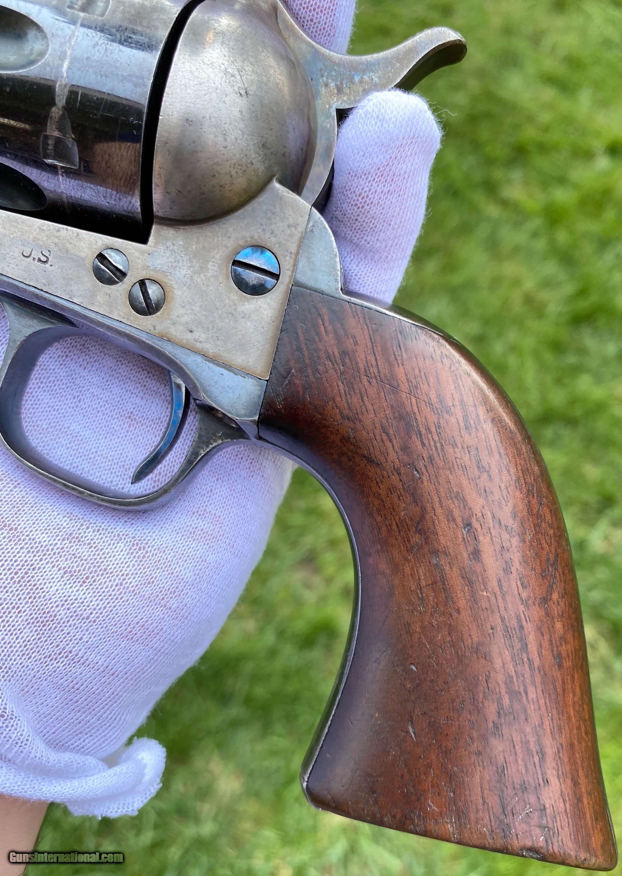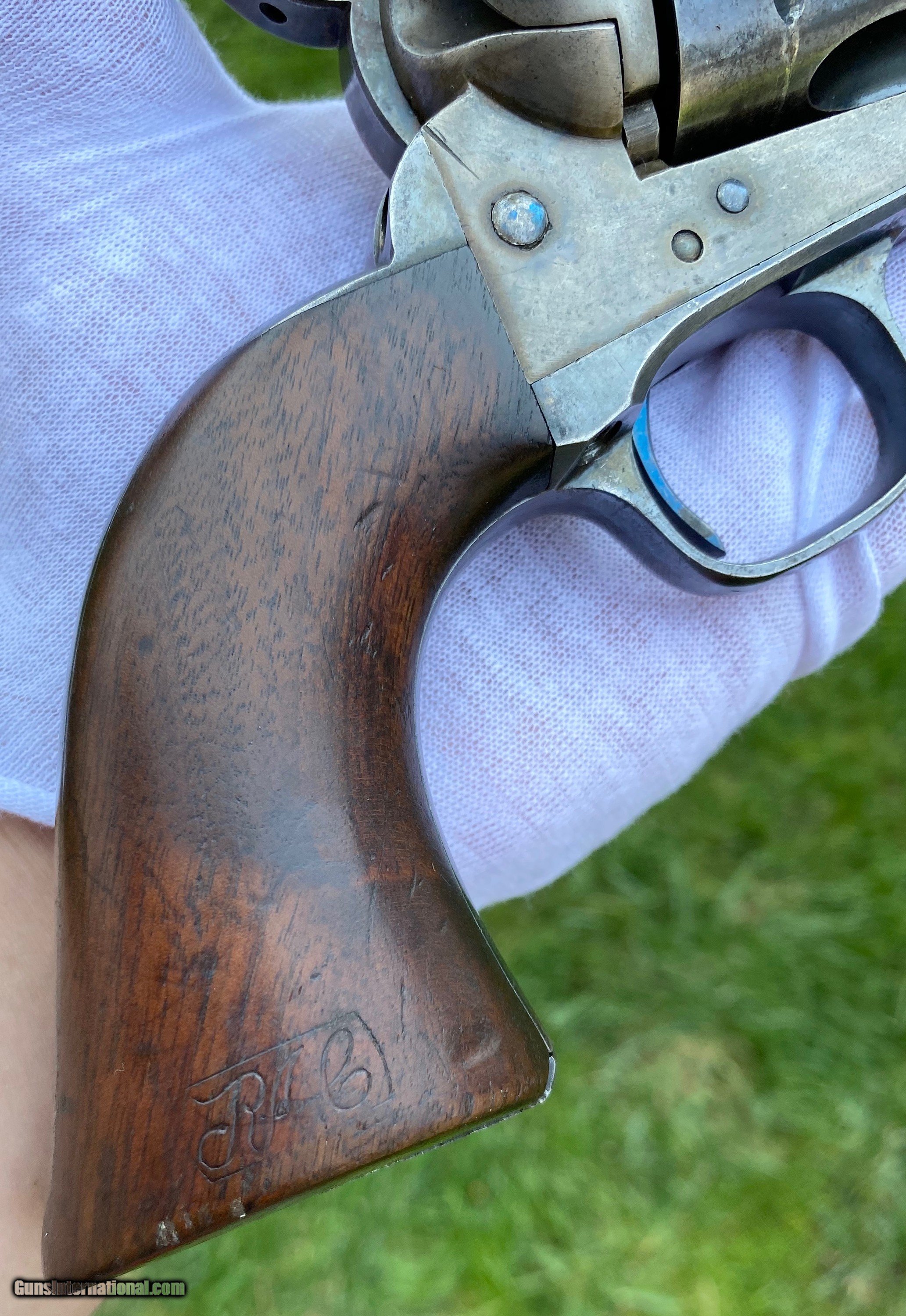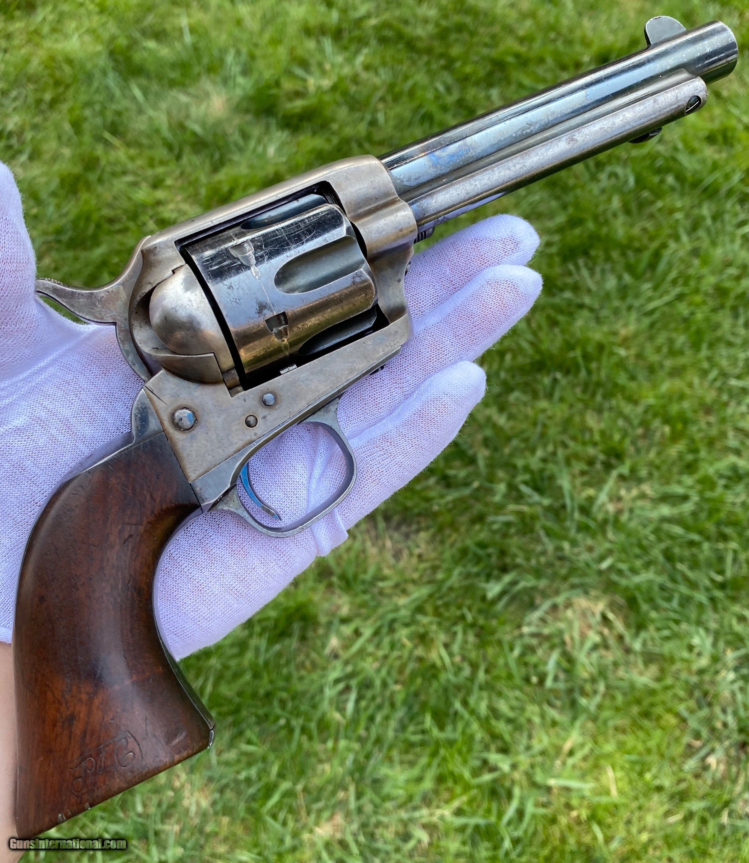 Description: This is an outstanding example of the Colt Single Action Artillery Model, this example shows most of its original blue finish on the barrel remaining, as well as on the cylinder. The frame shows strong color case hardened finish still visible. The grips is excellent with a nice RAC cartouche on the right panel as well as RAC stamped on the grip butt. The frame is a DFC inspected serial number 119759, the trigger guard is stamped 4324, no number is visible on the cylinder which isn’t uncommon. Mechanically works well aside from there is no half cock notch. A absolutely gorgeous artillery model! Shipping is actual cost, method and insurance can be chosen by the buyer. All offers considered! Thank you! SOLD SOLD Antique: Yes |