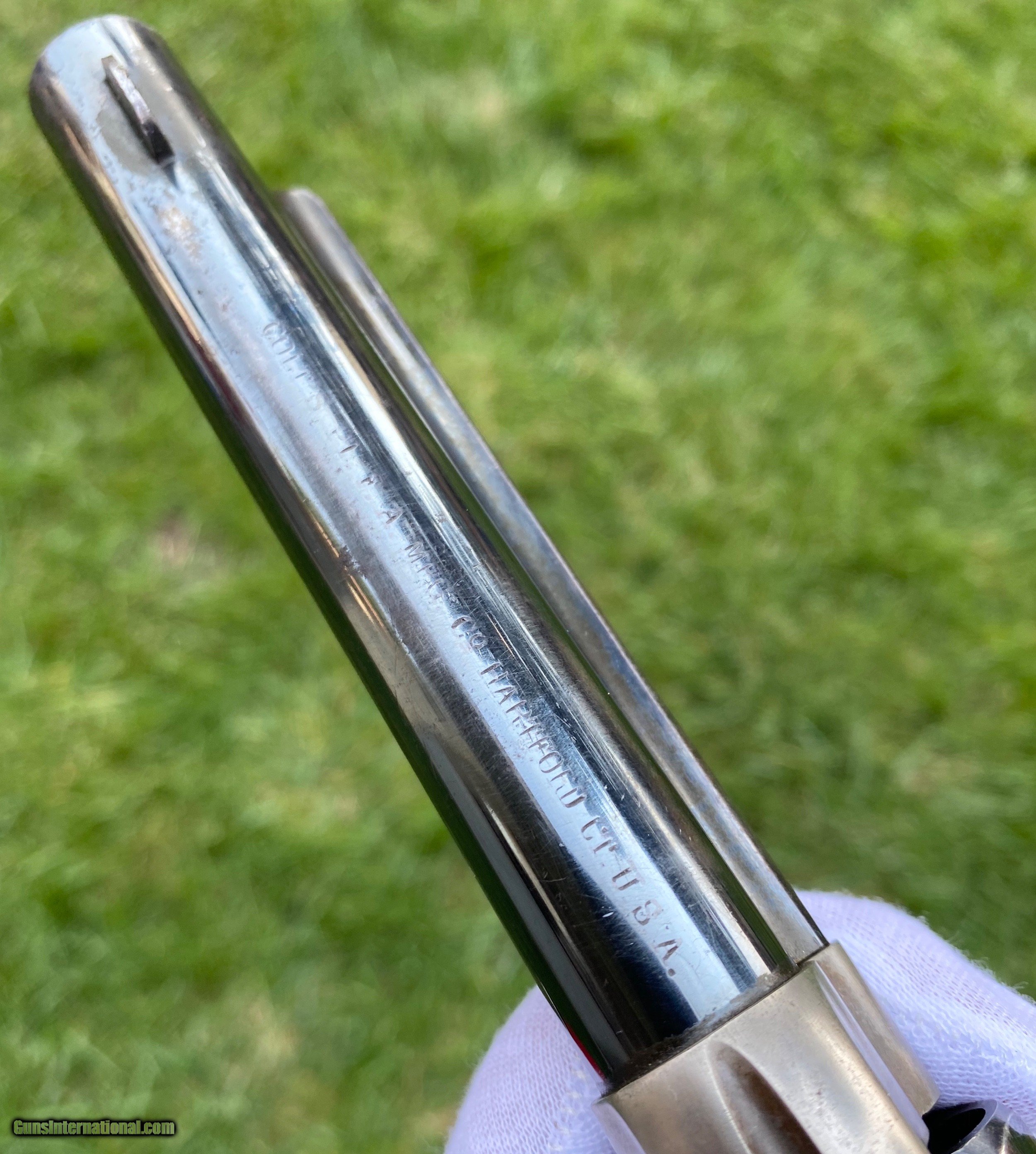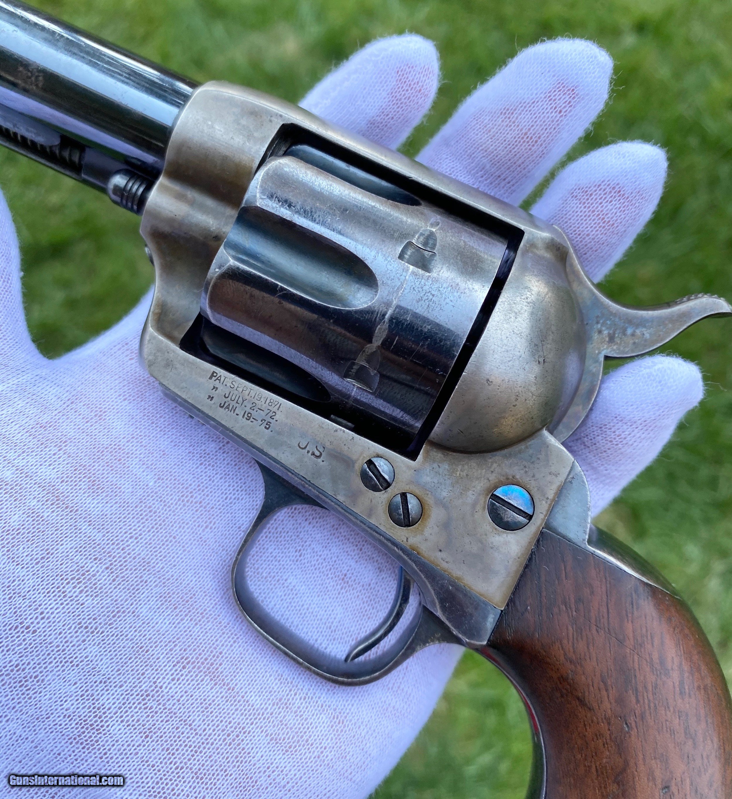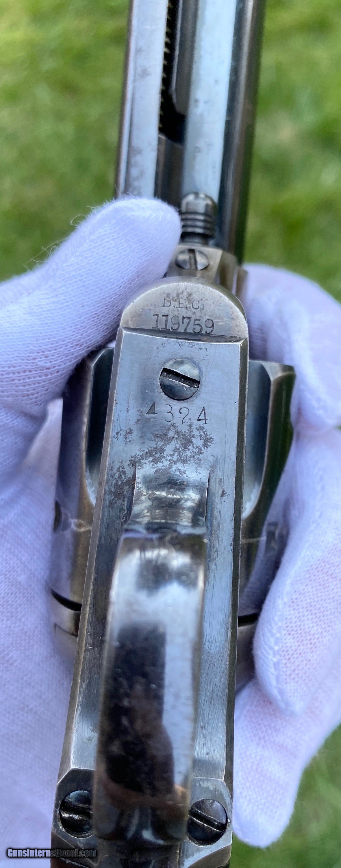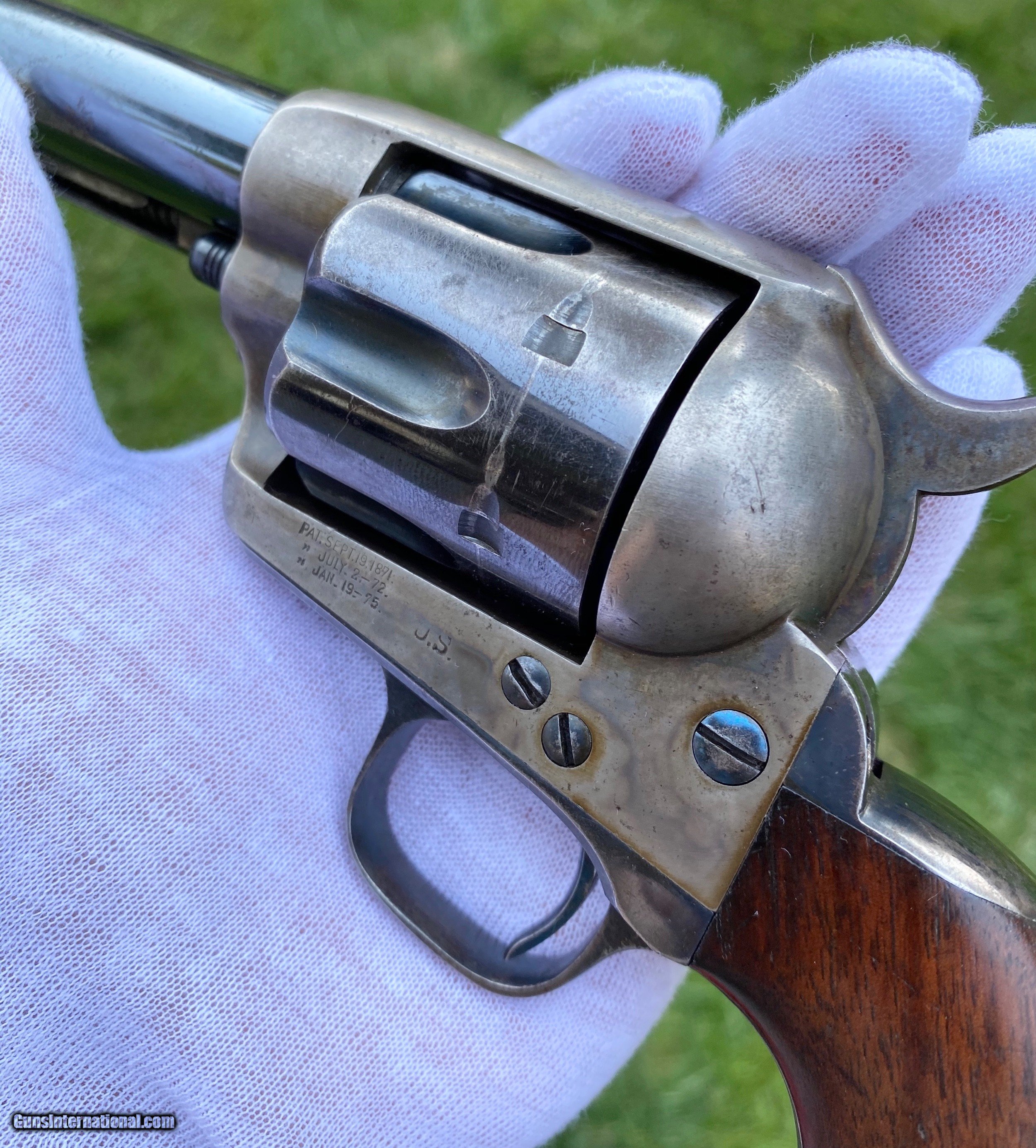 Description: This is an outstanding example of the Colt Single Action Artillery Model, this example shows most of its original blue finish on the barrel remaining, as well as on the cylinder. The frame shows strong color case hardened finish still visible. The grips is excellent with a nice RAC cartouche on the right panel as well as RAC stamped on the grip butt. The frame is a DFC inspected serial number 119759, the trigger guard is stamped 4324, no number is visible on the cylinder which isn’t uncommon. Mechanically works well aside from there is no half cock notch. A absolutely gorgeous artillery model! Shipping is actual cost, method and insurance can be chosen by the buyer. All offers considered! Thank you! SOLD SOLD Antique: Yes |