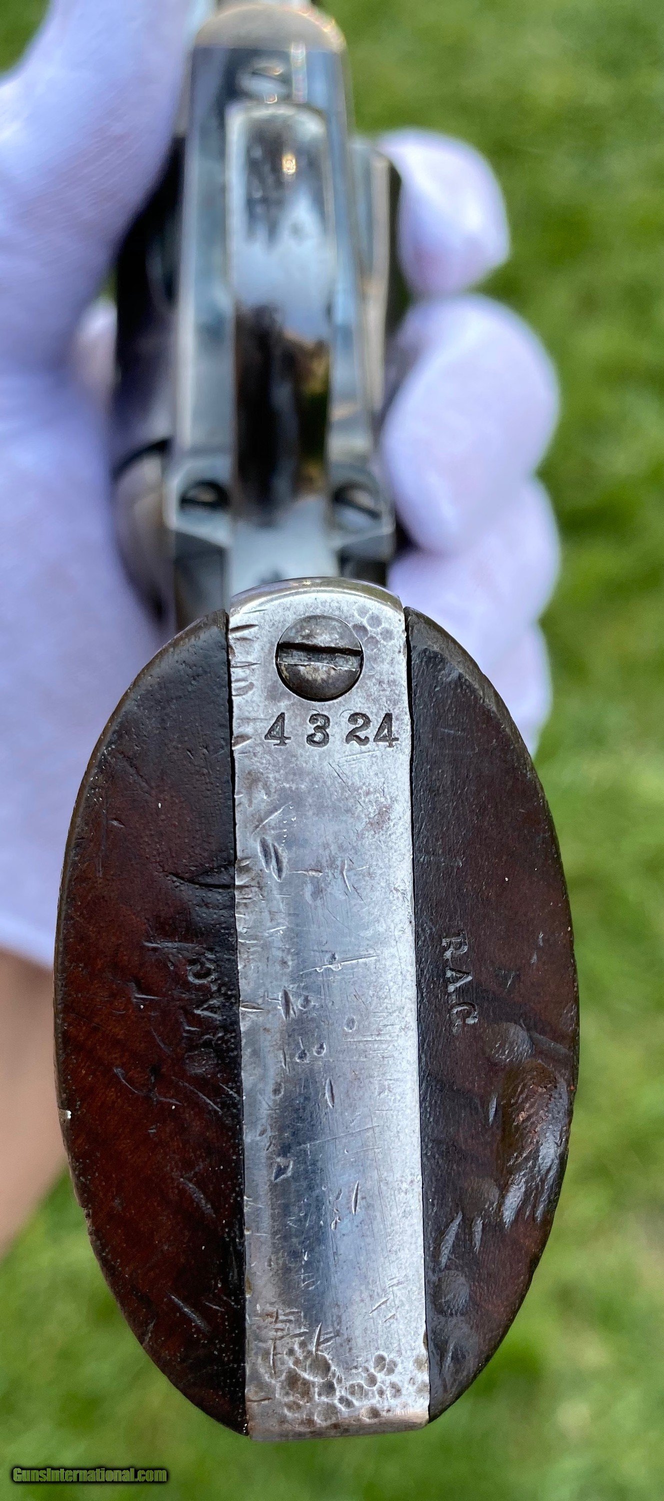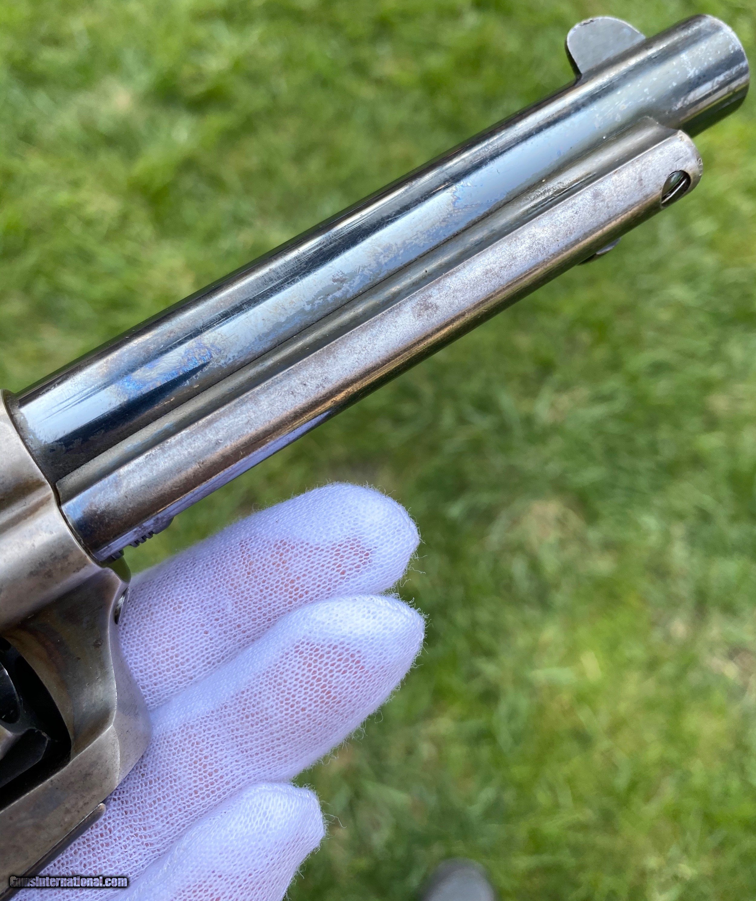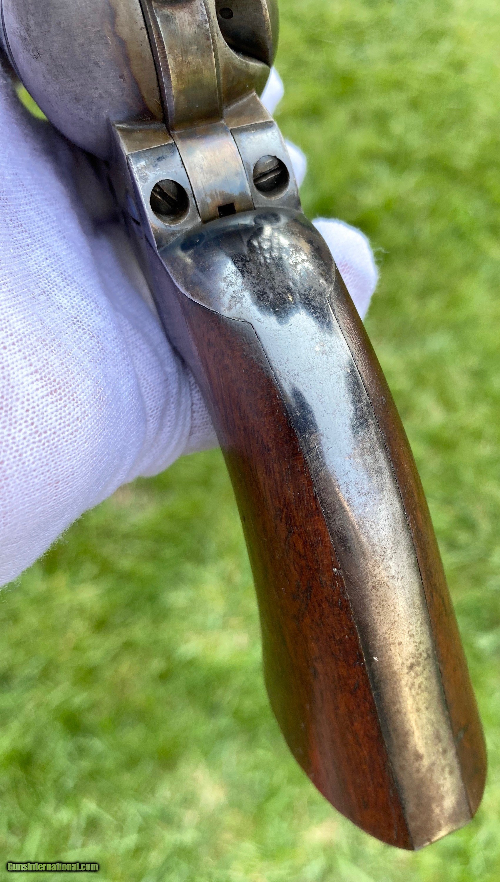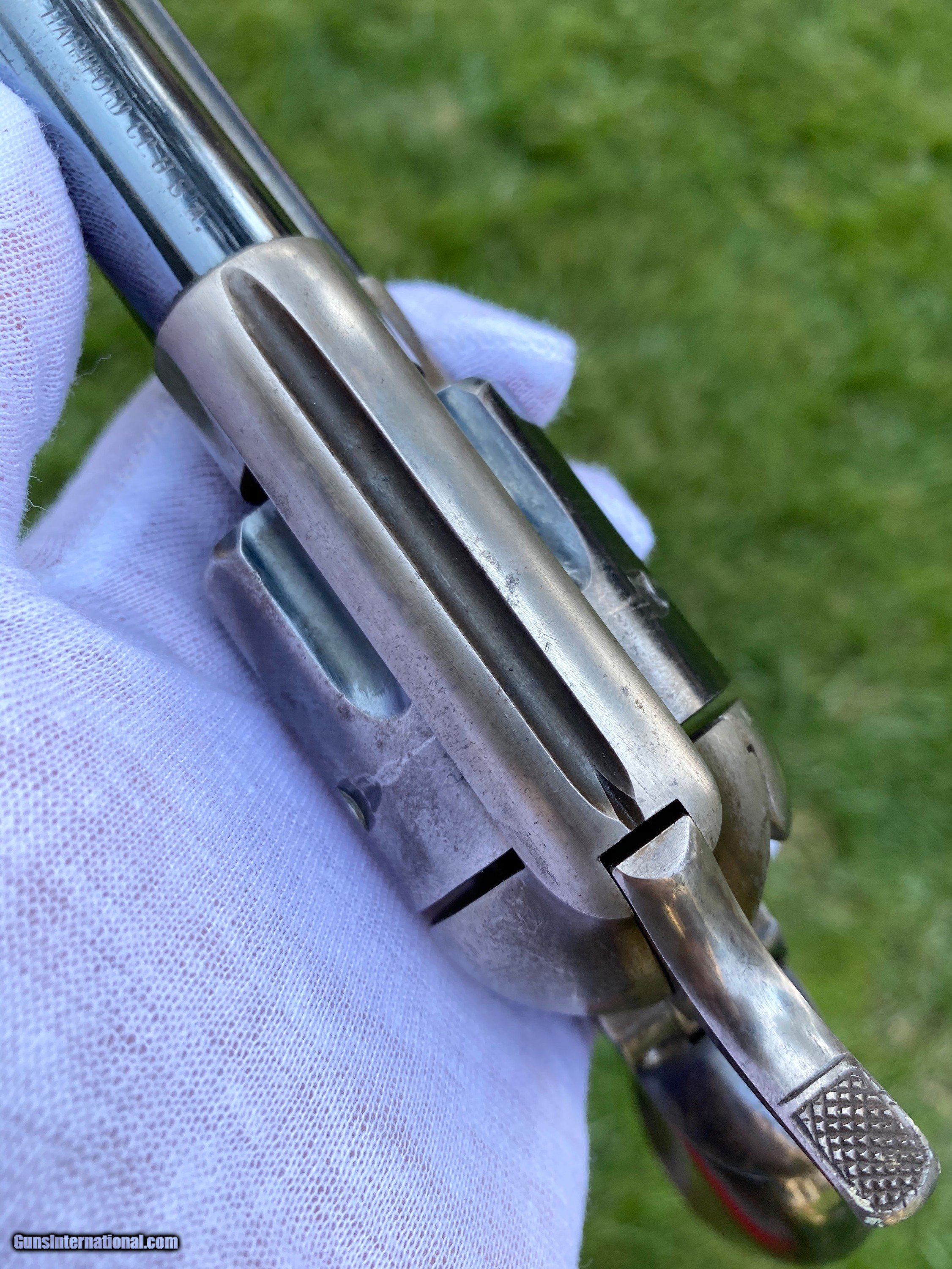 Description: This is an outstanding example of the Colt Single Action Artillery Model, this example shows most of its original blue finish on the barrel remaining, as well as on the cylinder. The frame shows strong color case hardened finish still visible. The grips is excellent with a nice RAC cartouche on the right panel as well as RAC stamped on the grip butt. The frame is a DFC inspected serial number 119759, the trigger guard is stamped 4324, no number is visible on the cylinder which isn’t uncommon. Mechanically works well aside from there is no half cock notch. A absolutely gorgeous artillery model! Shipping is actual cost, method and insurance can be chosen by the buyer. All offers considered! Thank you! SOLD SOLD Antique: Yes |