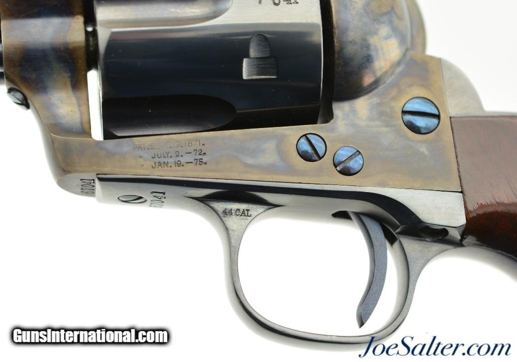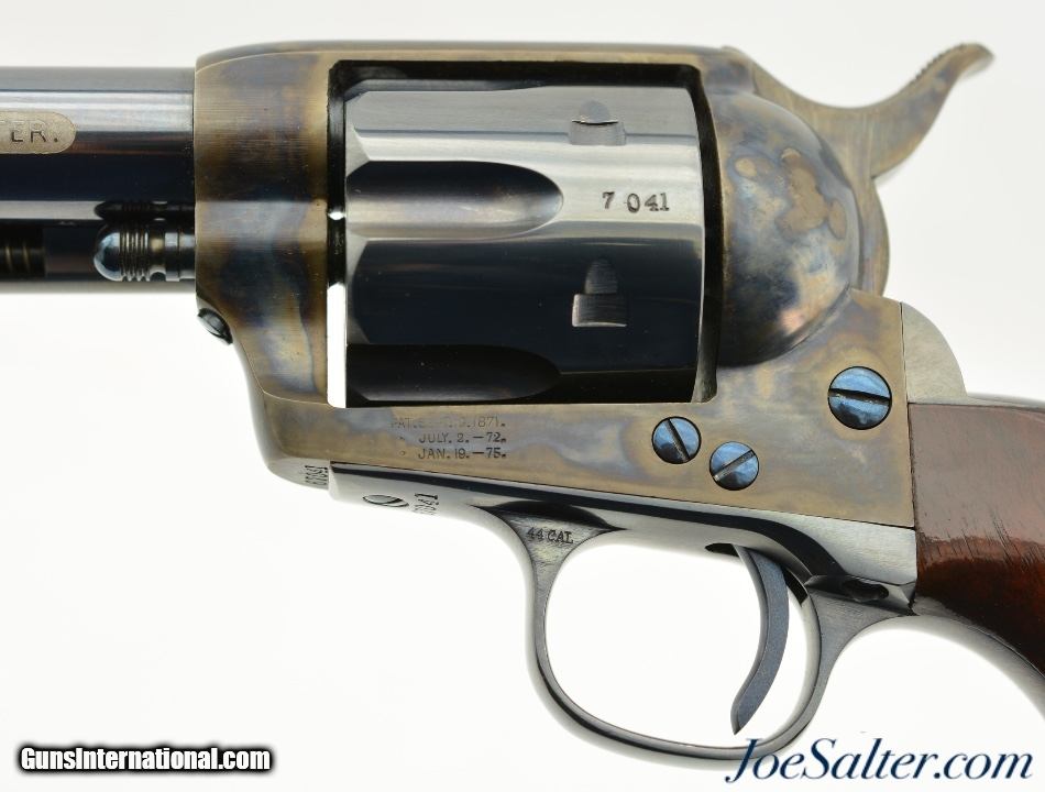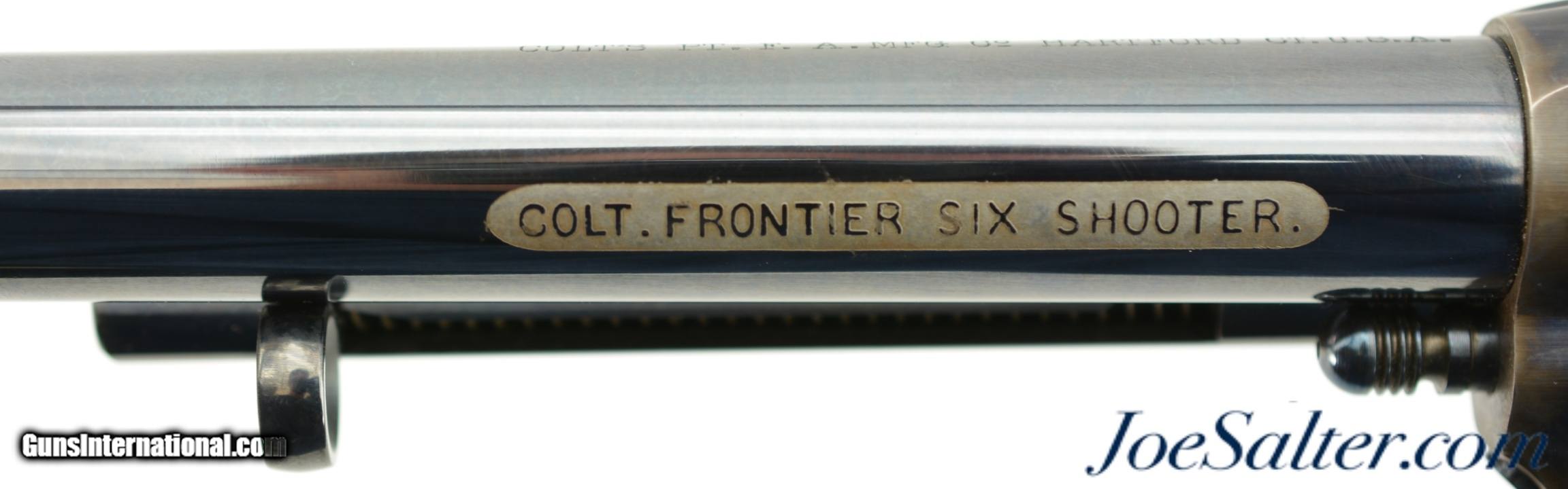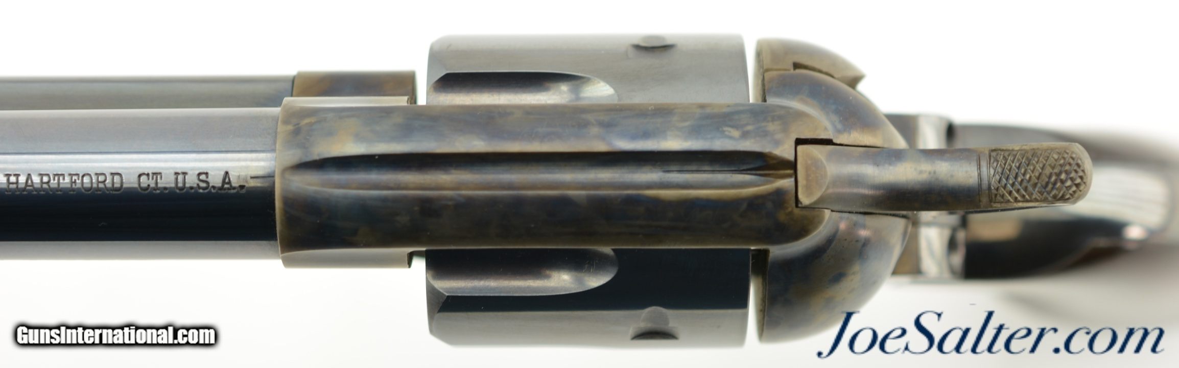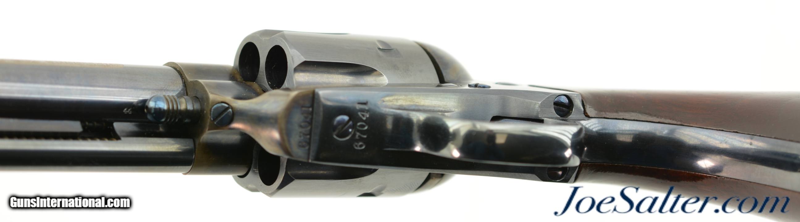 Description: Serial #67041, .44 WCF (.44-40), 7 1/2" barrel with an excellent, bright bore. This is an 1881-made, matching numbered, black powder frame revolver that has been expertly restored to factory new condition. The barrel, ejector housing, cylinder, and gripstraps retain all of their lustrous blue finish (even the cylinder has no discernible turn marks), while the frame and hammer retain all of their vivid color case-hardening. All of the screws retain their bright fire bluing, and the new rosewood grips are in excellent condition. This is a fantastic original antique Colt .44 SAA, with an excellent modern restoration, and would make a striking addition to any collection. Antique; SOLD Antique: Yes |