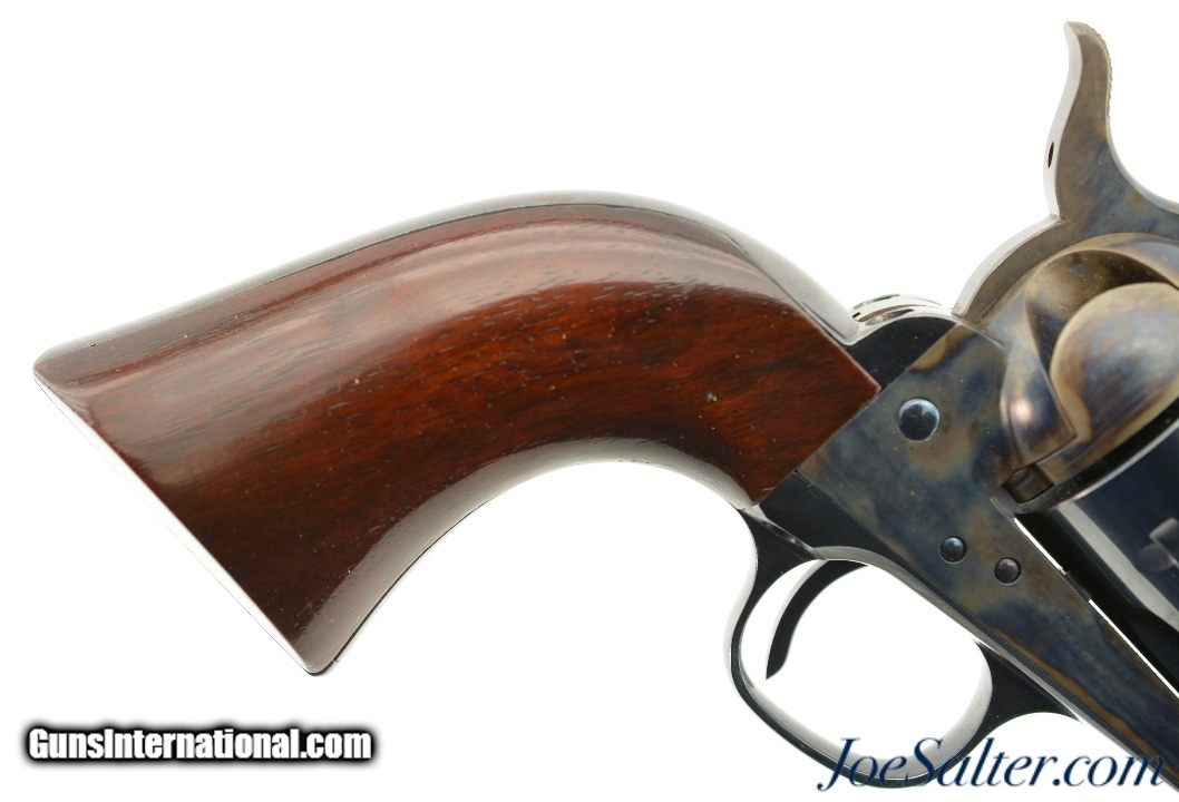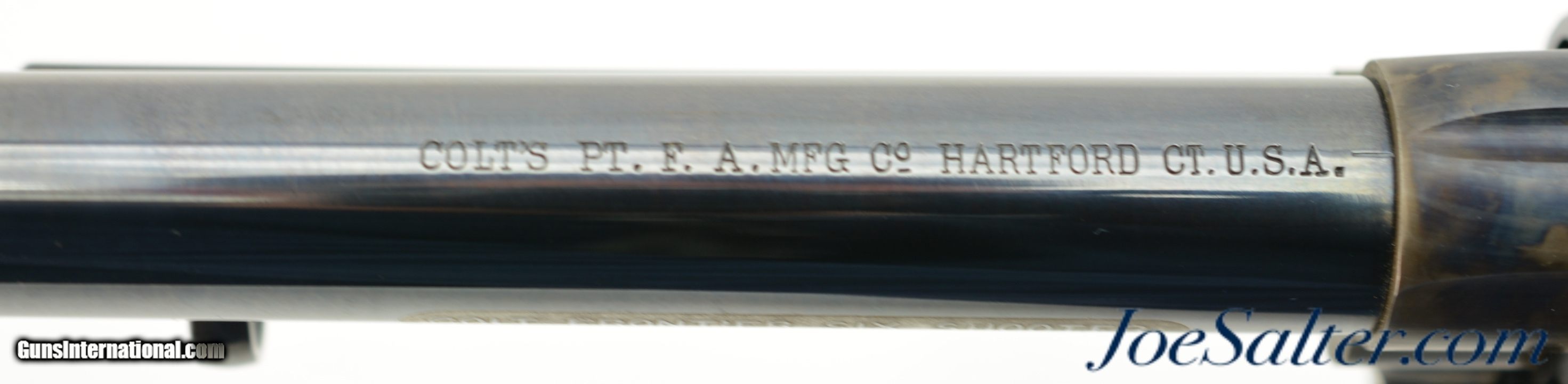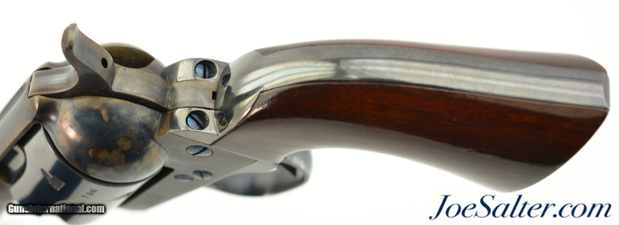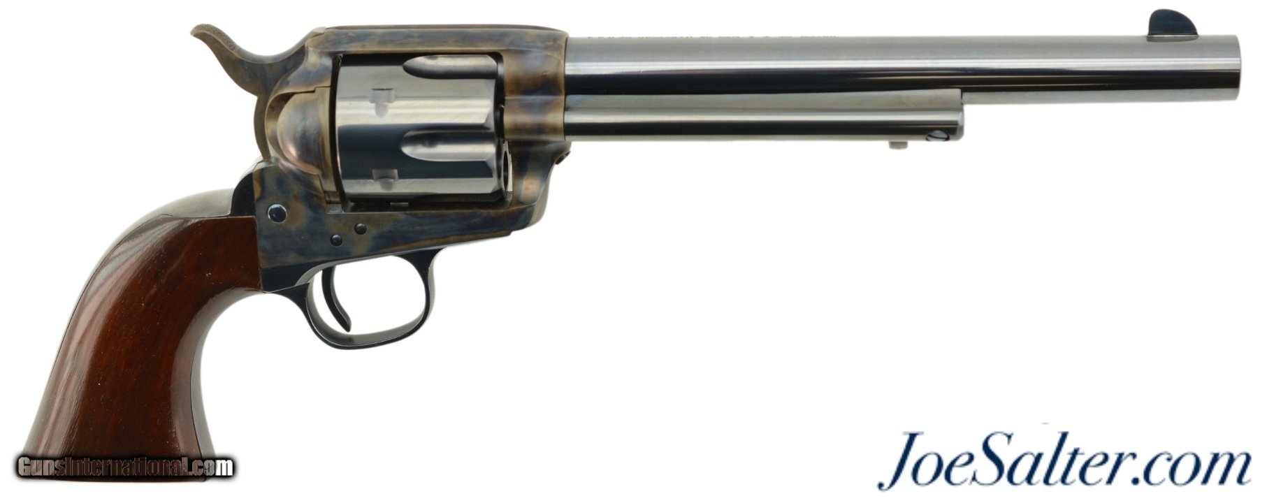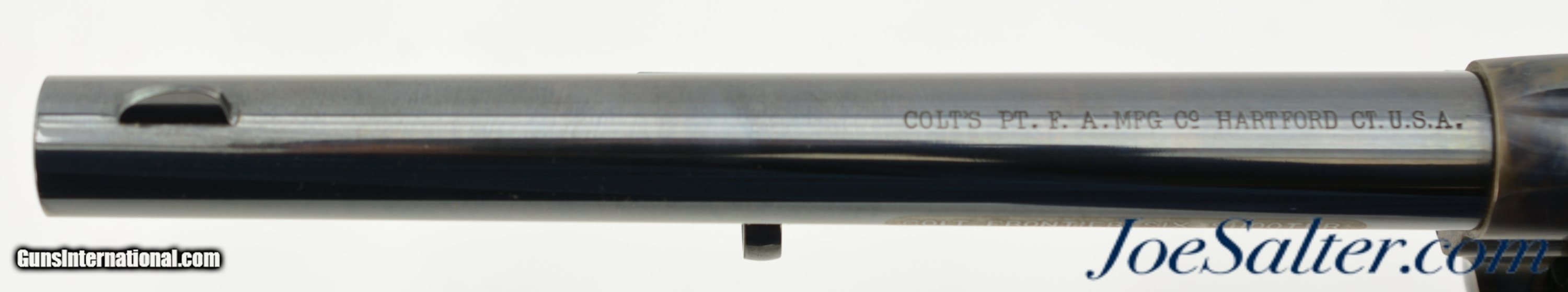 Description: Serial #67041, .44 WCF (.44-40), 7 1/2" barrel with an excellent, bright bore. This is an 1881-made, matching numbered, black powder frame revolver that has been expertly restored to factory new condition. The barrel, ejector housing, cylinder, and gripstraps retain all of their lustrous blue finish (even the cylinder has no discernible turn marks), while the frame and hammer retain all of their vivid color case-hardening. All of the screws retain their bright fire bluing, and the new rosewood grips are in excellent condition. This is a fantastic original antique Colt .44 SAA, with an excellent modern restoration, and would make a striking addition to any collection. Antique; SOLD Antique: Yes |