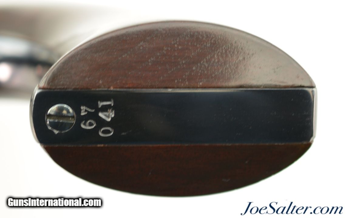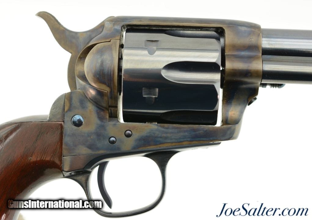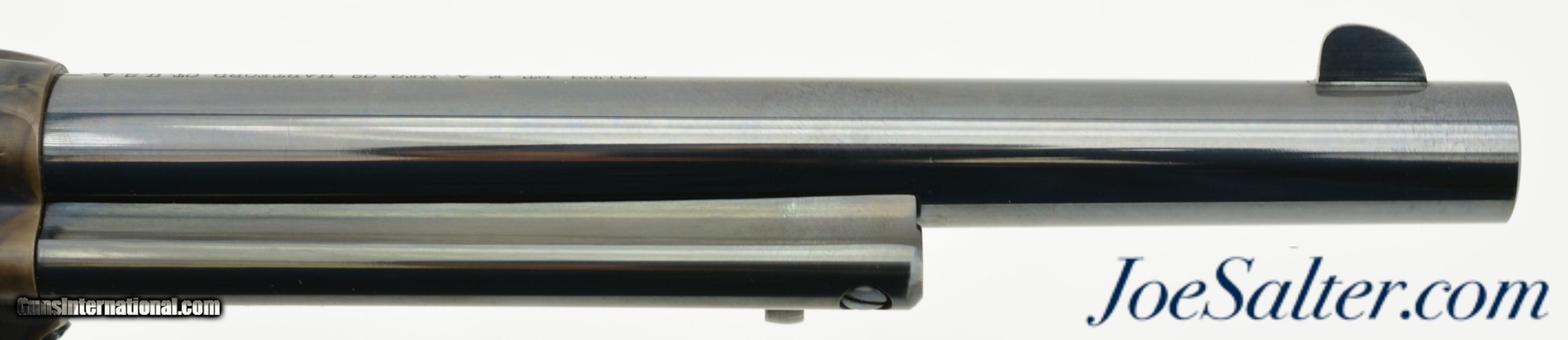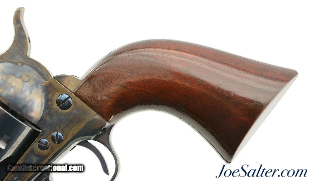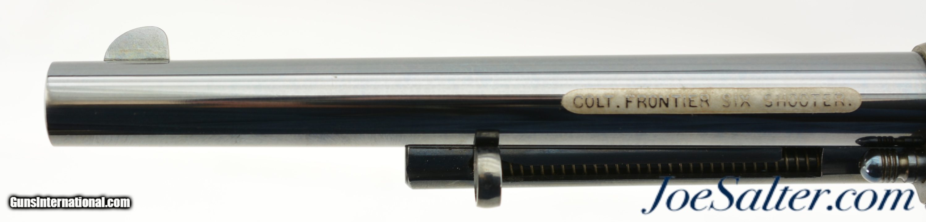 Description: Serial #67041, .44 WCF (.44-40), 7 1/2" barrel with an excellent, bright bore. This is an 1881-made, matching numbered, black powder frame revolver that has been expertly restored to factory new condition. The barrel, ejector housing, cylinder, and gripstraps retain all of their lustrous blue finish (even the cylinder has no discernible turn marks), while the frame and hammer retain all of their vivid color case-hardening. All of the screws retain their bright fire bluing, and the new rosewood grips are in excellent condition. This is a fantastic original antique Colt .44 SAA, with an excellent modern restoration, and would make a striking addition to any collection. Antique; SOLD Antique: Yes |