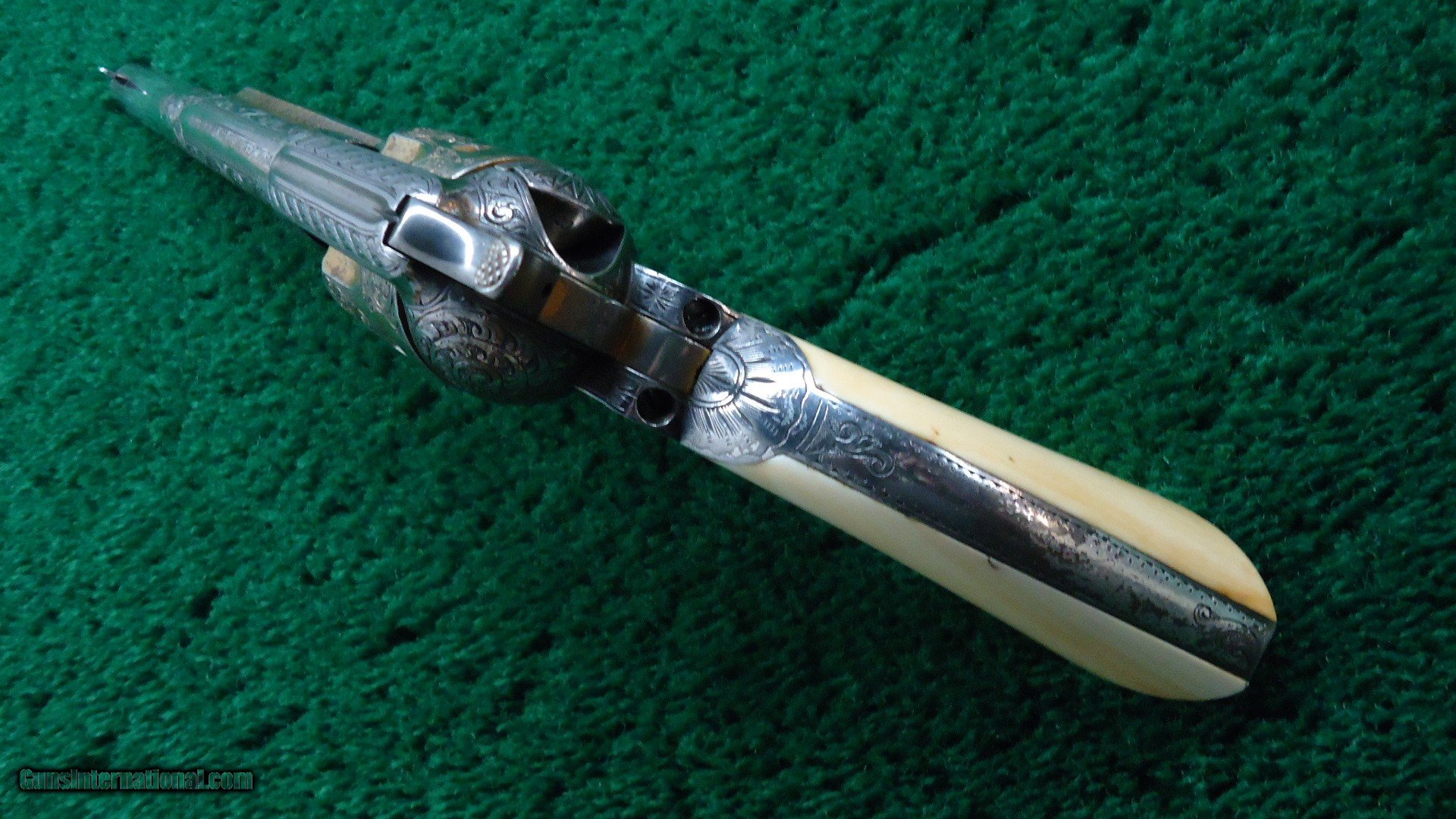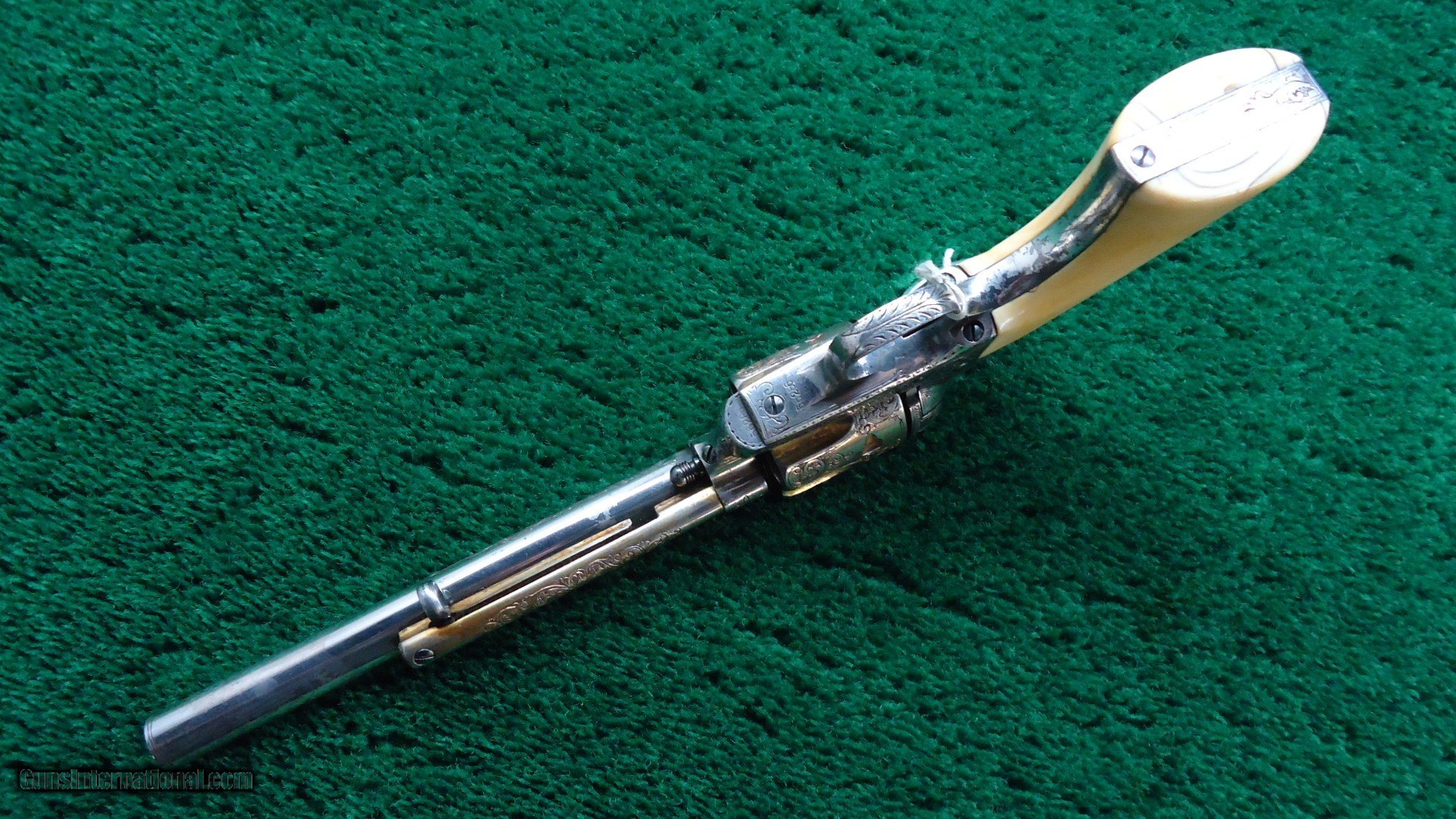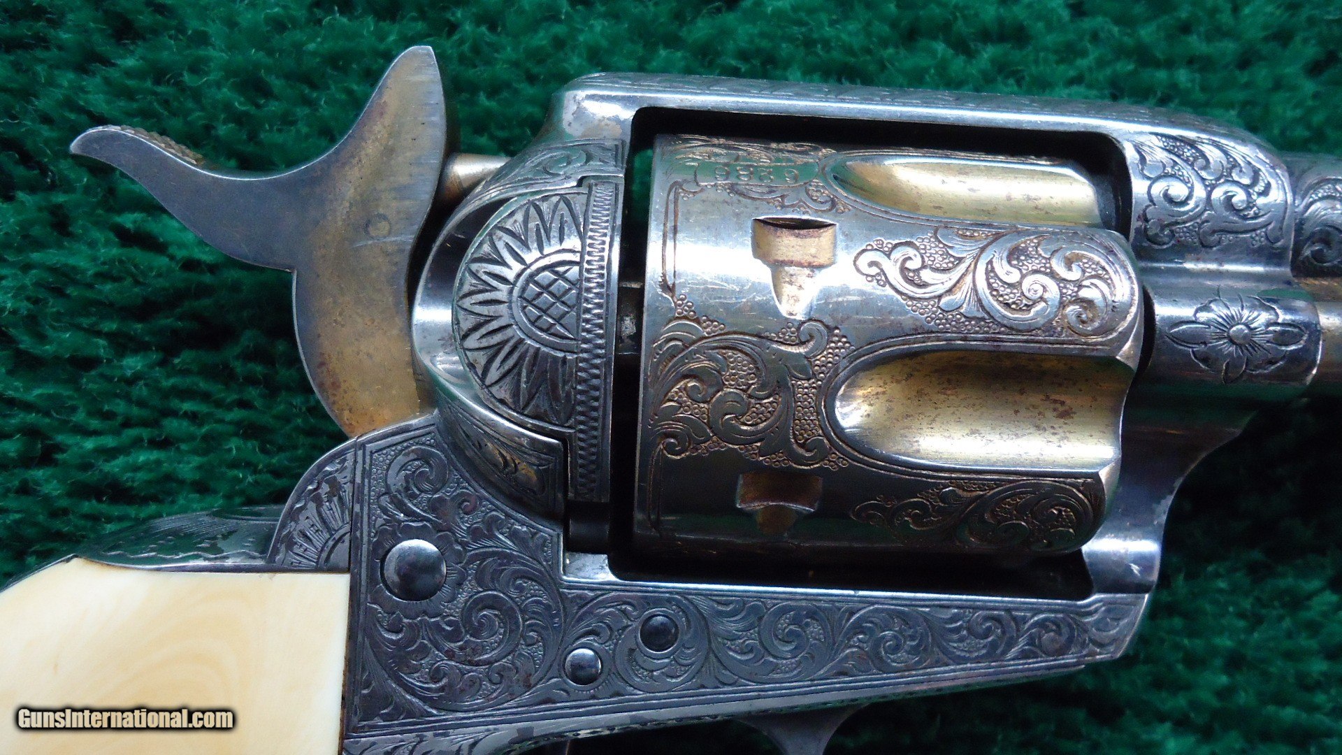 Description: 7-1/2 inch barrel chambered in 45 caliber. 56k serial range. Letters with Silver finish and Gold cylinder, ejector and hammer. Factory engraving and Ivory grips. Overall gun is in outstanding condition retaining a considerable amount of original finish. Aged toning to the silver. Some loss to the gold especially to the hammer. Mechanical condition is excellent. Elaborately engraved with 3/4 coverage in beautifully done scroll work. Typical of Helfrich. Guaranteed all original and complete with Factory Letter from the Colt Firearm Company as well as a Letter from R.L. Wilson. Just a great Colt with seldom seen features! Leroy Merz Antique Firearms specializes in antique and vintage Winchesters and other fine American firearms. Since 1965 Mr. Merz has taken part in the world of firearms and has been a contributor to many well known reference books. We have hundreds of additional guns in every price range at our home online. Search for Merz Antiques in google. SOLD Antique: Yes Handgun Caliber: .45 Colt |