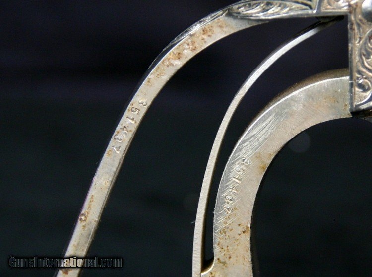Description: .45lc, #351437, 5 1/2 inch barrel, 2 piece faux pearl grips, letters with hard rubber, sharp level 2 factory engraving, all matching numbers, letter states sent to Wolf & Klar, Ft Worth, TX, march 31, 1928. Condition: bore is excellent, 98% nickel overall, some oxidation on corners of cylinder flutes, small amount of holster wear at muzzel, grips are excellent, marks are excellent, excellent mechanically. SOLD Curio/Relic: Yes |