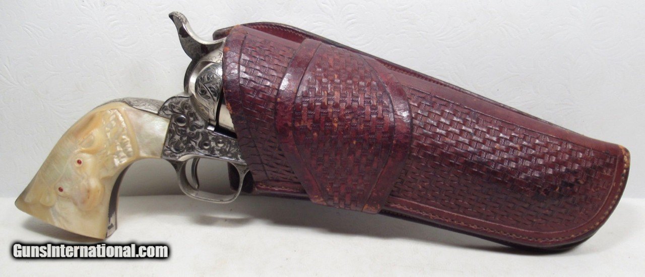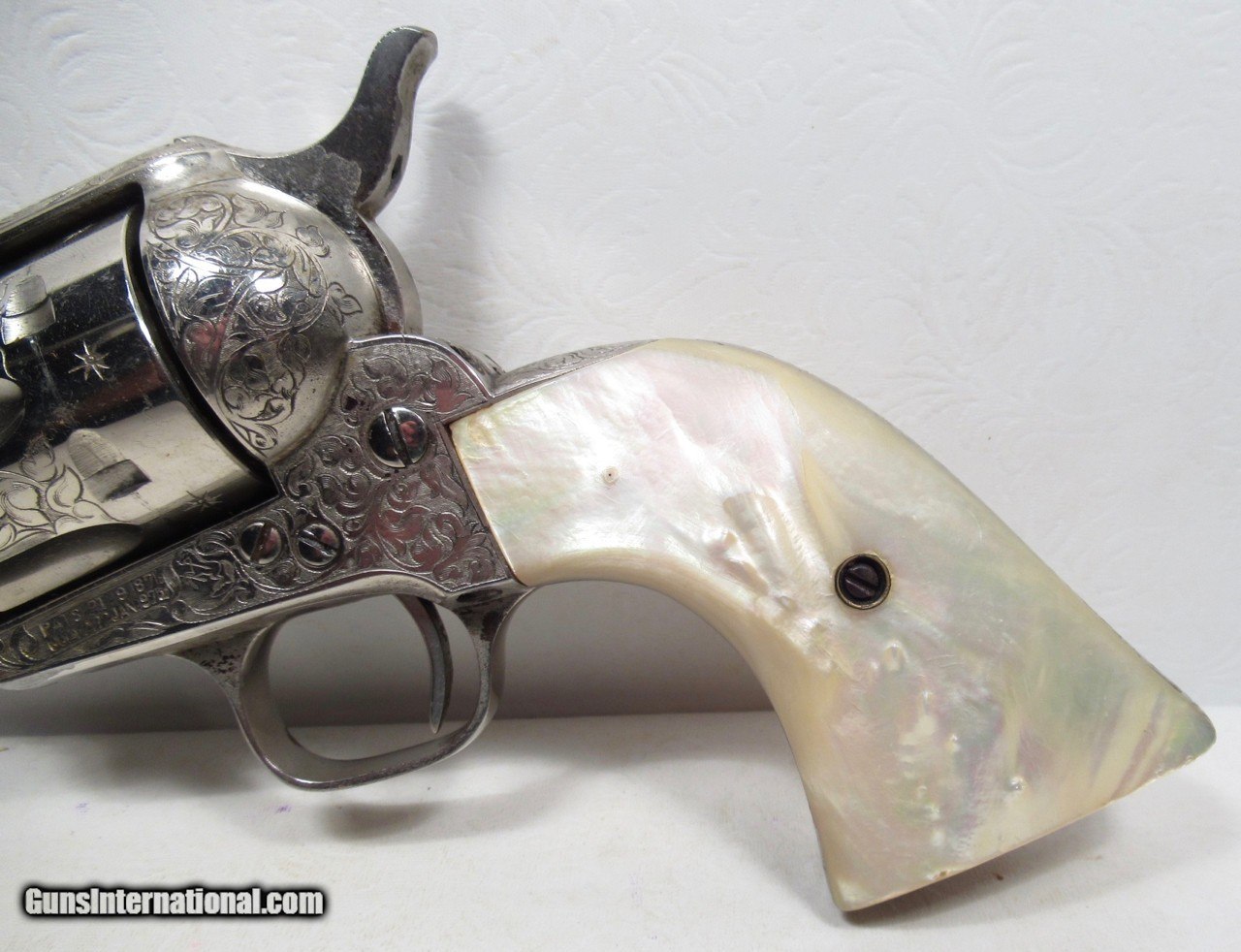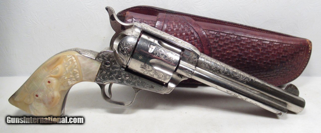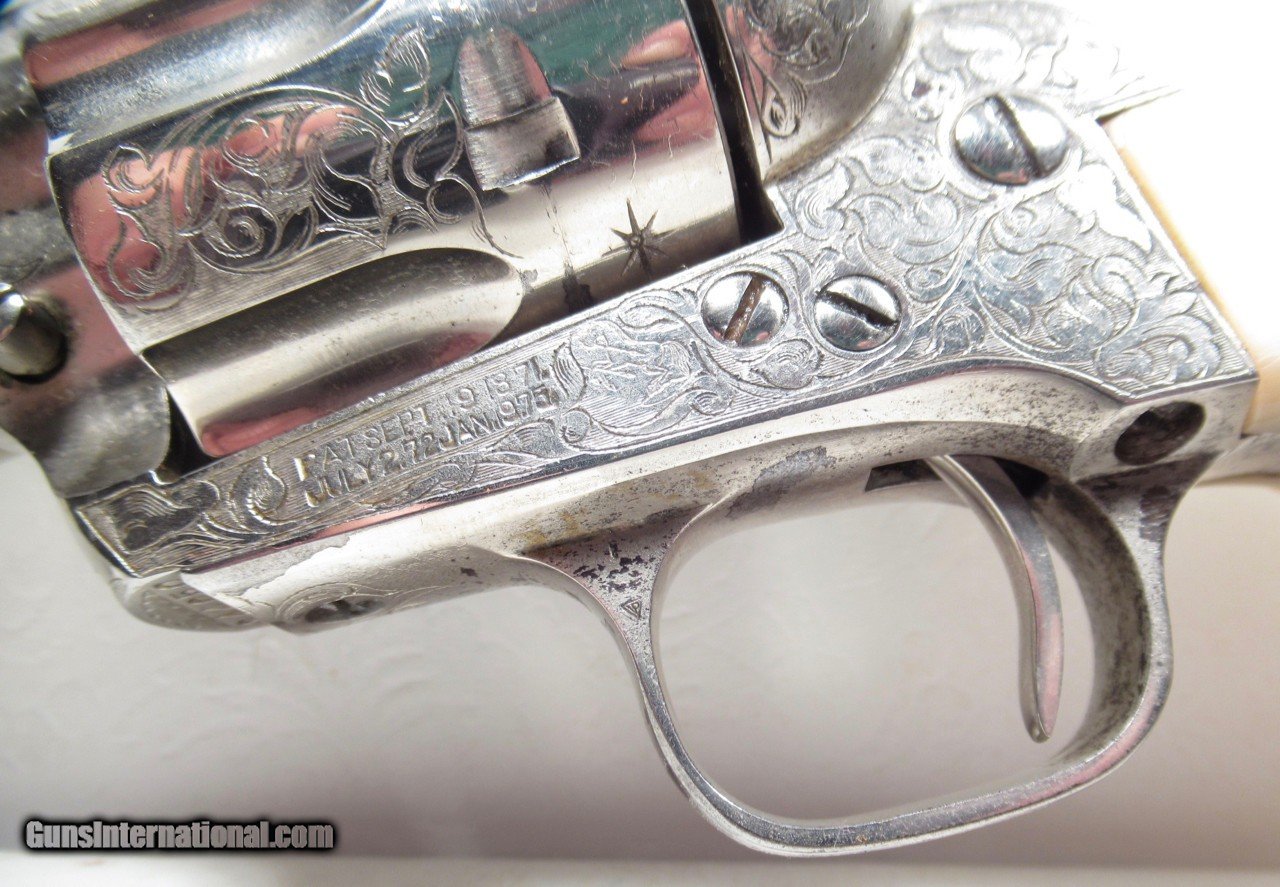 Description: Colt Single Action Army Revolver; Serial No. 344050; Per Included Factory Letter: .45 Caliber with 5 ½” Barrel and Nickel Finish; Factory Engraved and Shipped to Wolf & Klar of Fort Worth, Texas on December 6, 1922 in a One-Gun Shipment; Colt Factory Order #6791/1; Factory Engraved by Wilber Glahn; Most of the Original Nickel Finish Present; Beautiful Carved Steer-Head Motif Pearl Grips; “J.F. Gill” Marked on Backstrap; Per Info from Collectors Firearms, Gill was in the Horse Business in Texas; 100% Original and Matching; Perfect Action and Nice Bore with light even chattering; Very Nice Kluge Bros. of Austin, Texas Holster Included; Great 100 Year-Old Factory Engraved Texas Colt 45 Revolver; See All Photos for Condition; No Texts; Call (254)541-5765 or Email Only; PERSONAL PROPERTY of Harold Wieser; Price: $29,975 + $45 S&H Via USPS PRIORITY MAIL; Payment Address: Harold Wieser - 1466 U.S. Hwy 77 - Rosebud, TX 76570; SEND PAYMENTS VIA USPS PRIORITY MAIL; BEWARE of SCAMS!!! – DO NOT SEND MONEY or CORRESPONDENTS ELECTRONICALLY UNLESS YOU HAVE SPOKEN to HAROLD WIESER FIRST! 254-541-5765 SOLD Manufacturer: Colt Model: 1873 Serial Number: 344050 |