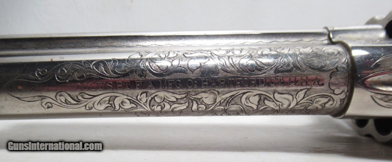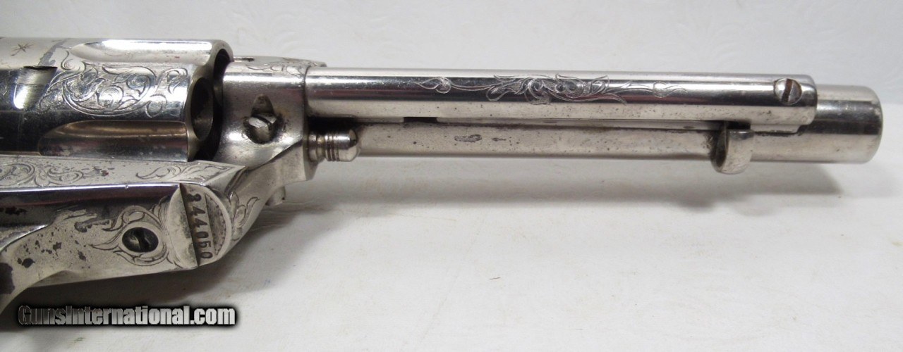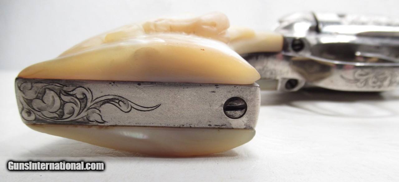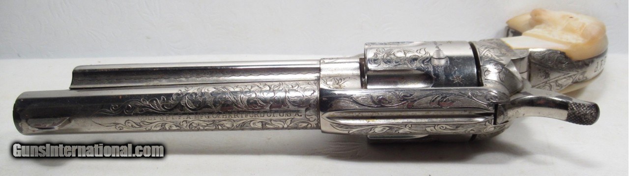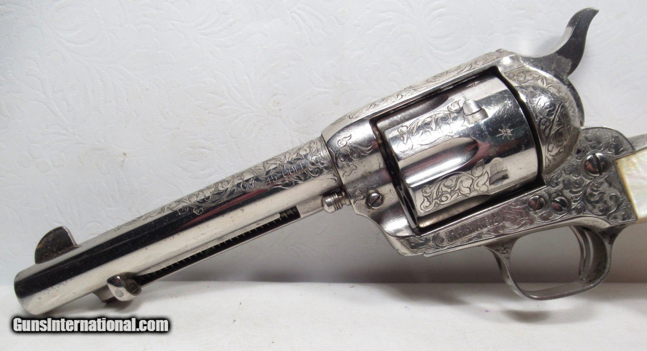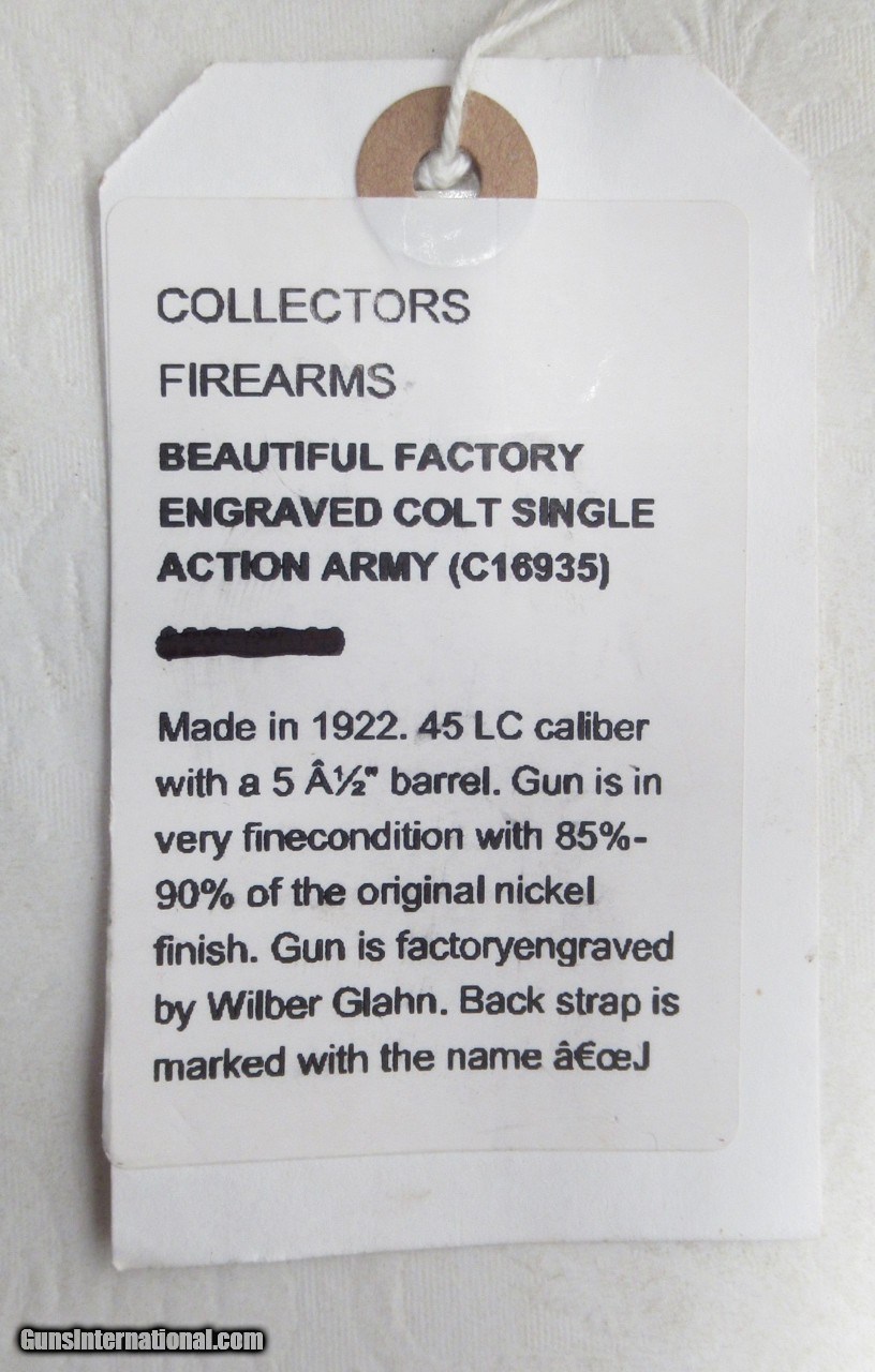 Description: Colt Single Action Army Revolver; Serial No. 344050; Per Included Factory Letter: .45 Caliber with 5 ½” Barrel and Nickel Finish; Factory Engraved and Shipped to Wolf & Klar of Fort Worth, Texas on December 6, 1922 in a One-Gun Shipment; Colt Factory Order #6791/1; Factory Engraved by Wilber Glahn; Most of the Original Nickel Finish Present; Beautiful Carved Steer-Head Motif Pearl Grips; “J.F. Gill” Marked on Backstrap; Per Info from Collectors Firearms, Gill was in the Horse Business in Texas; 100% Original and Matching; Perfect Action and Nice Bore with light even chattering; Very Nice Kluge Bros. of Austin, Texas Holster Included; Great 100 Year-Old Factory Engraved Texas Colt 45 Revolver; See All Photos for Condition; No Texts; Call (254)541-5765 or Email Only; PERSONAL PROPERTY of Harold Wieser; Price: $29,975 + $45 S&H Via USPS PRIORITY MAIL; Payment Address: Harold Wieser - 1466 U.S. Hwy 77 - Rosebud, TX 76570; SEND PAYMENTS VIA USPS PRIORITY MAIL; BEWARE of SCAMS!!! – DO NOT SEND MONEY or CORRESPONDENTS ELECTRONICALLY UNLESS YOU HAVE SPOKEN to HAROLD WIESER FIRST! 254-541-5765 SOLD Manufacturer: Colt Model: 1873 Serial Number: 344050 |