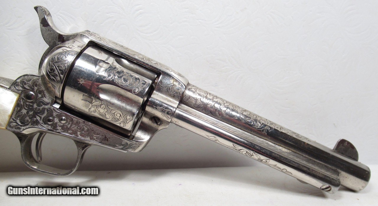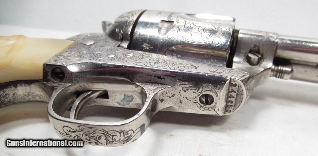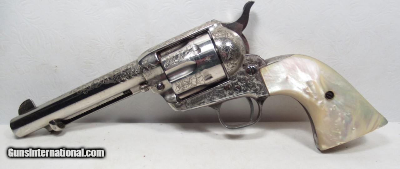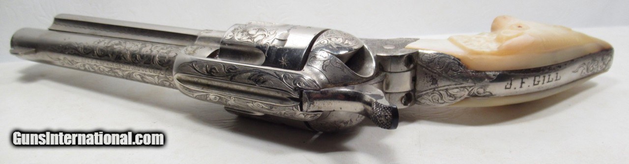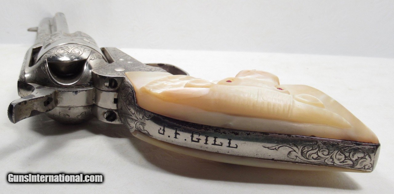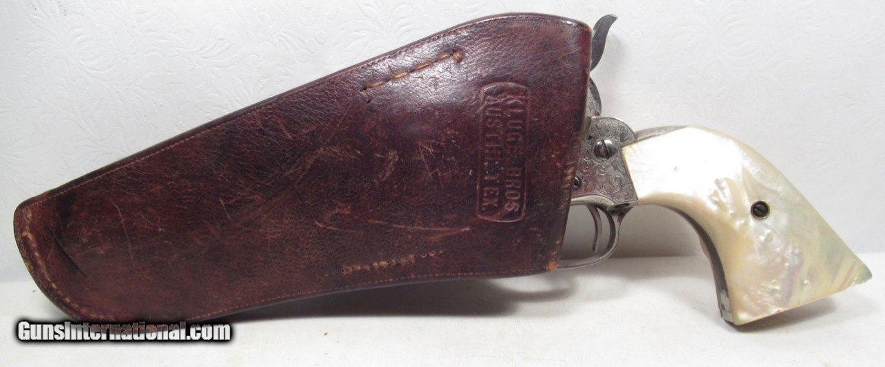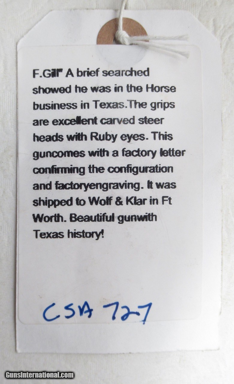 Description: Colt Single Action Army Revolver; Serial No. 344050; Per Included Factory Letter: .45 Caliber with 5 ½” Barrel and Nickel Finish; Factory Engraved and Shipped to Wolf & Klar of Fort Worth, Texas on December 6, 1922 in a One-Gun Shipment; Colt Factory Order #6791/1; Factory Engraved by Wilber Glahn; Most of the Original Nickel Finish Present; Beautiful Carved Steer-Head Motif Pearl Grips; “J.F. Gill” Marked on Backstrap; Per Info from Collectors Firearms, Gill was in the Horse Business in Texas; 100% Original and Matching; Perfect Action and Nice Bore with light even chattering; Very Nice Kluge Bros. of Austin, Texas Holster Included; Great 101 Year-Old Factory Engraved Texas Colt 45 Revolver; See All Photos for Condition; No Texts; Call (254)541-5765 or Email Only; PERSONAL PROPERTY of Harold Wieser; Price: $34,975 + $45 S&H Via USPS PRIORITY MAIL; Payment Address: Harold Wieser - 1466 U.S. Hwy 77 - Rosebud, TX 76570; SEND PAYMENTS VIA USPS PRIORITY MAIL; BEWARE of SCAMS!!! – DO NOT SEND MONEY or CORRESPONDENTS ELECTRONICALLY UNLESS YOU HAVE SPOKEN to HAROLD WIESER FIRST! 254-541-5765 SOLD Manufacturer: Colt Model: 1873 Serial Number: 344050 |