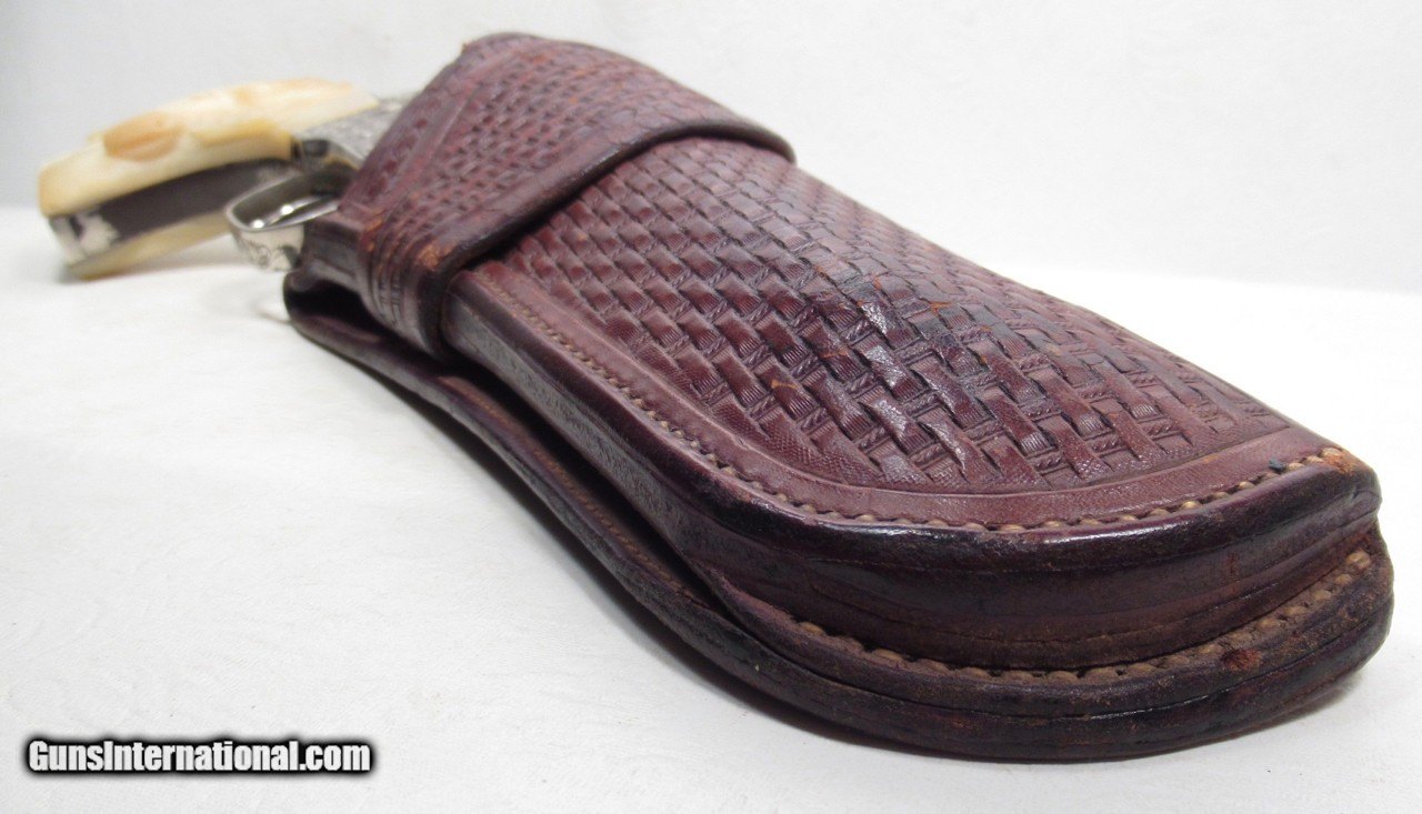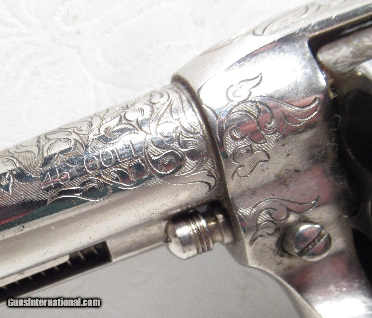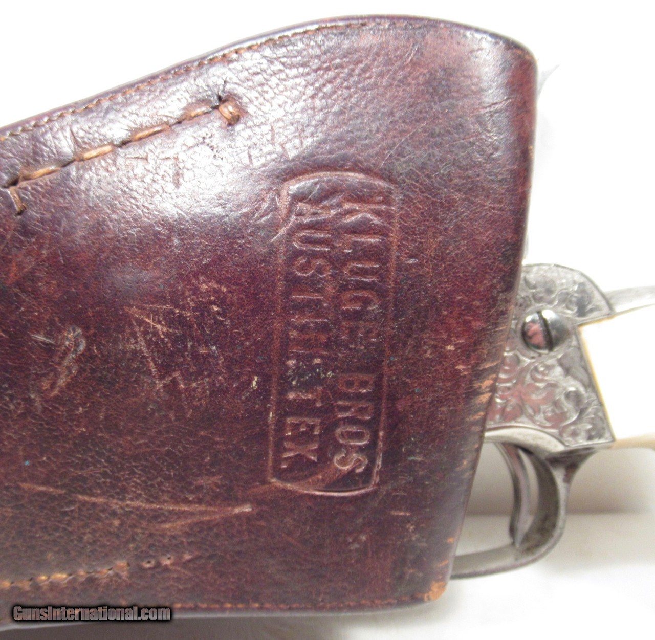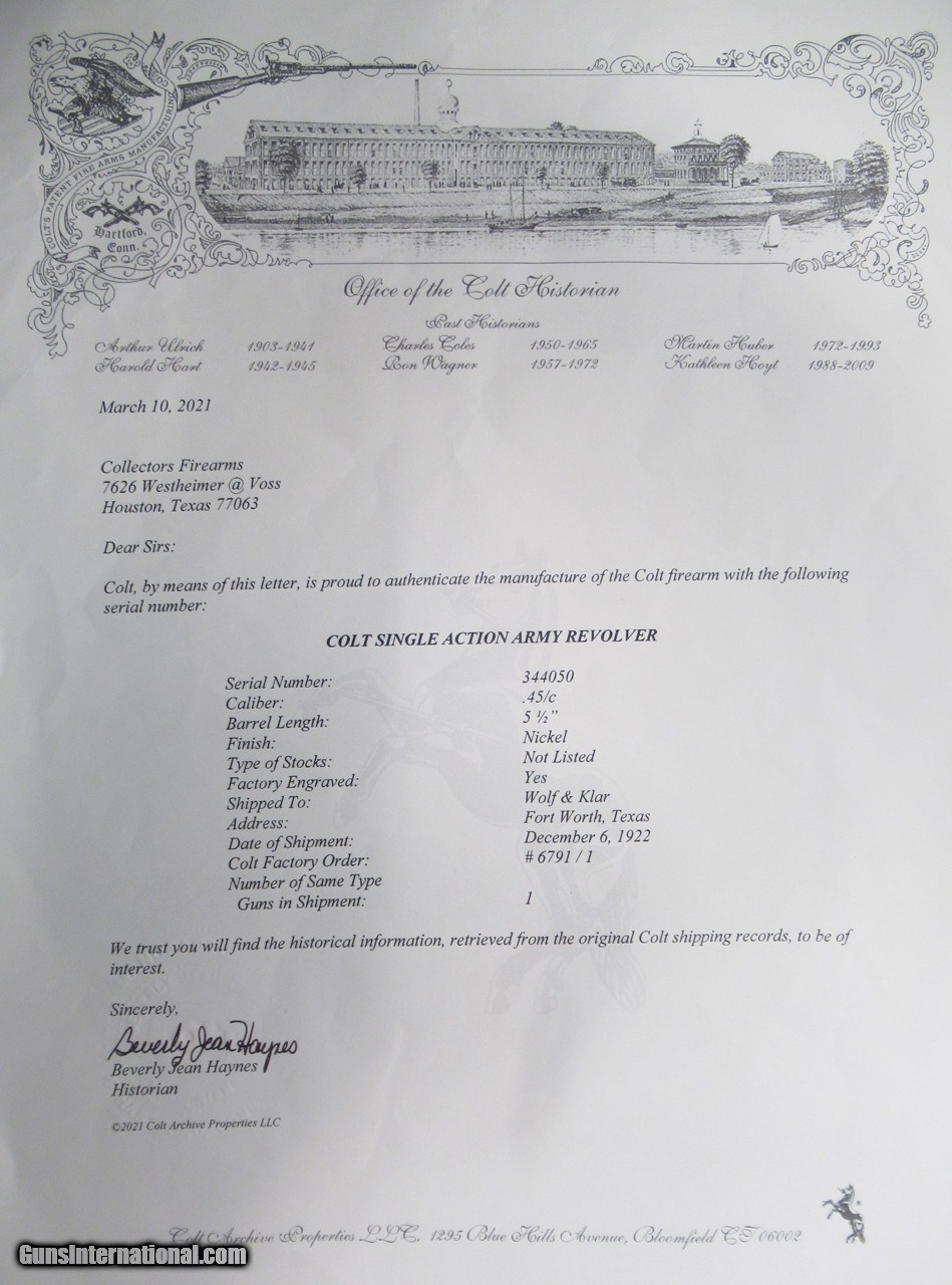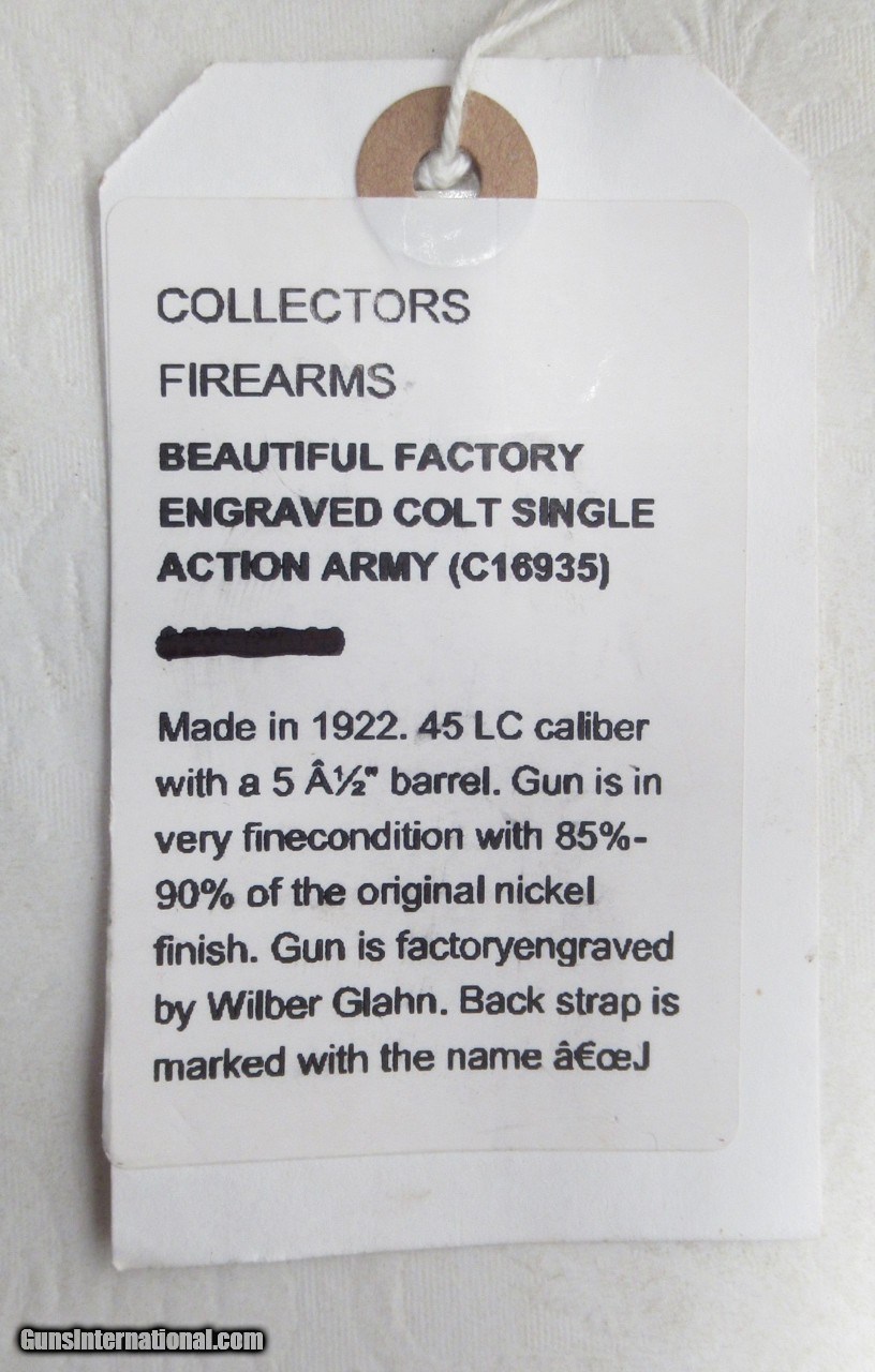 Description: Colt Single Action Army Revolver; Serial No. 344050; Per Included Factory Letter: .45 Caliber with 5 ½” Barrel and Nickel Finish; Factory Engraved and Shipped to Wolf & Klar of Fort Worth, Texas on December 6, 1922 in a One-Gun Shipment; Colt Factory Order #6791/1; Factory Engraved by Wilber Glahn; Most of the Original Nickel Finish Present; Beautiful Carved Steer-Head Motif Pearl Grips; “J.F. Gill” Marked on Backstrap; Per Info from Collectors Firearms, Gill was in the Horse Business in Texas; 100% Original and Matching; Perfect Action and Nice Bore with light even chattering; Very Nice Kluge Bros. of Austin, Texas Holster Included; Great 101 Year-Old Factory Engraved Texas Colt 45 Revolver; See All Photos for Condition; No Texts; Call (254)541-5765 or Email Only; PERSONAL PROPERTY of Harold Wieser; Price: $34,975 + $45 S&H Via USPS PRIORITY MAIL; Payment Address: Harold Wieser - 1466 U.S. Hwy 77 - Rosebud, TX 76570; SEND PAYMENTS VIA USPS PRIORITY MAIL; BEWARE of SCAMS!!! – DO NOT SEND MONEY or CORRESPONDENTS ELECTRONICALLY UNLESS YOU HAVE SPOKEN to HAROLD WIESER FIRST! 254-541-5765 SOLD Manufacturer: Colt Model: 1873 Serial Number: 344050 |