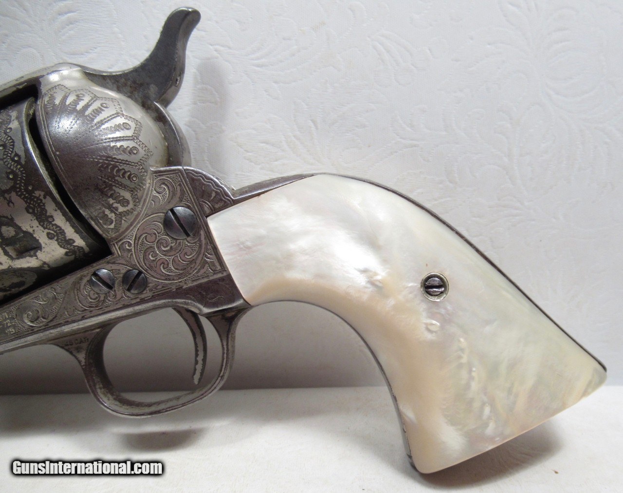 Description: Colt Single Action Army Revolver; Serial No. 127536; Per Included Factory Letter: Part of a 2 Gun Shipment to Colt Major Distributor Hartley & Graham of New York, NY on October 31, 1888; .45 Caliber with 4 ¾” Barrel, Nickel Finish, Rubber Grips, and Factory Engraved; Super Deluxe Engraving; Good Amount of Original Factory Nickel Finish Present; Very Nice Old Pearl Grips with 4 “Kill Notches” on Right Grip; Very Unusual Custom Front Sight; Perfect Action; Strong Bore with moderate even frosting; Some of the Best Deluxe Engraving I’ve Ever Seen; Great 135 Year-Old Factory Engraved Colt 45 Revolver; Bought this Old Gun in Waco, Texas Several Years Ago; See All Photos for Condition; No Texts; Call (254)541-5765 or Email Only; PERSONAL PROPERTY of Harold Wieser; NOTICE: We Do Not Do Any Consignments - All Items Listed are Owned by Us - NO SALES to New Jersey or New York City - Antiques Only to Massachusetts and California; Price: $39,975 + $45 S&H Via USPS PRIORITY MAIL; Payment Address: Harold Wieser - 1466 U.S. Hwy 77 - Rosebud, TX 76570; SEND PAYMENTS VIA USPS PRIORITY MAIL; BEWARE of SCAMS!!! – DO NOT SEND MONEY or CORRESPONDENTS ELECTRONICALLY UNLESS YOU HAVE SPOKEN to HAROLD WIESER FIRST! 254-541-5765 SOLD Antique: Yes Manufacturer: Colt Model: 1873 Serial Number: 127536 |