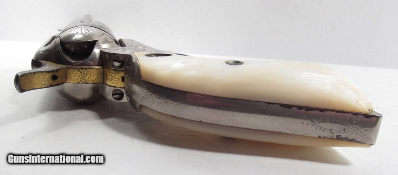 Description: Colt Single Action Army; Serial No. 325666; .45 Caliber; 5 ½” Barrel; Nickel Finish; Factory Engraved and Shipped to H&D Folsom Arms Company, New York, NY on December 24, 1912; Revolver Retains Most of Original Nickel Finish with Gold Gilded Cylinder, Hammer, Trigger, and Ejector Housing; Although Gold Trim is not listed I have Observed Several Guns with Gold Trim in that period Factory Engraved (CSA535); Most Gold Parts have loss of Finish; Really Nice Deep Dish Medallion Pearl Grips not listed on letter; See All Photos for Condition; No Texts; Call (254)541-5765 or Email Only (collectingtexashotmail); PERSONAL PROPERTY of Harold Wieser; Price: $34,975 + $45 S&H Via USPS PRIORITY MAIL; Payment Address: Harold Wieser - 1466 U.S. Hwy 77 - Rosebud, TX 76570; SEND PAYMENTS VIA USPS PRIORITY MAIL; SOLD Manufacturer: Colt Model: 1873 Serial Number: 325666 |