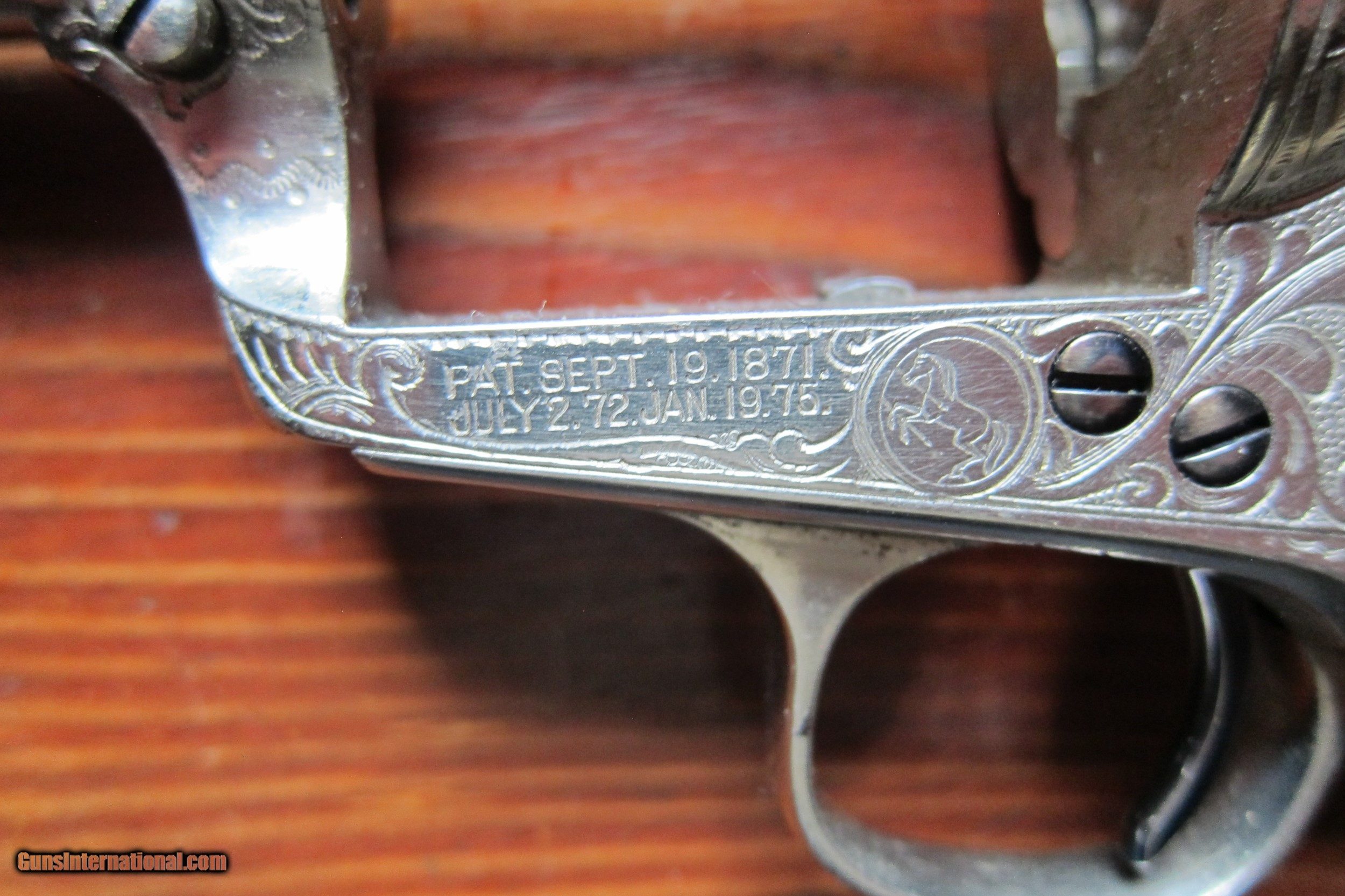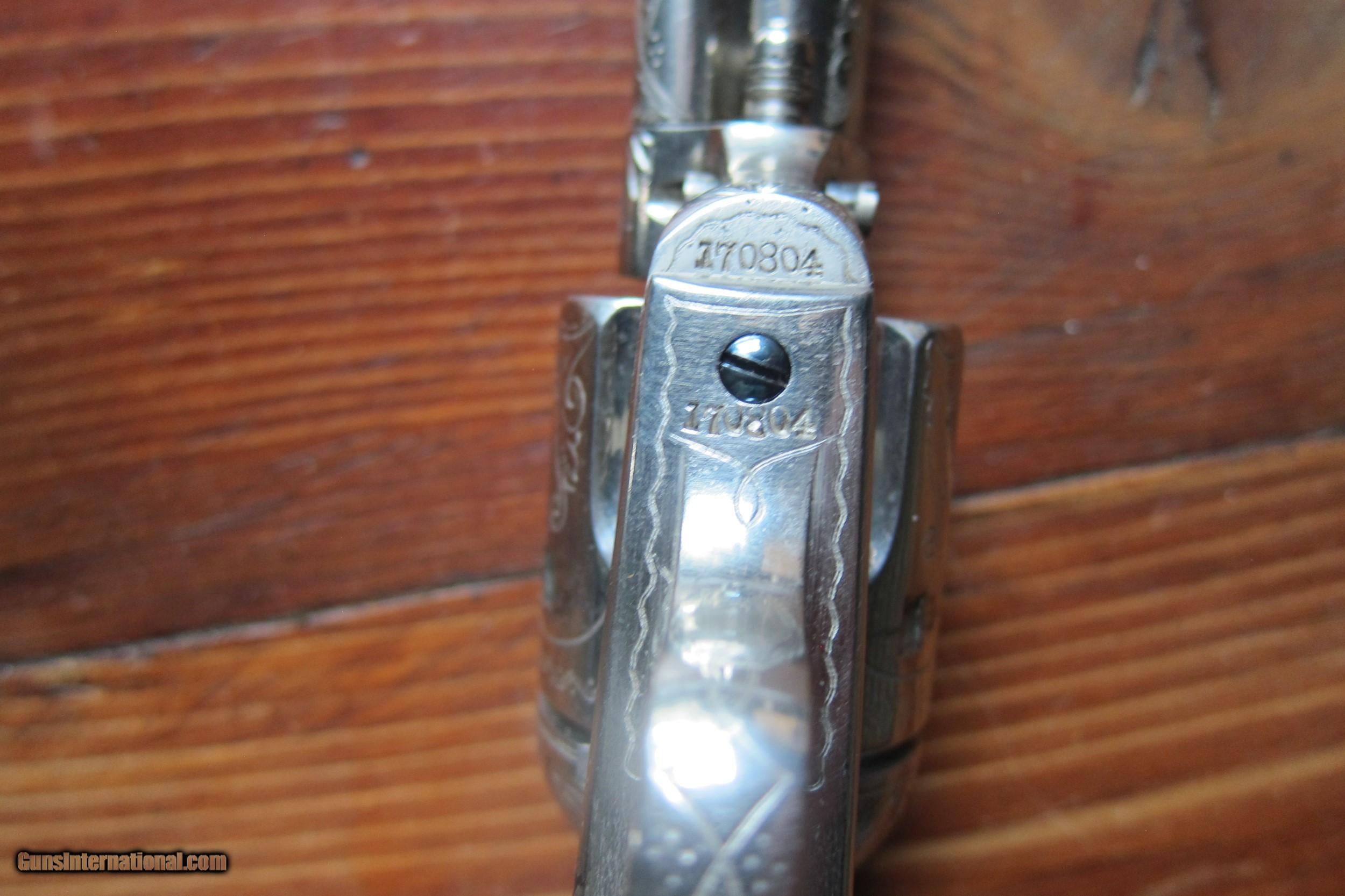 Description: Here's an interesting old Colt from the late 1800's that was sent in a single shipment to Sherman, Texas. As stated in its Colt letter it was nickel plated and engraved by the New York group headed by the world famous Cuno Helfricht. Whether he ever touched the pistol is open to question but certainly he oversaw the work and authorized its delivery under his name as most of these pistols were actually treated back then. As can be seen in the photographs some of the nickel plating has flaked slightly and worn in many places especially around the inner surfaces of the frame near the barrel. Most of this being due to the black powder being used at the time. There is also a well repaired crack in the right pearl grip. The bore has slight corrosion in the depths of the grooves but is otherwise bright and shiny. The action is smooth and way better than you see in most old Colts with the hammer notches being well preserved and functioning normally. The bore to cylinder line up is excellent in all chambers according to a bore scope. All the serial numbers match and the gun appears as is recorded in its letter. Being the only gun in the shipment to Texas in 1897 would always invite the question of who the actual buyer might have been. A careful investigation of the matter might be quite exciting and would be even more so if that person could be identified. Please take a look at the pictures and I thank you for your interest up to this point. Any questions I'll try and answer via email. SOLD Antique: Yes |