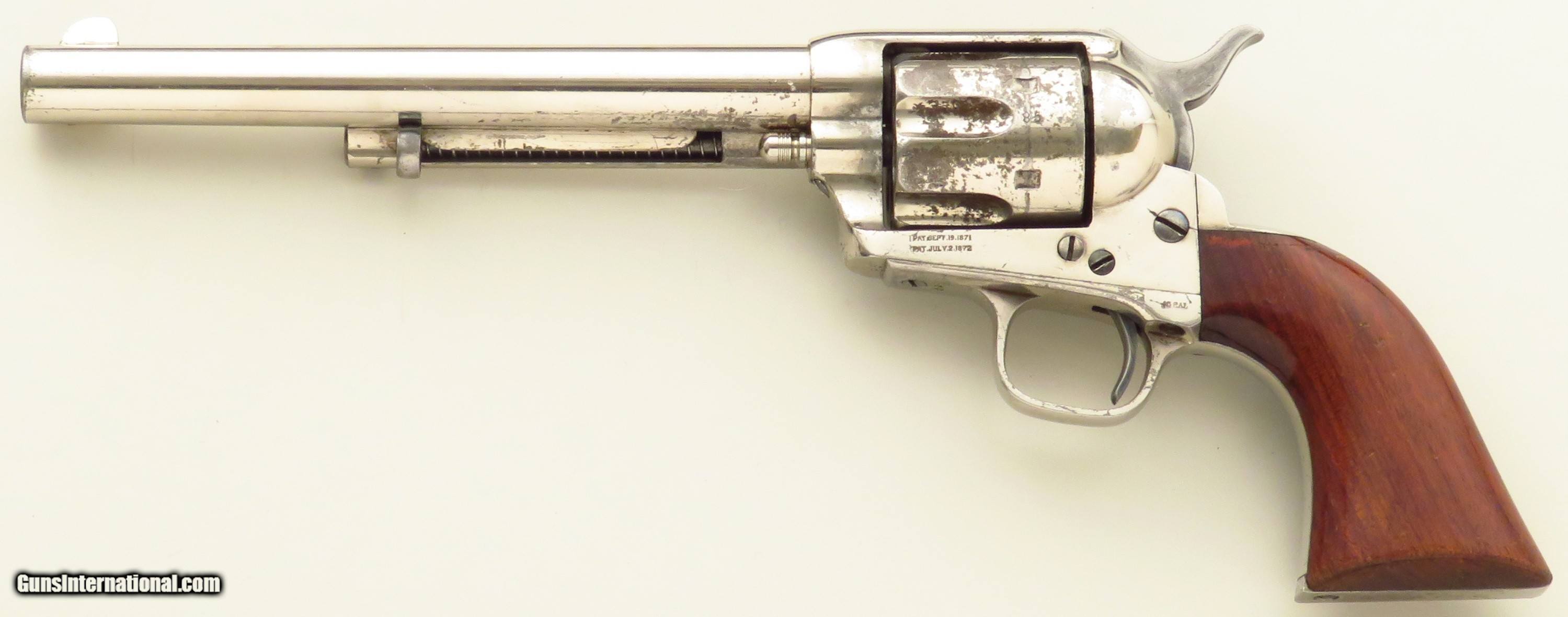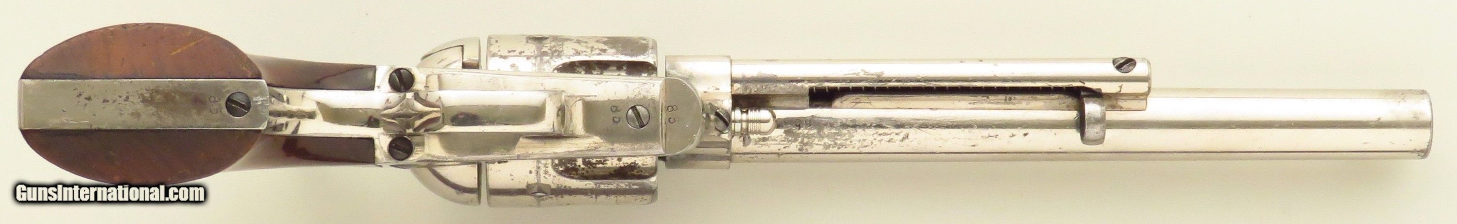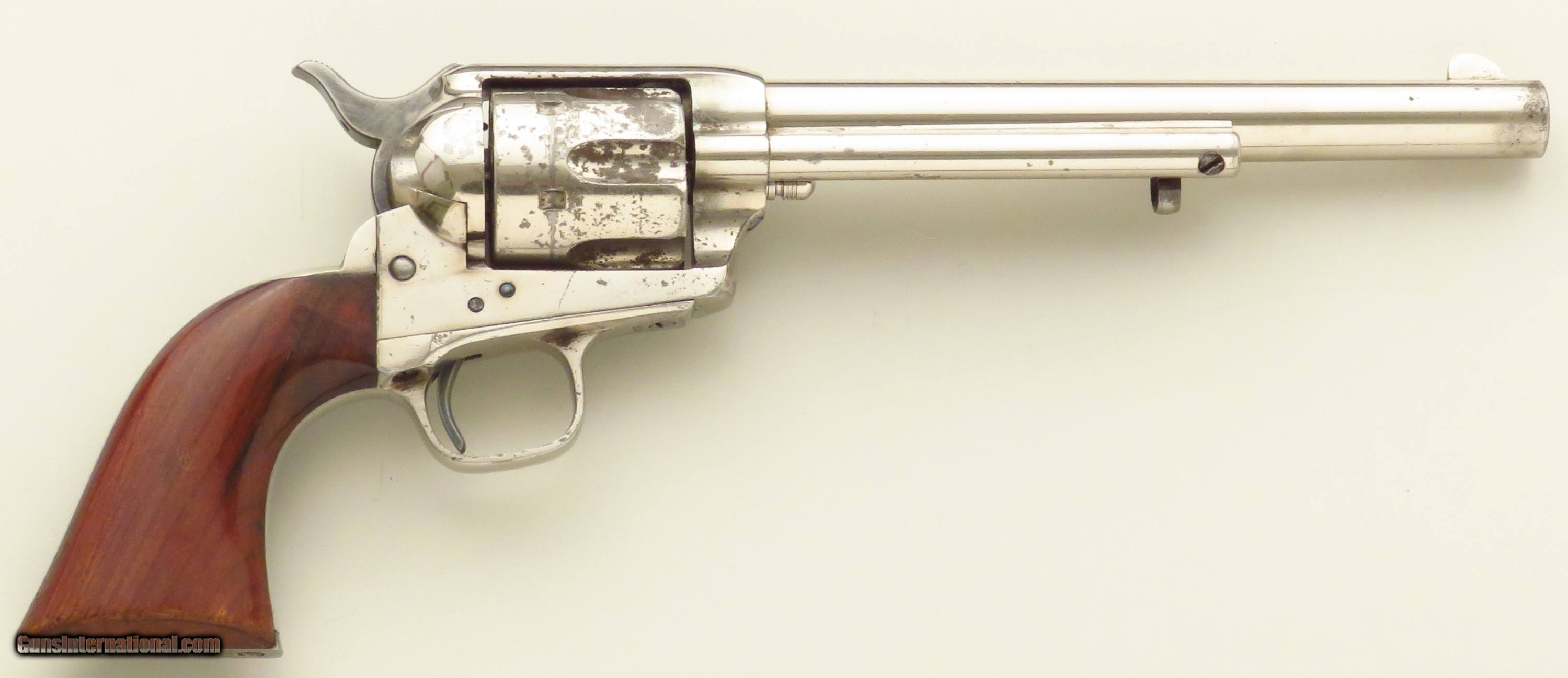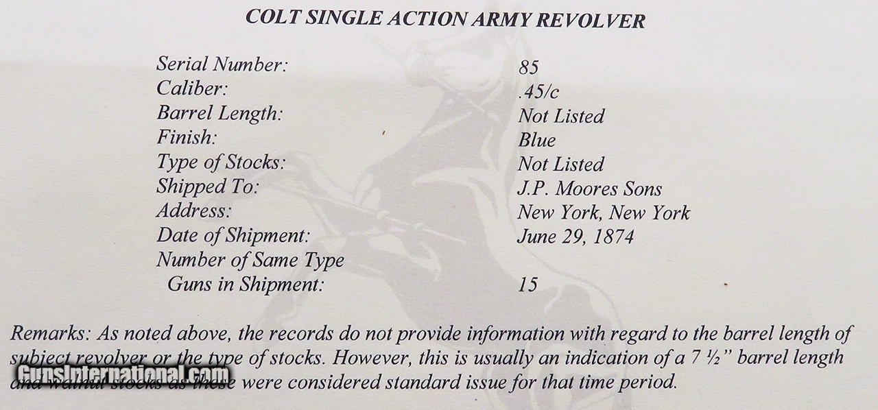 Colt pinch frame Single Action Army .45. Shipped in 1874, serial number 85 (5x; barrel, frame, guard, butt, cylinder) has a 7.5-inch barrel. Features include a single line address, checkered hammer spur and walnut grips. NICKEL FINISH: Noted Colt authority Richard “Dick” Burdick inspected this revolver. An associate from the collecting community with access to Burdick’s notes dictated the following entry - “85 pinched frame, 45, 7 ½, walnut, Adams Nickel Plated-Manufacturing Co. nickel plated revolvers for Colt until 1877, Adams used initial "P" on breech end of cyl, (K2 7*218*360, WP)”. CONDITION: The bore has moderate uniform roughness with viable rifling. Cylinder walls have areas of mild frosting. The cylinder pin has been replaced (portion of what is thought to be the original pin is included). Nickel plate is approximately 40 percent with significant flaking over the cylinder. The underside of the barrel shows finish distress. Grips are solid with general wear and varnish loss. LEATHER: The leather belt rig was stored with and properly fits the revolver. The tail is marked “45” and the length (farthest hole to center buckle) is 43 inches. Condition is good. INCLUSIONS: As imaged, the 1955 and 2025 factory letters, family history, copy of what is believed to be a photograph of William Carr Fryer, leather and partial cylinder pin are included. BACKGROUND & FAMILY HISTORY: According to family history provided by a great grandson, the Colt was purchased by William Carr Fryer (1841-1916) during 1874 in New York City and retained by the family thereafter. The executor of the estate (now 82) has known Fryer's great grandson since boyhood and clearly recalls mentions of the Colt from their early years together. Born in England, Fryer came to America with his family in 1849 and his father passed that same year in St. Louis. During his early teens, he left his family and hired on with wagon trains bound for San Francisco. In 1860, Fryer became a Pony Express rider and, after it disbanded, worked for Wells Fargo Stage Lines, operated a meat packing plant and later worked for the Northern Pacific Railroad. In 1884, Fryer began ranching near Springdale, Montana on Fryer Creek. Retiring in 1910, he moved to Livingston, Montana where he passed in 1916. William Carr Fryer’s son, John, moved to Livingston, Montana with his father in 1910 and joined the Sax & McCue Store which later became the Sax & Fryer Company. John eventually became Mayor of Livingston. The Colt has been stored in a safety deposit box in Livingston for many years. Copies of the family history as provided by the estate are included. Additional photos can be viewed at sportsmanslegacy or will be sent upon request. The price is firm and layaway is available. $75,000 plus shipping.
