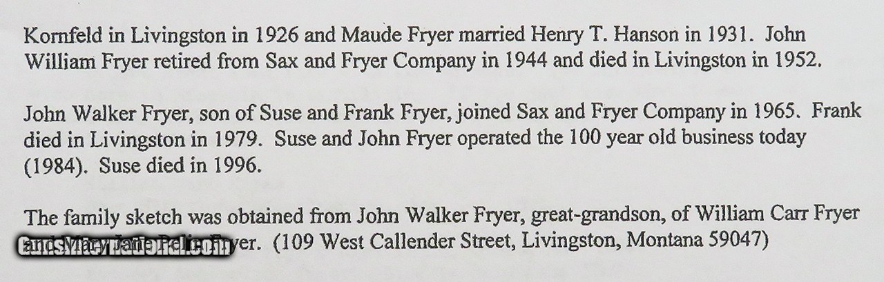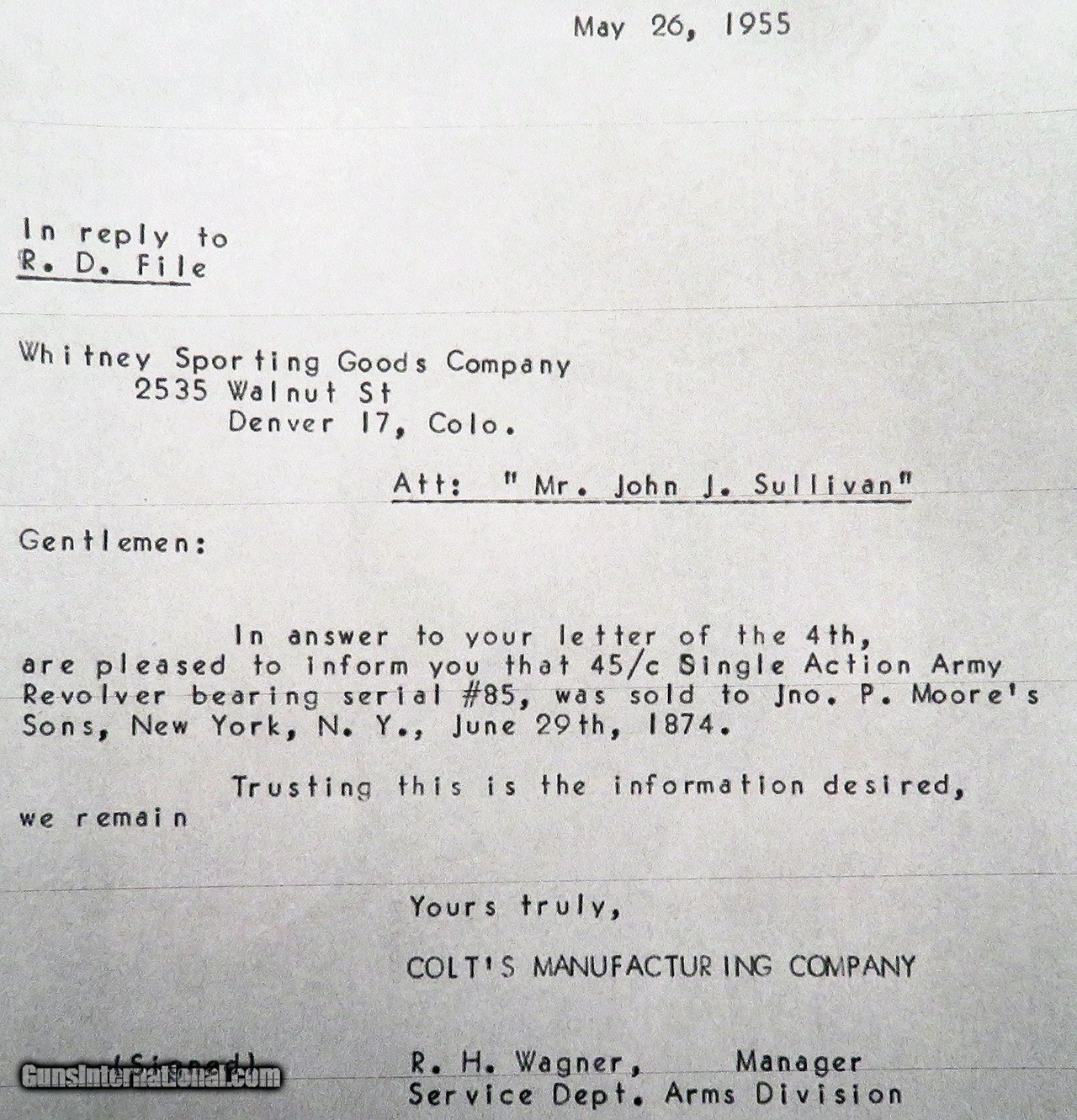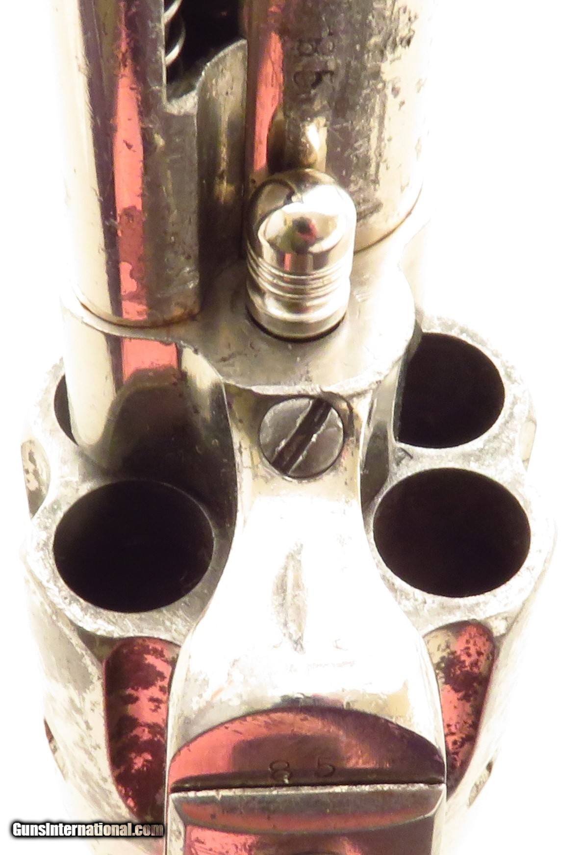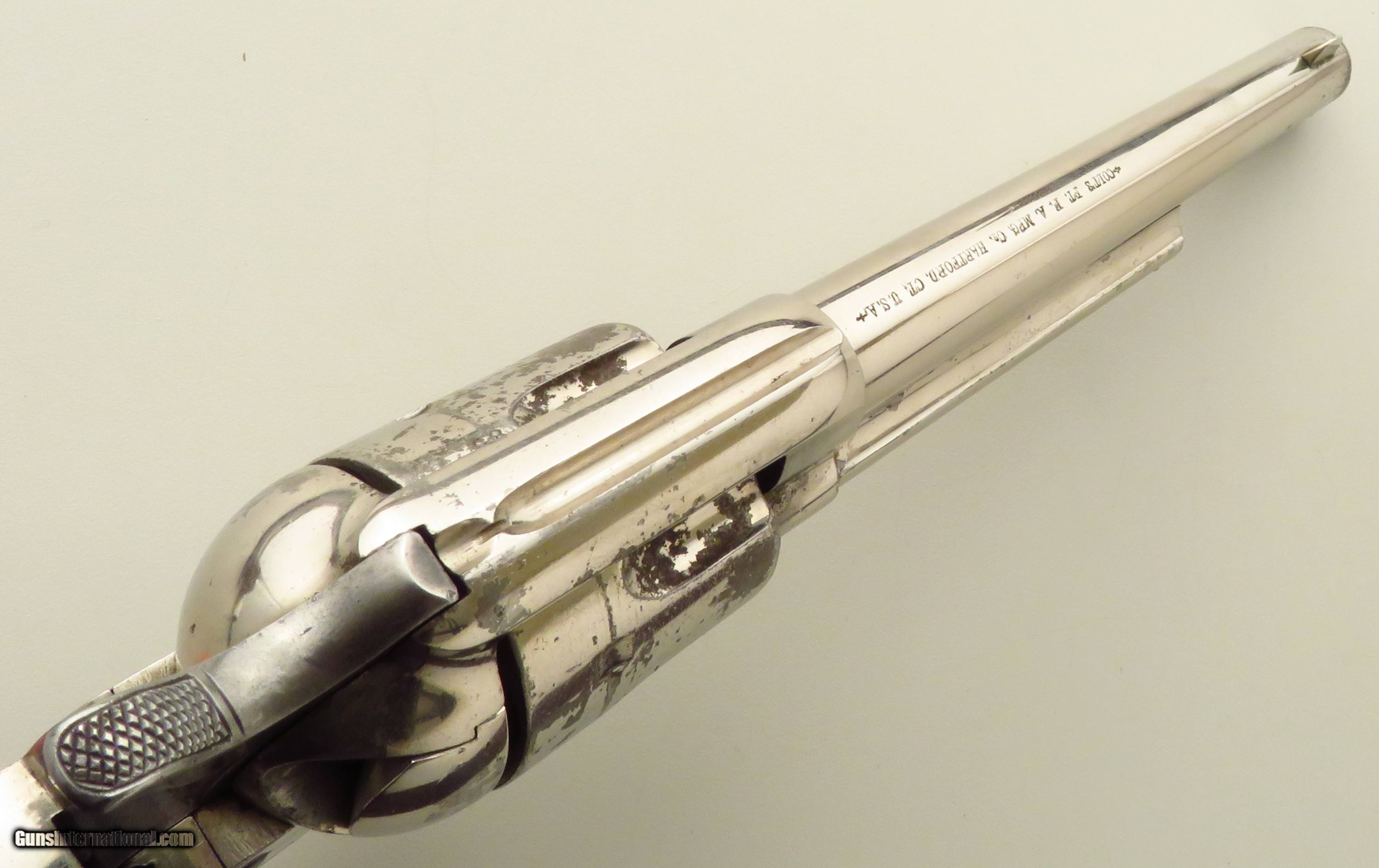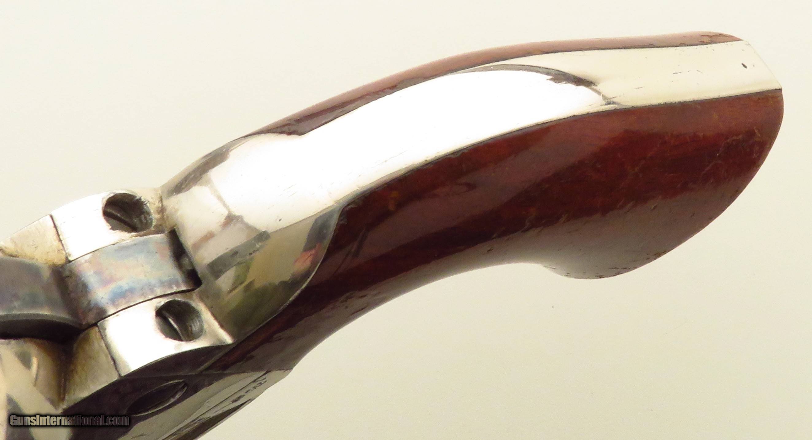 Colt pinch frame Single Action Army .45. Shipped in 1874, serial number 85 (5x; barrel, frame, guard, butt, cylinder) has a 7.5-inch barrel. Features include a single line address, checkered hammer spur and walnut grips. NICKEL FINISH: Noted Colt authority Richard “Dick” Burdick inspected this revolver. An associate from the collecting community with access to Burdick’s notes dictated the following entry - “85 pinched frame, 45, 7 ½, walnut, Adams Nickel Plated-Manufacturing Co. nickel plated revolvers for Colt until 1877, Adams used initial "P" on breech end of cyl, (K2 7*218*360, WP)”. CONDITION: The bore has moderate uniform roughness with viable rifling. Cylinder walls have areas of mild frosting. The cylinder pin has been replaced (portion of what is thought to be the original pin is included). Nickel plate is approximately 40 percent with significant flaking over the cylinder. The underside of the barrel shows finish distress. Grips are solid with general wear and varnish loss. LEATHER: The leather belt rig was stored with and properly fits the revolver. The tail is marked “45” and the length (farthest hole to center buckle) is 43 inches. Condition is good. INCLUSIONS: As imaged, the 1955 and 2025 factory letters, family history, copy of what is believed to be a photograph of William Carr Fryer, leather and partial cylinder pin are included. BACKGROUND & FAMILY HISTORY: According to family history provided by a great grandson, the Colt was purchased by William Carr Fryer (1841-1916) during 1874 in New York City and retained by the family thereafter. The executor of the estate (now 82) has known Fryer's great grandson since boyhood and clearly recalls mentions of the Colt from their early years together. Born in England, Fryer came to America with his family in 1849 and his father passed that same year in St. Louis. During his early teens, he left his family and hired on with wagon trains bound for San Francisco. In 1860, Fryer became a Pony Express rider and, after it disbanded, worked for Wells Fargo Stage Lines, operated a meat packing plant and later worked for the Northern Pacific Railroad. In 1884, Fryer began ranching near Springdale, Montana on Fryer Creek. Retiring in 1910, he moved to Livingston, Montana where he passed in 1916. William Carr Fryer’s son, John, moved to Livingston, Montana with his father in 1910 and joined the Sax & McCue Store which later became the Sax & Fryer Company. John eventually became Mayor of Livingston. The Colt has been stored in a safety deposit box in Livingston for many years. Copies of the family history as provided by the estate are included. Additional photos can be viewed at sportsmanslegacy or will be sent upon request. The price is firm and layaway is available. $75,000 plus shipping.