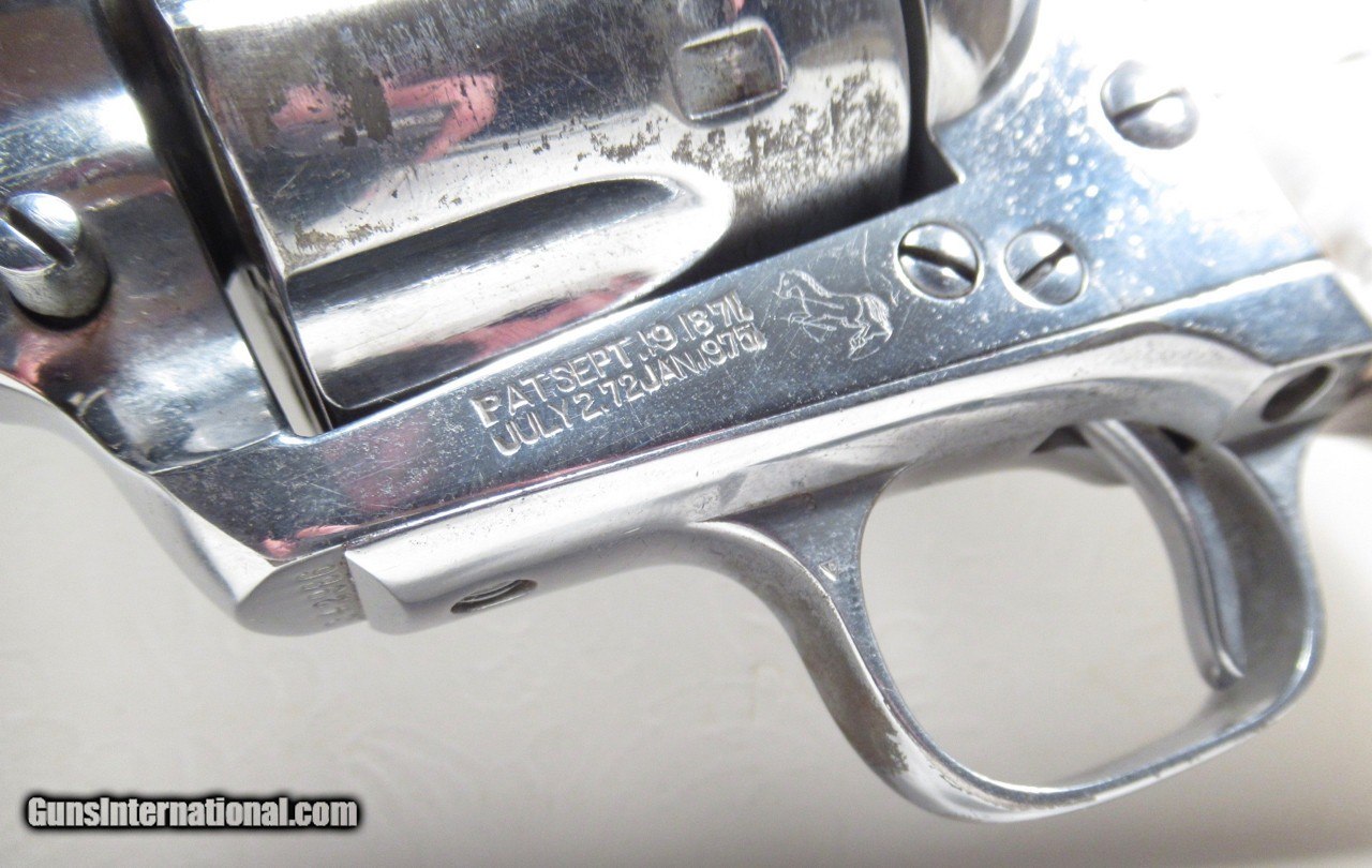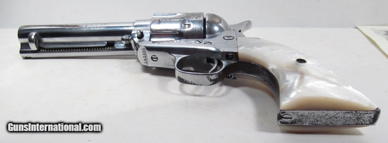 Description: Colt Single Action Army; Serial No. 342986; Made 1922; Per Factory Letter Included: .44/40 Caliber with 4 ¾” Barrel and Blue Finish; Shipped to Stauffer Eshleman & Company of New Orleans, Louisiana on June 20, 1922 as Part of a 3 Gun Shipment; Gun Re-Finished in Nickel Long Ago with Most of Re-Finished Nickel Present; Undersized Pearl Grips; Perfect Action with Tight Lock-Up; Excellent Strong Bore; Great 100 Year-Old Colt 44-40 Shooter; All Numbers Match; See All Photos for Condition; No Texts; Call (254)541-5765 or Email Only; PERSONAL PROPERTY of Harold Wieser; Price: $2,475 + $45 S&H Via USPS PRIORITY MAIL; Payment Address: Harold Wieser - 1466 U.S. Hwy 77 - Rosebud, TX 76570; SEND PAYMENTS VIA USPS PRIORITY MAIL; BEWARE of SCAMS!!! – DO NOT SEND MONEY or CORRESPONDENTS ELECTRONICALLY UNLESS YOU HAVE SPOKEN to HAROLD WIESER FIRST! 254-541-5765 SOLD Manufacturer: Colt Model: 1873 Serial Number: 342986 |