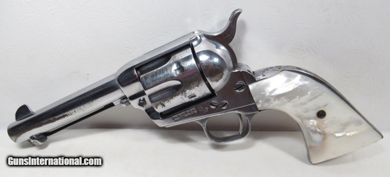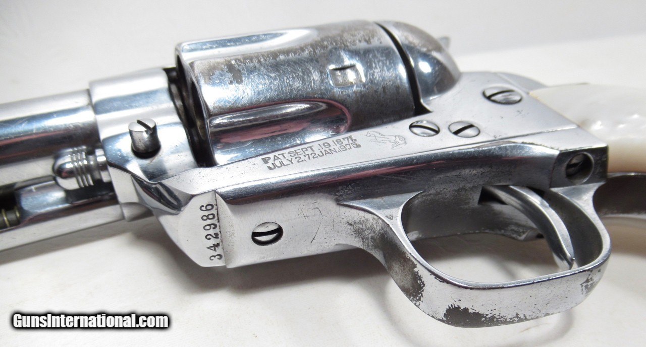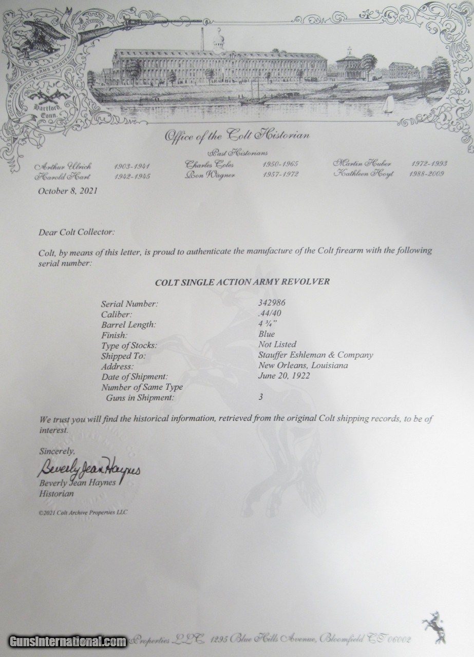Description: Colt Single Action Army; Serial No. 342986; Made 1922; Per Factory Letter Included: .44/40 Caliber with 4 ¾” Barrel and Blue Finish; Shipped to Stauffer Eshleman & Company of New Orleans, Louisiana on June 20, 1922 as Part of a 3 Gun Shipment; Gun Re-Finished in Nickel Long Ago with Most of Re-Finished Nickel Present; Undersized Pearl Grips; Perfect Action with Tight Lock-Up; Excellent Strong Bore; Great 100 Year-Old Colt 44-40 Shooter; All Numbers Match; See All Photos for Condition; No Texts; Call (254)541-5765 or Email Only; PERSONAL PROPERTY of Harold Wieser; Price: $2,475 + $45 S&H Via USPS PRIORITY MAIL; Payment Address: Harold Wieser - 1466 U.S. Hwy 77 - Rosebud, TX 76570; SEND PAYMENTS VIA USPS PRIORITY MAIL; BEWARE of SCAMS!!! – DO NOT SEND MONEY or CORRESPONDENTS ELECTRONICALLY UNLESS YOU HAVE SPOKEN to HAROLD WIESER FIRST! 254-541-5765 SOLD Manufacturer: Colt Model: 1 Serial Number: 342986 |