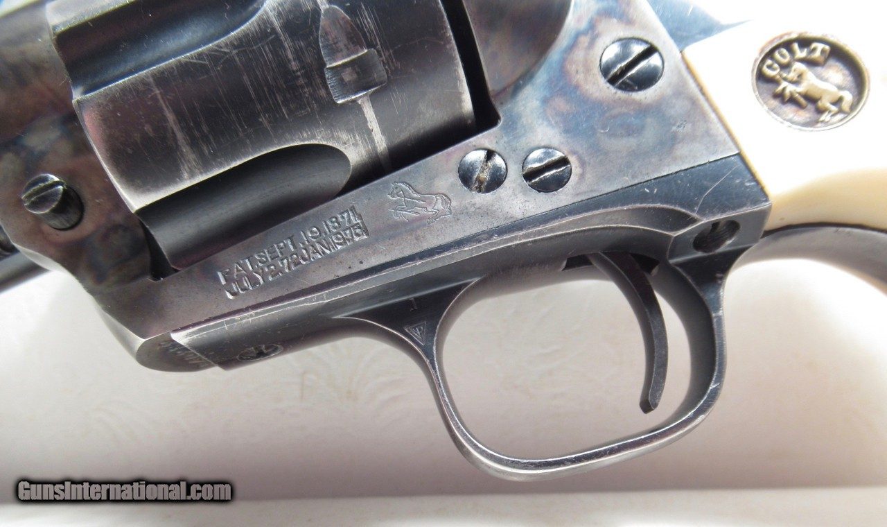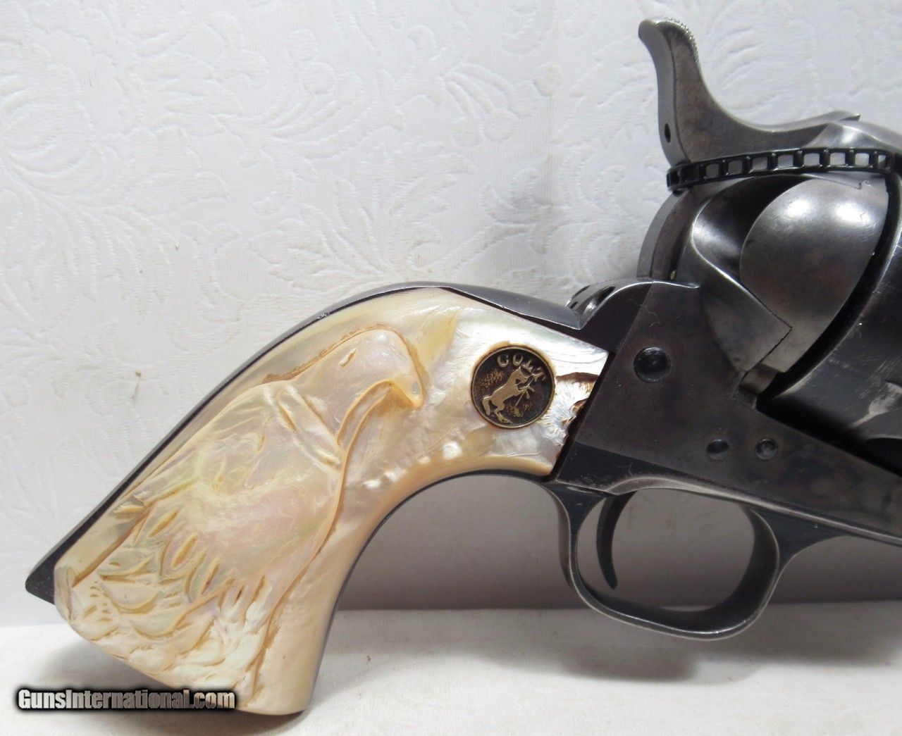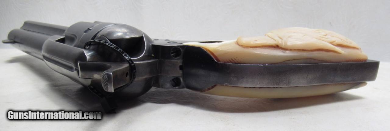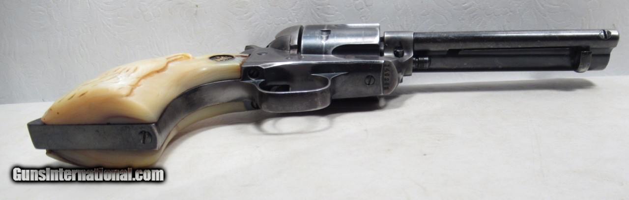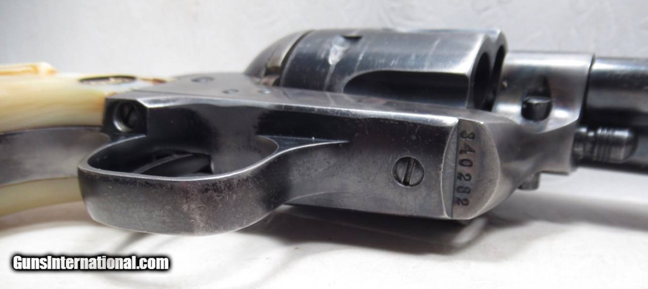 Description: Colt Single Action Army Revolver; Serial No. 340282; Per Included Factory Letter: 44/40 Caliber with 4 ¾” Barrel and Blue Finish; Part of a Two Gun Shipment; Shipped to A. Steinfeld and Company of Tucson, Arizona on July 14, 1920; All Matching Numbers; Nearly All of the Original Metal Finish Remains; Deep Dish Colt Medallion Pearl Grips with Carved Eagle Motif; Repair on Left Grip Panel and minor chips on Carved Panel; Perfect Action and Perfect Bore; Really Nice Tucson, Arizona Shipped 103 Year-Old Colt 44/40 Revolver; See All Photos for Condition; No Texts; Call (254)541-5765 or Email Only; PERSONAL PROPERTY of Harold Wieser; NOTICE: We Do Not Do Any Consignments - All Items Listed are Owned by Us - NO SALES to New Jersey or New York City - Antiques Only to Massachusetts and California; Price: $10,975 + $45 S&H Via USPS PRIORITY MAIL; Payment Address: Harold Wieser - 1466 U.S. Hwy 77 - Rosebud, TX 76570; SEND PAYMENTS VIA USPS PRIORITY MAIL; BEWARE of SCAMS!!! – DO NOT SEND MONEY or CORRESPONDENTS ELECTRONICALLY UNLESS YOU HAVE SPOKEN to HAROLD WIESER FIRST! 254-541-5765 SOLD Manufacturer: Colt Model: 1873 Serial Number: 340282 |