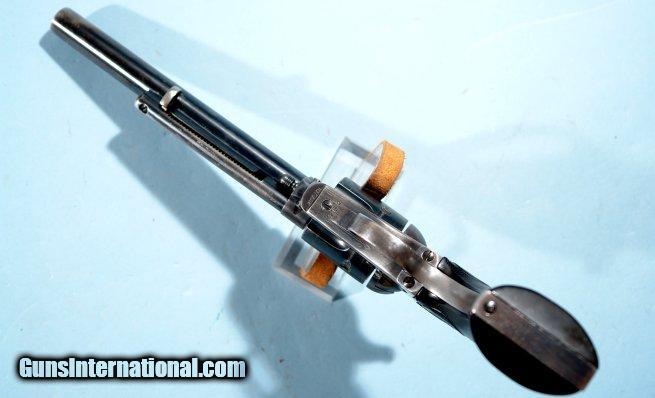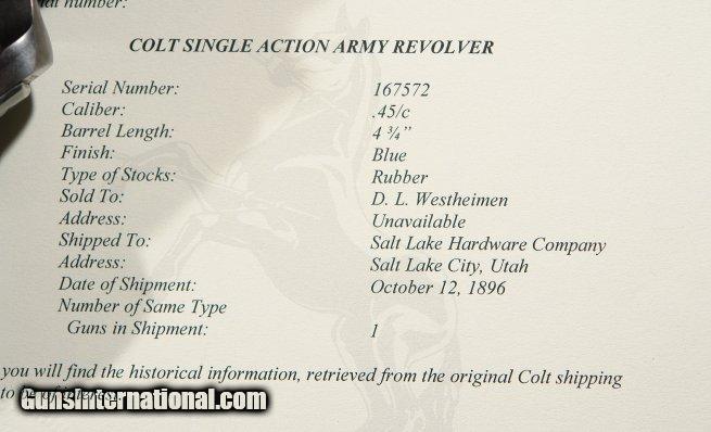 Description: INSCRIBED COLT SINGLE ACTION 1ST GENERATION .45 LC CAL. ARMY REVOLVER CA. 1896 W/ UTAH FACTORY LETTER. Very fine overall with 90% original and traces of case colors with balance turned deep grey. Excellent bore and perfect working order. Original grips in fine condition. Back strap professionally engraved “CHOCTAW”. Letter says ordered by D.L. Westheimen and shipped to Salt Lake Hardware in Salt Lake City, Utah Oct. 12. 1896 originally as a blue 4 ¾” and is now 7 ½” same period factory barrel. Very nice antique serial number shipped out west to Utah. Reasonably priced. SOLD Antique: Yes |