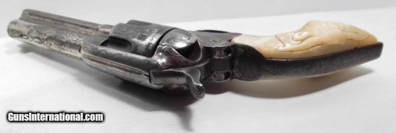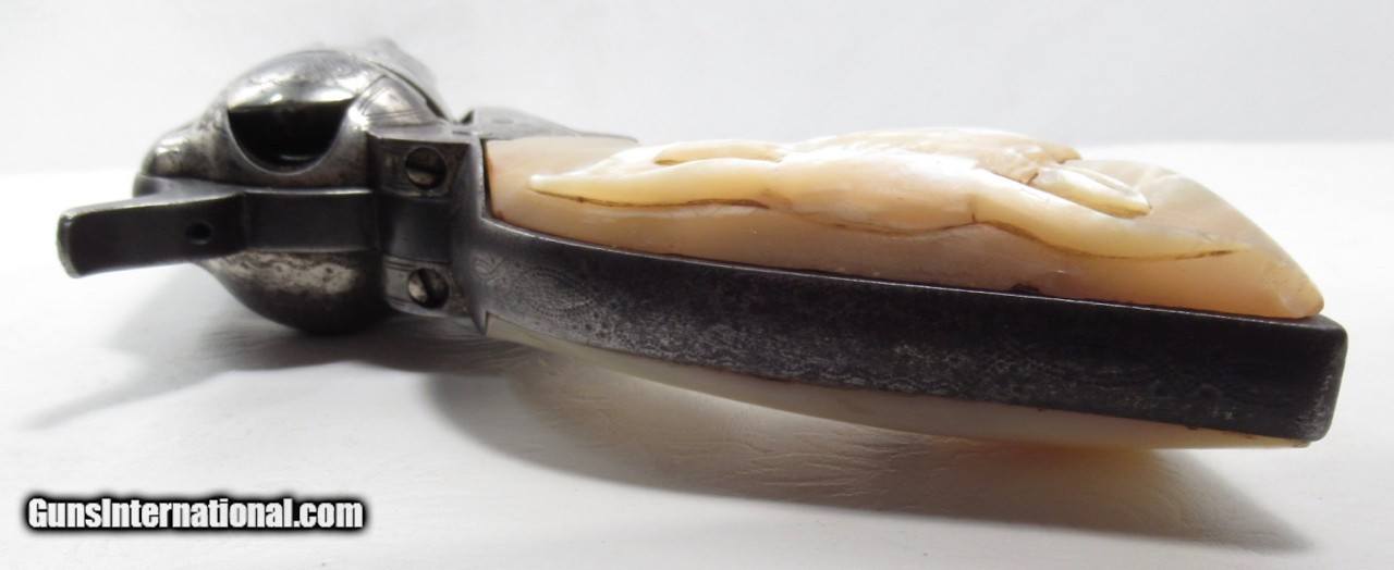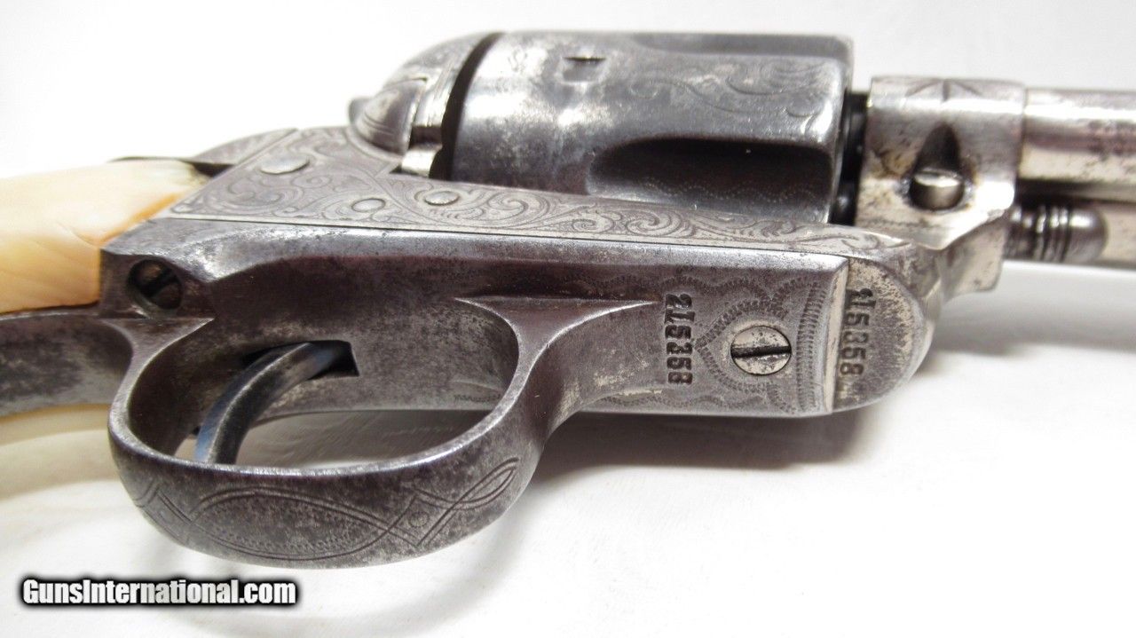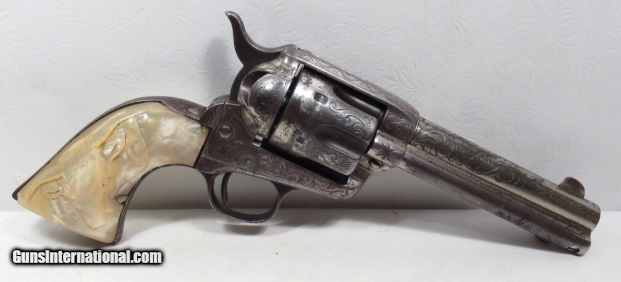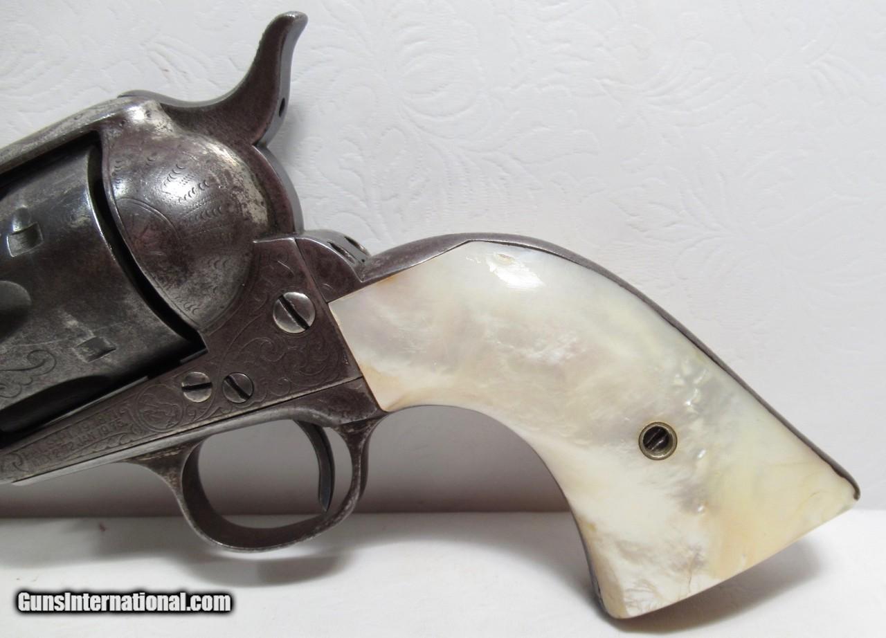 Description: Colt Single Action Army; Serial No. 215358; Per Included Factory Letter - .45 Caliber, 4 ¾” Barrel, Nickel Finish, Factory Engraved, Shipped to J.F. Schmelzer & Sons c/o S. Hirschfeld of Kansas City, Kansas on November 1, 1901; Decent Amount of Factory Nickel Remains; Gold Gilt Cylinder has only traces of Gold on ratchet on back of cylinder; Old Carved Pearl Grips with Steer Head Motif; Perfect Action; Very Strong Bore but lightly even pitting in bore; Great 120 Year-Old Cowboy Colt 45; See All Photos for Condition; No Texts; Call (254)541-5765 or Email Only; PERSONAL PROPERTY of Harold Wieser; Price: $18,975 + $45 S&H Via USPS PRIORITY MAIL; Payment Address: Harold Wieser - 1466 U.S. Hwy 77 - Rosebud, TX 76570; SEND PAYMENTS VIA USPS PRIORITY MAIL; BEWARE of SCAMS!!! – DO NOT SEND MONEY or CORRESPONDENTS ELECTRONICALLY UNLESS YOU HAVE SPOKEN to HAROLD WIESER FIRST! 254-541-5765 SOLD Manufacturer: Colt Model: 1873 Serial Number: 215358 |