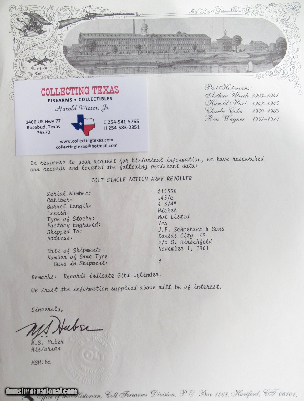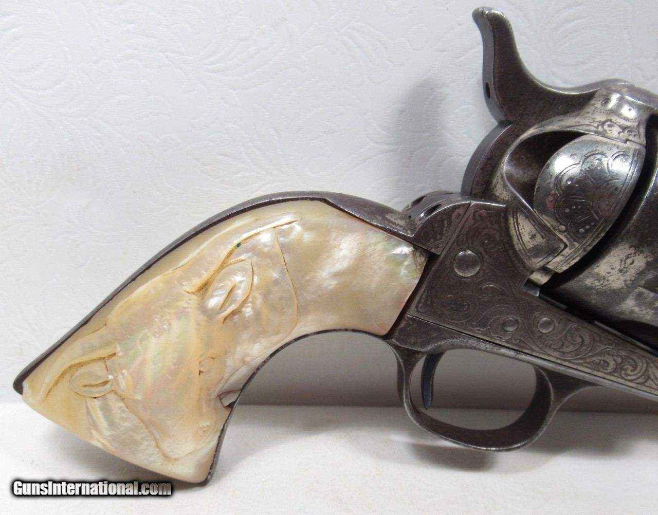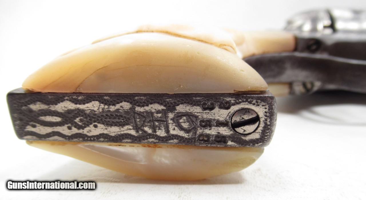 Description: Colt Single Action Army; Serial No. 215358; Per Included Factory Letter - .45 Caliber, 4 ¾” Barrel, Nickel Finish, Factory Engraved, Shipped to J.F. Schmelzer & Sons c/o S. Hirschfeld of Kansas City, Kansas on November 1, 1901; Decent Amount of Factory Nickel Remains; Gold Gilt Cylinder has only traces of Gold on ratchet on back of cylinder; Old Carved Pearl Grips with Steer Head Motif; Perfect Action; Very Strong Bore but lightly even pitting in bore; Great 120 Year-Old Cowboy Colt 45; See All Photos for Condition; No Texts; Call (254)541-5765 or Email Only; PERSONAL PROPERTY of Harold Wieser; Price: $19,975 + $45 S&H Via USPS PRIORITY MAIL; Payment Address: Harold Wieser - 1466 U.S. Hwy 77 - Rosebud, TX 76570; SEND PAYMENTS VIA USPS PRIORITY MAIL; BEWARE of SCAMS!!! – DO NOT SEND MONEY or CORRESPONDENTS ELECTRONICALLY UNLESS YOU HAVE SPOKEN to HAROLD WIESER FIRST! 254-541-5765 SOLD Manufacturer: Colt Model: 1873 Serial Number: 215358 |
