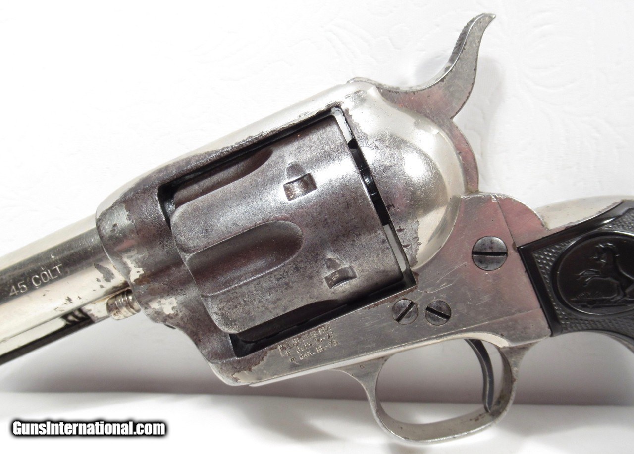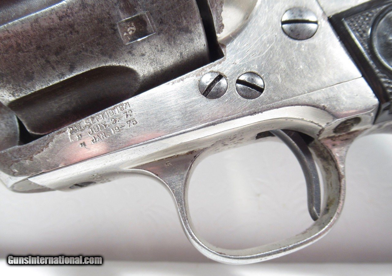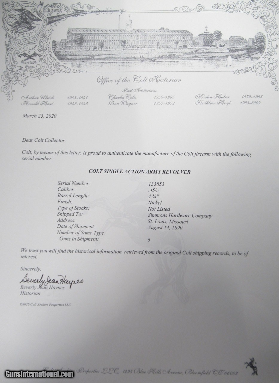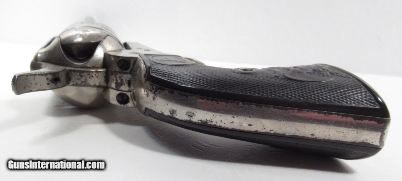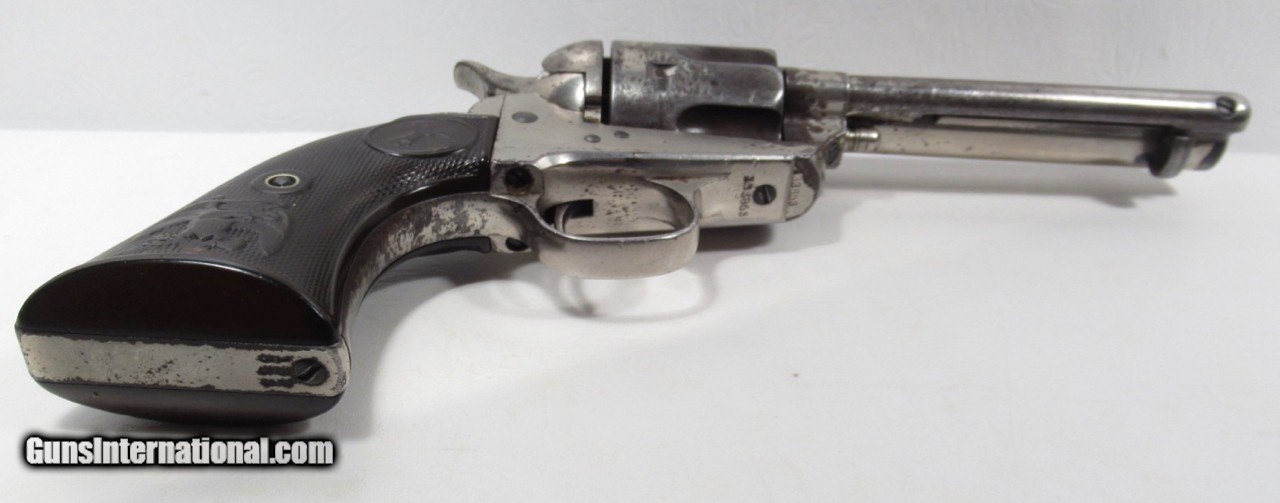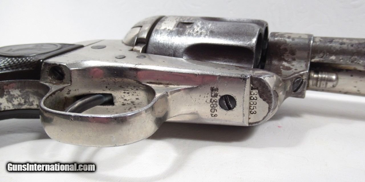 Description: Colt Single Action Army Revolver; Serial No. 133853; 45 Cal. with 4 ¾” Barrel and Nickel Finish; Shipped to Colt Distributor Simmons Hardware, St. Louis, Missouri on April 14, 1890; All Matching Numbers and 100% Correct and Original; Good Amount of Original Nickel Present; Good Original Colt Hard Rubber Eagle Grips; PERFECT ACTION and Very Strong Bore with moderate frosting; Really Good 131 Year-Old Colt out of New Mexico; See All Photos for Condition; No Texts; Call (254)541-5765 or Email Only; PERSONAL PROPERTY of Harold Wieser; Price: $4,975 + $45 S&H Via USPS PRIORITY MAIL; Payment Address: Harold Wieser - 1466 U.S. Hwy 77 - Rosebud, TX 76570; SEND PAYMENTS VIA USPS PRIORITY MAIL; BEWARE of SCAMS!!! – DO NOT SEND MONEY or CORRESPONDENTS ELECTRONICALLY UNLESS YOU HAVE SPOKEN to HAROLD WIESER FIRST! 254-541-5765 SOLD Antique: Yes Manufacturer: Colt Model: 1873 Serial Number: 133853 |