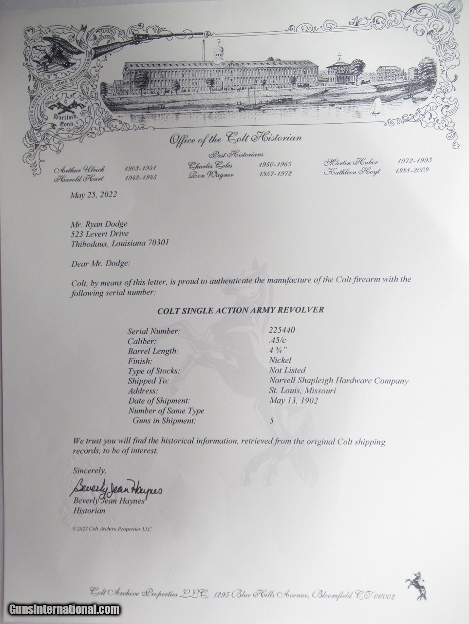 Description: Colt Single Action Army Revolver; Serial No. 225440; Per Included Factory Letter: .45 Caliber with 4 ¾” Barrel and Nickel Finish; Shipped to Norvell Shapleigh Hardware Company of St. Louis, Missouri on May 13, 1902 as Part of a 5 Gun Shipment; Nice Old Jig Bone Grips; Most of the Original Nickel Finish Remains; Perfect Action and Strong Shiny Bore; Great 121 Year-Old Colt 45 Revolver; See All Photos for Condition; No Texts; Call (254)541-5765 or Email Only; PERSONAL PROPERTY of Harold Wieser; Price: $4,975 + $45 S&H Via USPS PRIORITY MAIL; Payment Address: Harold Wieser - 1466 U.S. Hwy 77 - Rosebud, TX 76570; SEND PAYMENTS VIA USPS PRIORITY MAIL; BEWARE of SCAMS!!! – DO NOT SEND MONEY or CORRESPONDENTS ELECTRONICALLY UNLESS YOU HAVE SPOKEN to HAROLD WIESER FIRST! 254-541-5765 SOLD Curio/Relic: Yes Manufacturer: Colt Model: 1873 Serial Number: 225440 |