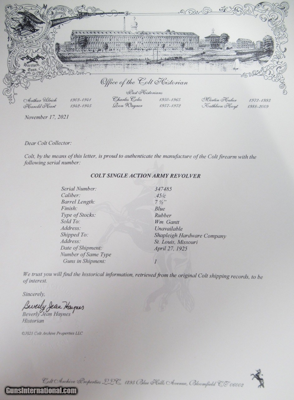 Description: Colt Single Action Army; Serial No. 347485; High Finish Colt SAA 45 with 7 ½” Barrel; One Gun Shipment to Shapleigh Hardware on April 7, 1925 for W.M. Gantt; This Revolver was Found in Arkansas; William Gantt Owned Gant Mercantile of Magnolia, Arkansas 1920 – 1940 as Per U.S. Census; This Colt has All Matching Numbers Including Excellent Numbered Colt Hard Rubber Grips; Lots of Metal Finish Present; PERFECT ACTION, BORE, SCREWS, and Full Front Sight; Really Nice 96 Year-Old Colt SAA with Arkansas History; See All Photos for Condition; No Texts; Call (254)541-5765 or Email Only; PERSONAL PROPERTY of Harold Wieser; Price: $5,975 + $45 S&H Via USPS PRIORITY MAIL; Payment Address: Harold Wieser - 1466 U.S. Hwy 77 - Rosebud, TX 76570; SEND PAYMENTS VIA USPS PRIORITY MAIL; BEWARE of SCAMS!!! – DO NOT SEND MONEY or CORRESPONDENTS ELECTRONICALLY UNLESS YOU HAVE SPOKEN to HAROLD WIESER FIRST! 254-541-5765 SOLD Manufacturer: Colt Model: 1873 Serial Number: 347485 |