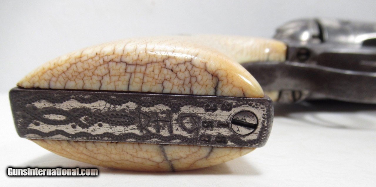 Description: Colt Single Action Army; Serial No. 215358; .45 Caliber; 4 ¾” Barrel; Factory Engraved; Nickel with Gild Cylinder; Shipped to J.F. Schmelzer & Sons in Kansas City, Kansas on November 1, 1901; Fair Amount of Original Nickel Finish Remains; Traces of Gold on Back of Cylinder; Nice Old Ivory Grips; PERFECT ACTION; Fairly Strong Bore with even heavy frosting; Good 120 Year-Old Fancy Kansas Cowboy Colt Revolver; See All Photos for Condition; No Texts; Call (254)541-5765 or Email Only; PERSONAL PROPERTY of Harold Wieser; Price: $19,000 + $45 S&H Via USPS PRIORITY MAIL; Payment Address: Harold Wieser - 1466 U.S. Hwy 77 - Rosebud, TX 76570; SEND PAYMENTS VIA USPS PRIORITY MAIL; SOLD Manufacturer: Colt Model: 1873 Serial Number: 215358 |